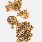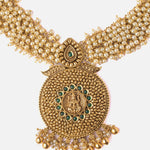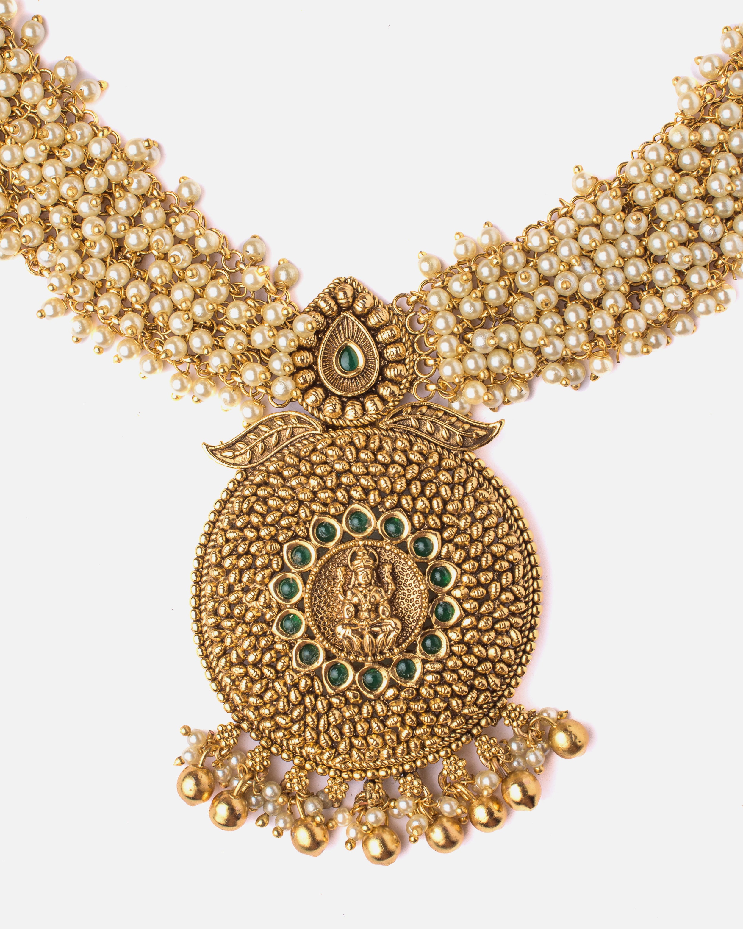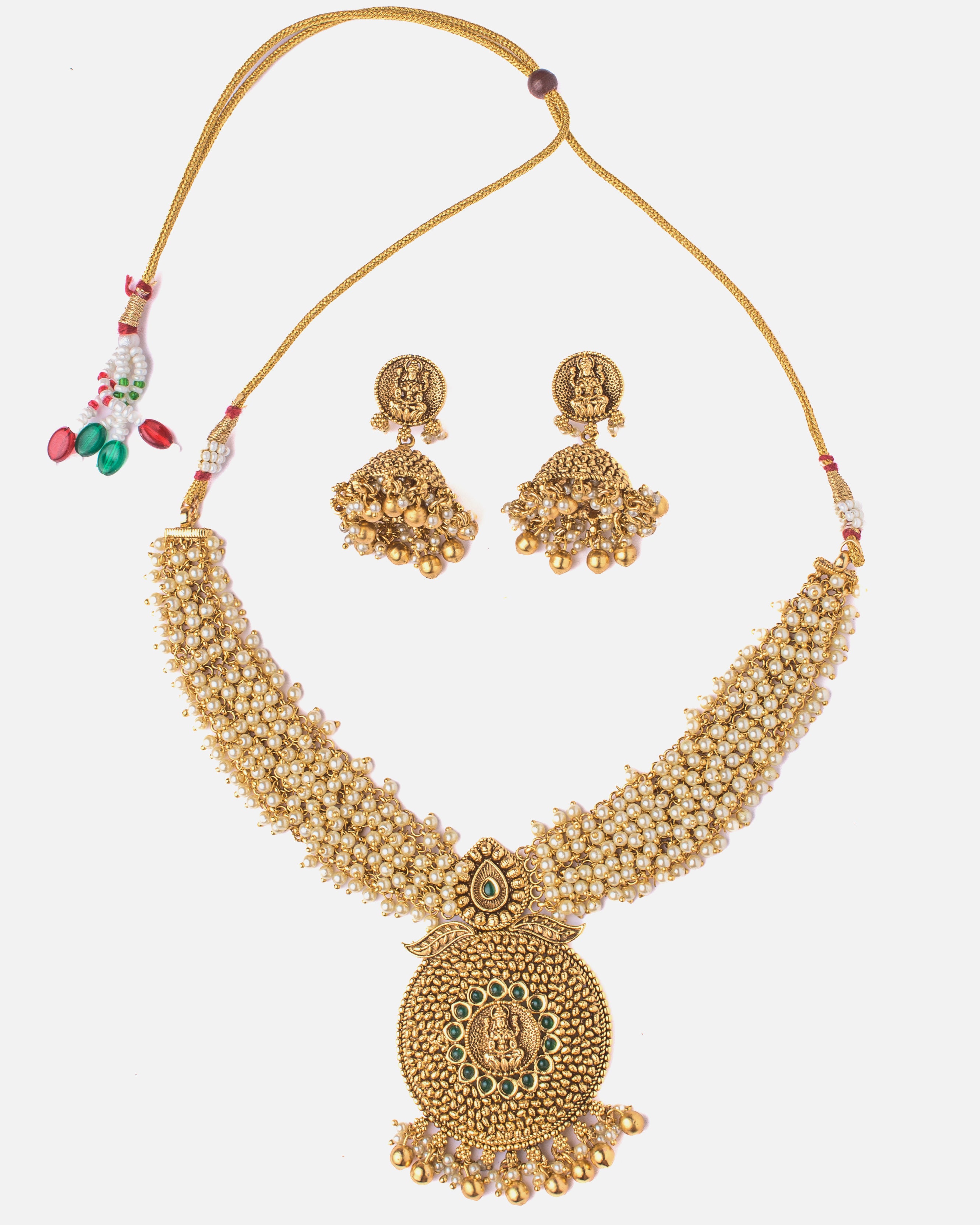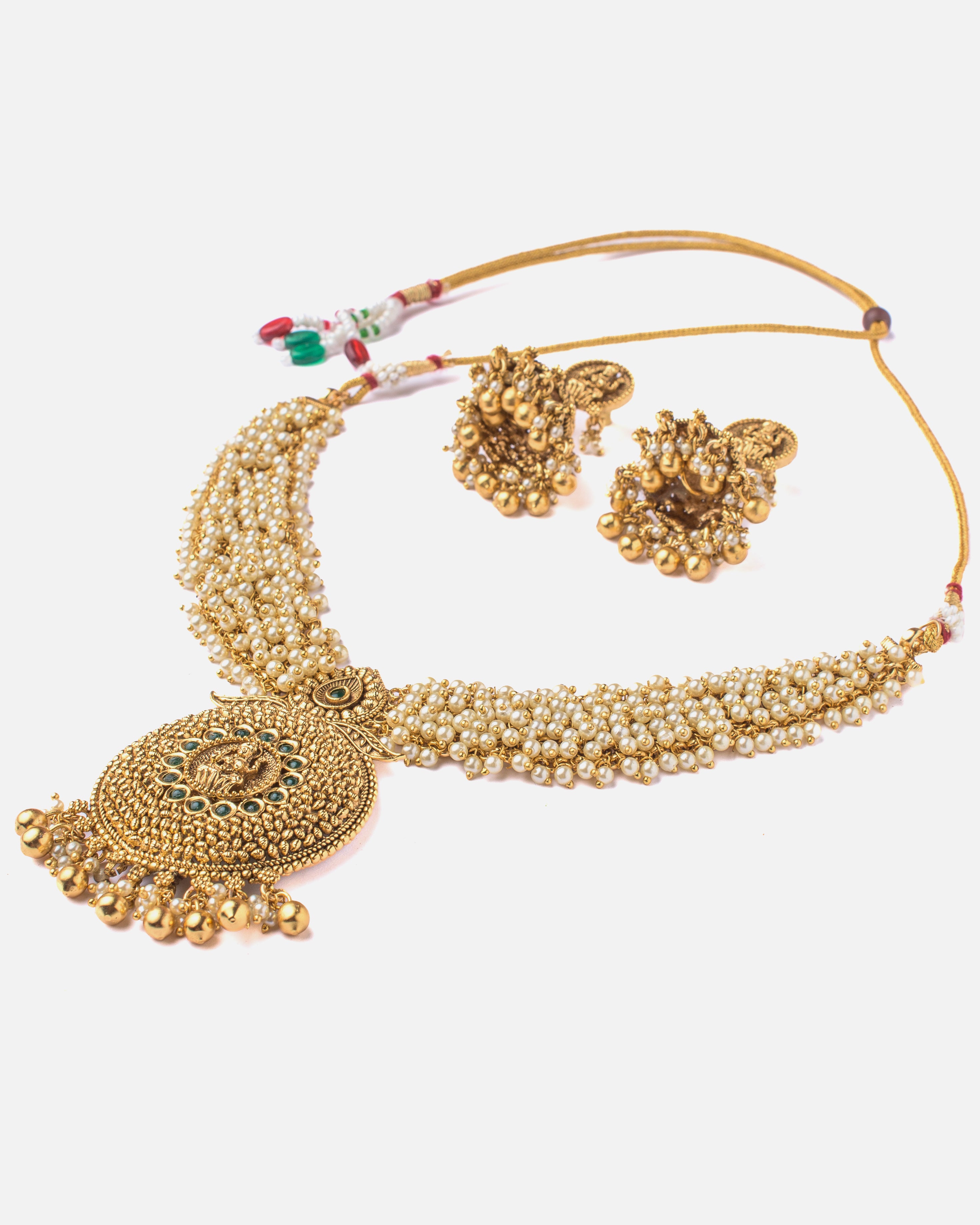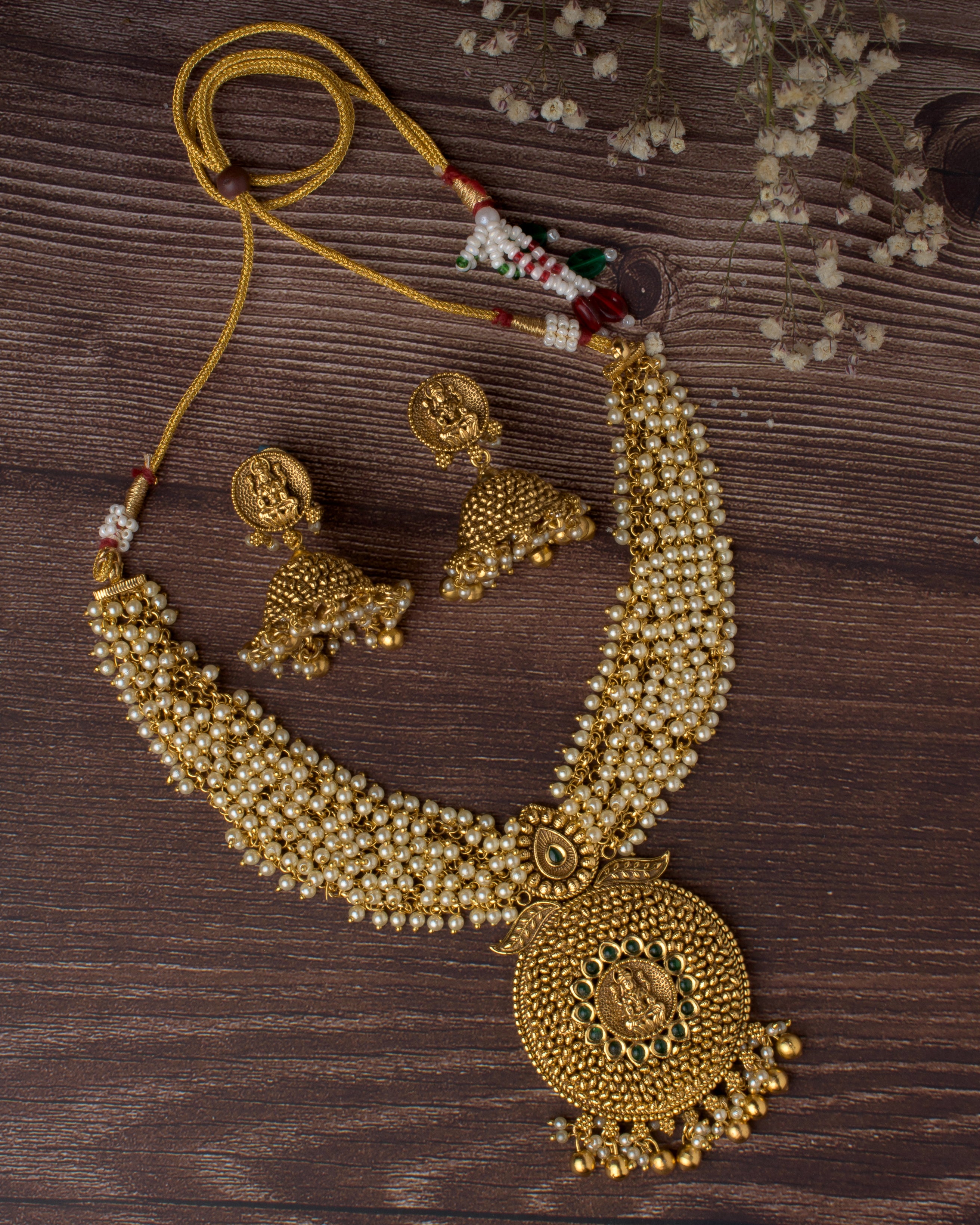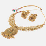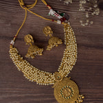 This exquisite necklace set features intricate golden beadwork and a bold circular pendant, paired with matching earrings. Ideal for festive occasions, it adds royal elegance to any traditional attire.