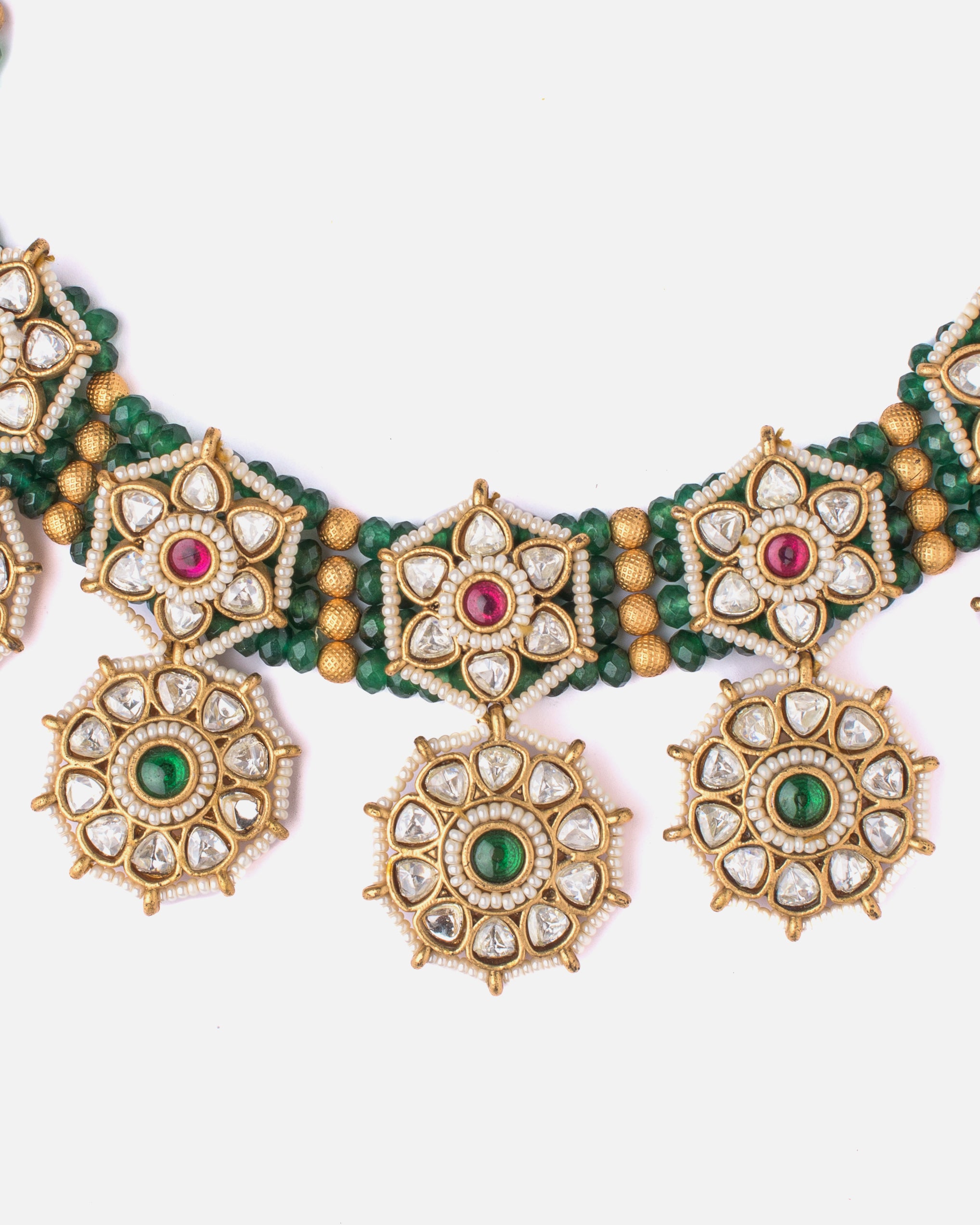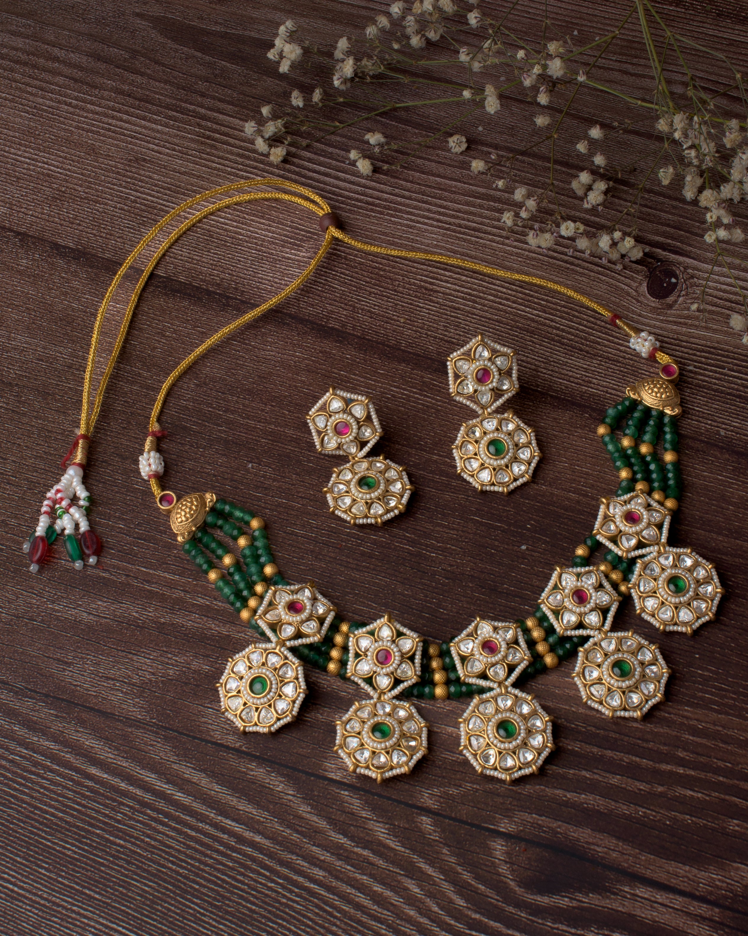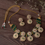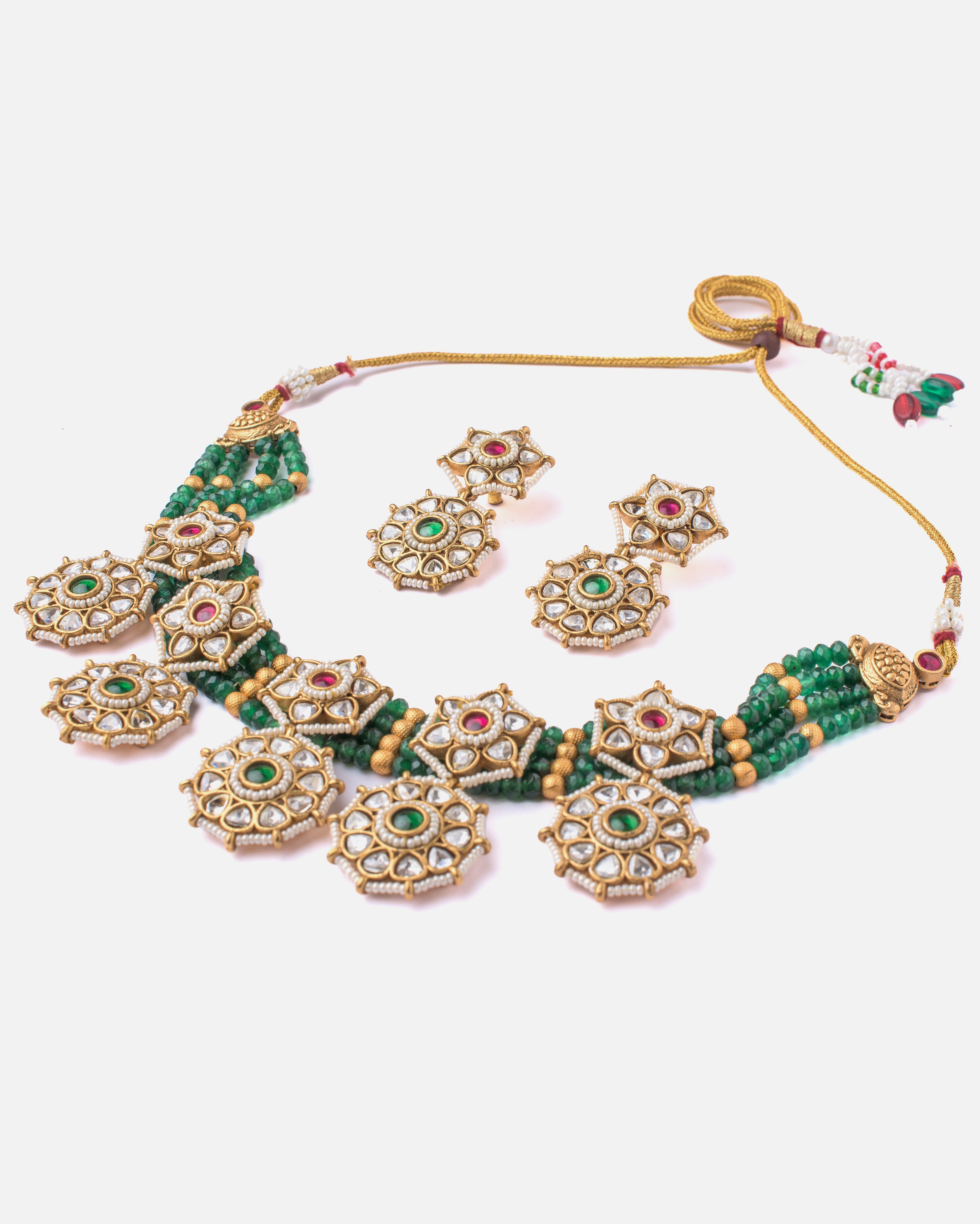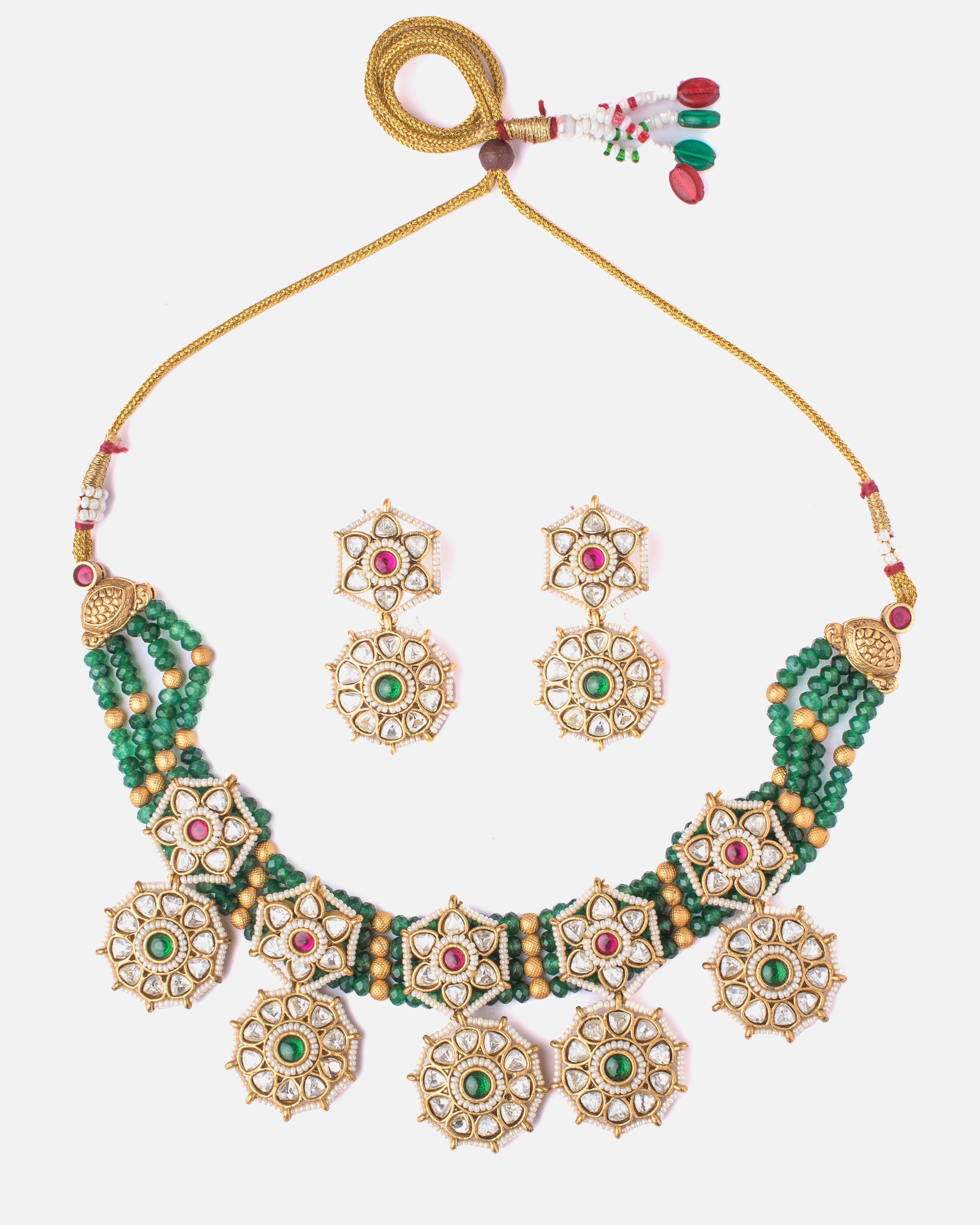 This traditional necklace set features a striking design with octagonal pendants adorned with green and ruby-red stones. Paired with matching earrings, it's perfect for festive and ethnic occasions.
