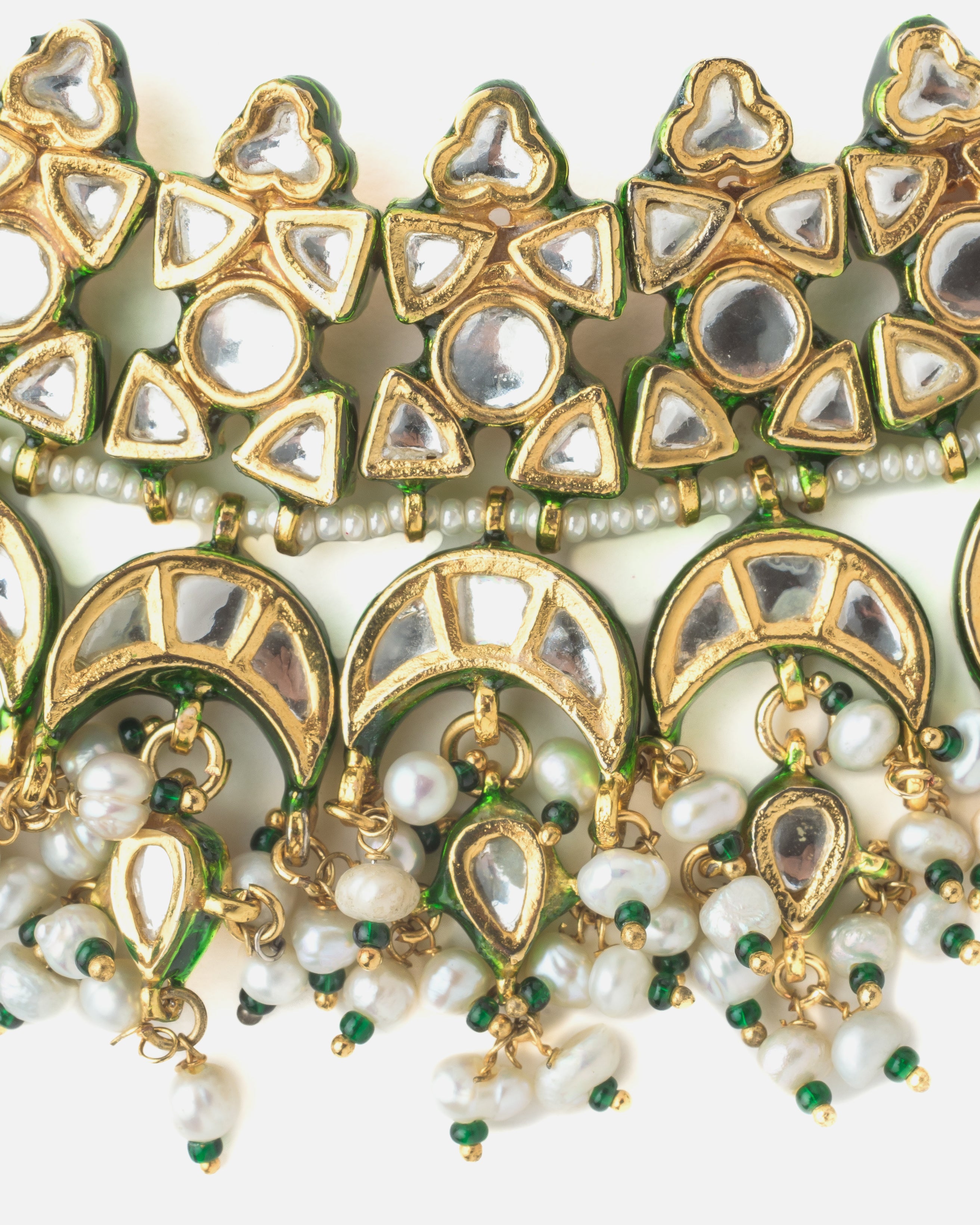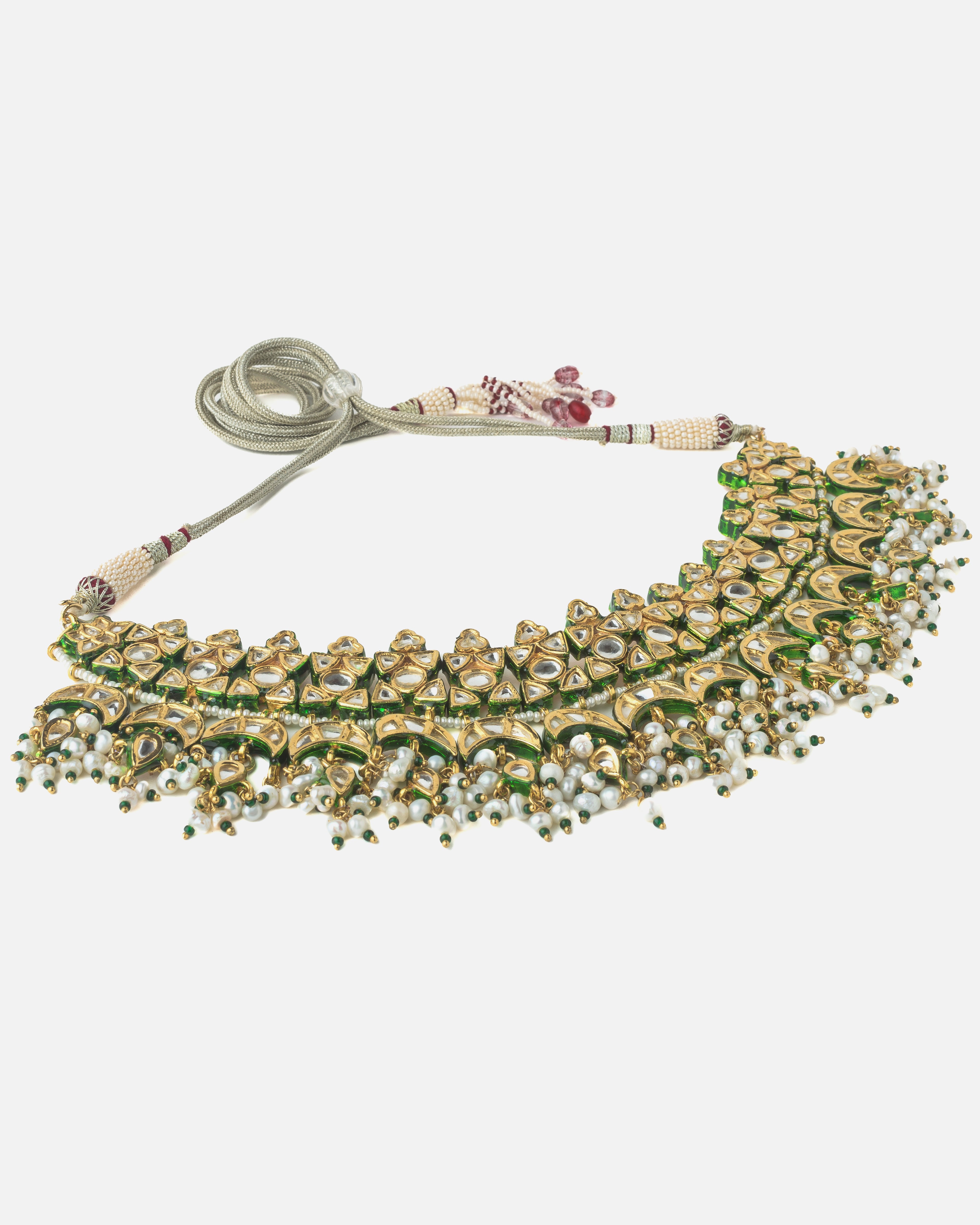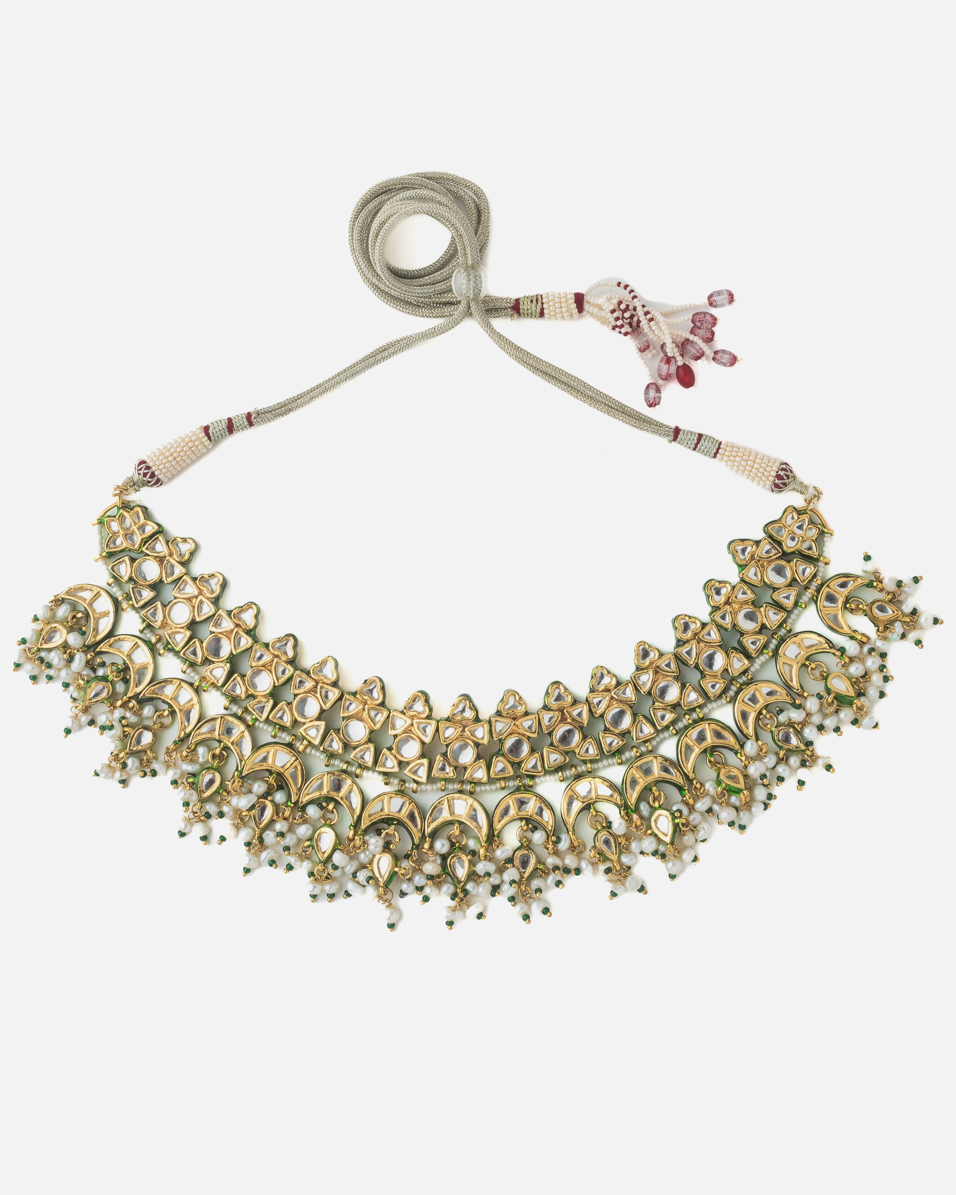 This elegant choker necklace features intricate Kundan work in a floral and crescent motif design, finished with pearl and green bead drops. A perfect accessory for weddings and festive traditional looks.