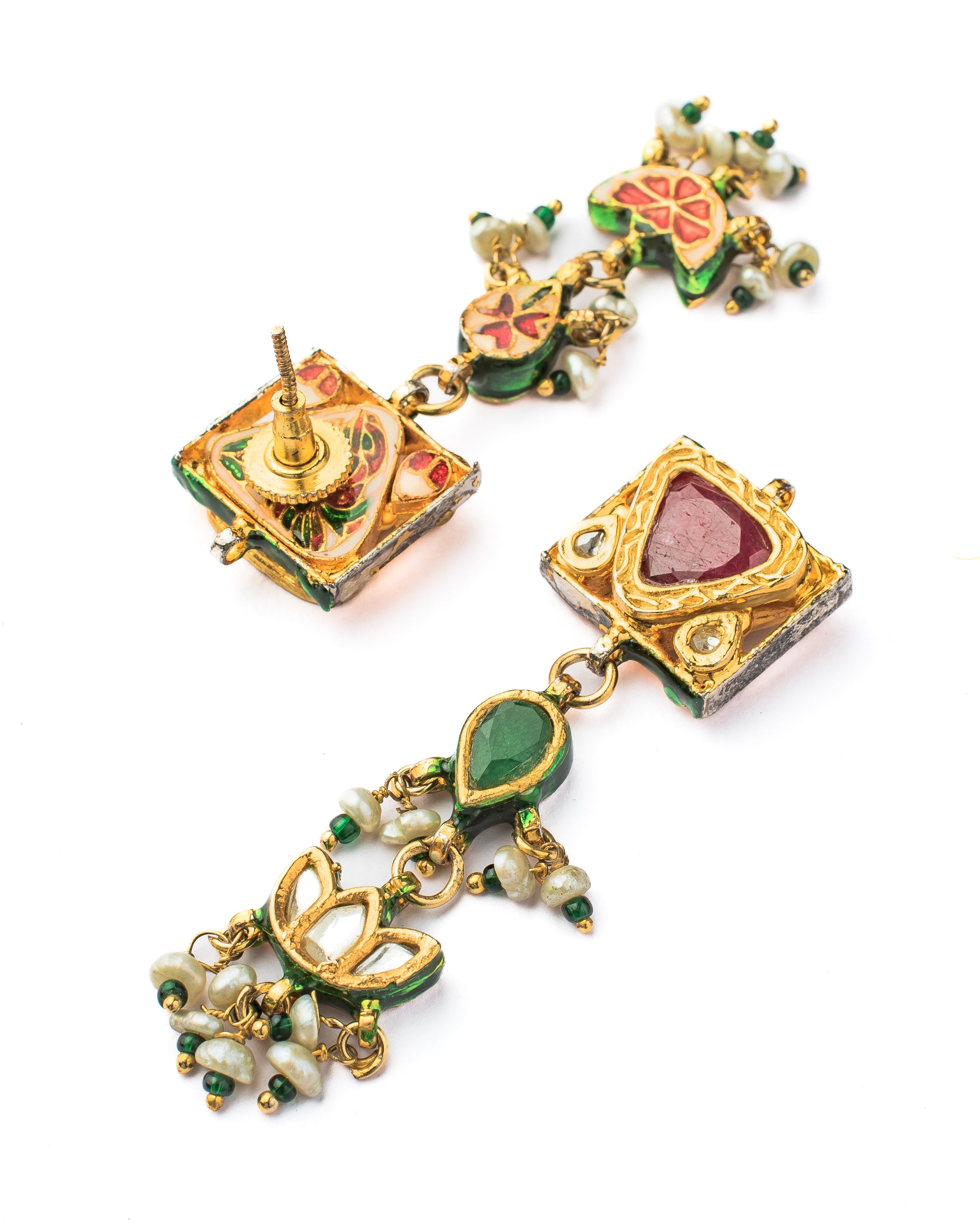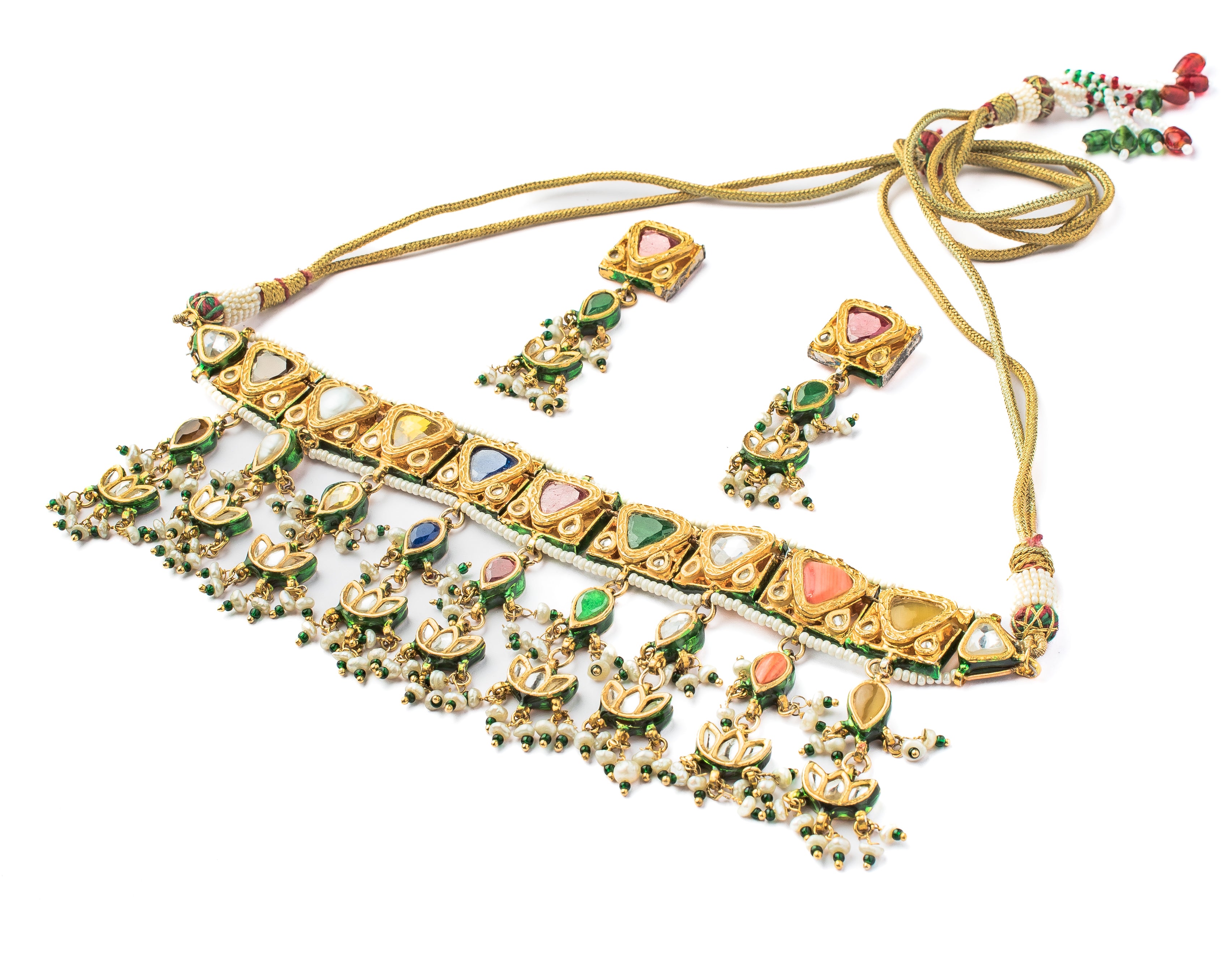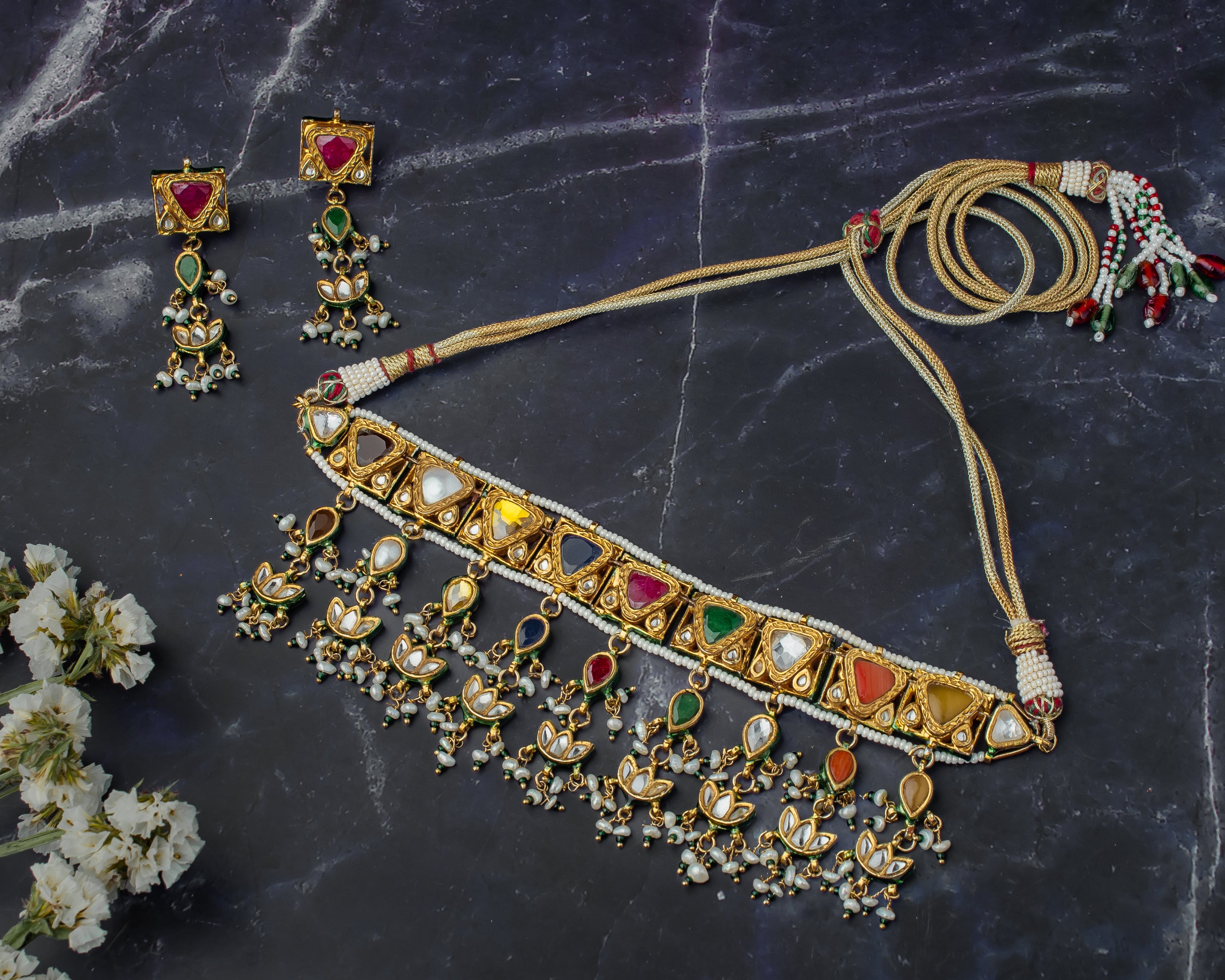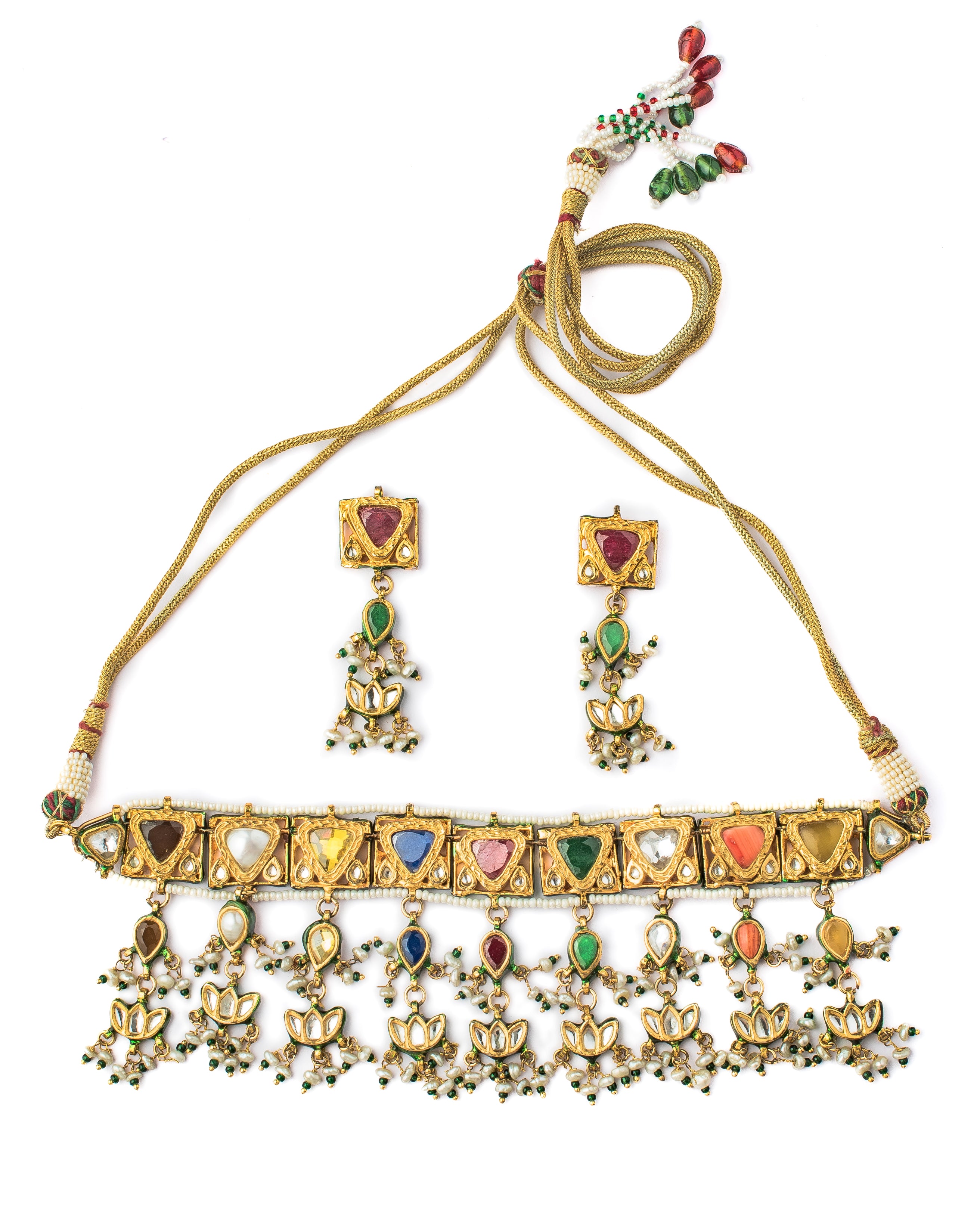 Elegant necklace set featuring vibrant multicolor gemstones in a lotus-inspired design. Paired with matching earrings, it’s perfect for adding a royal touch to your festive or traditional outfits.