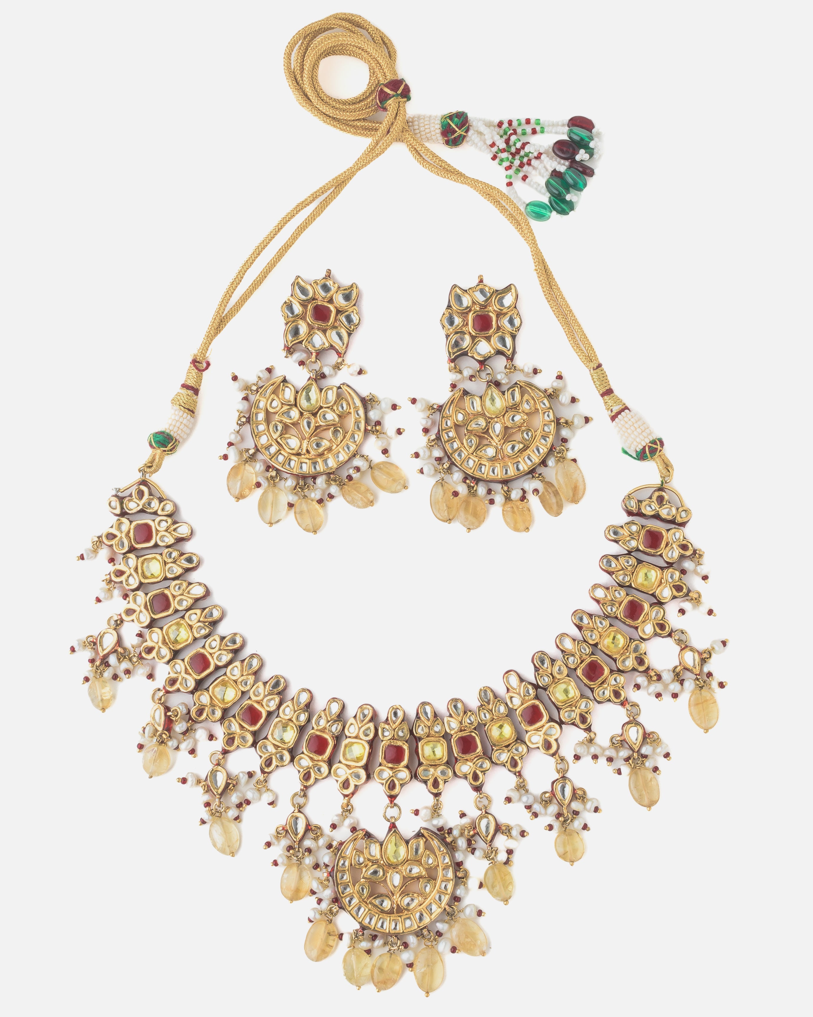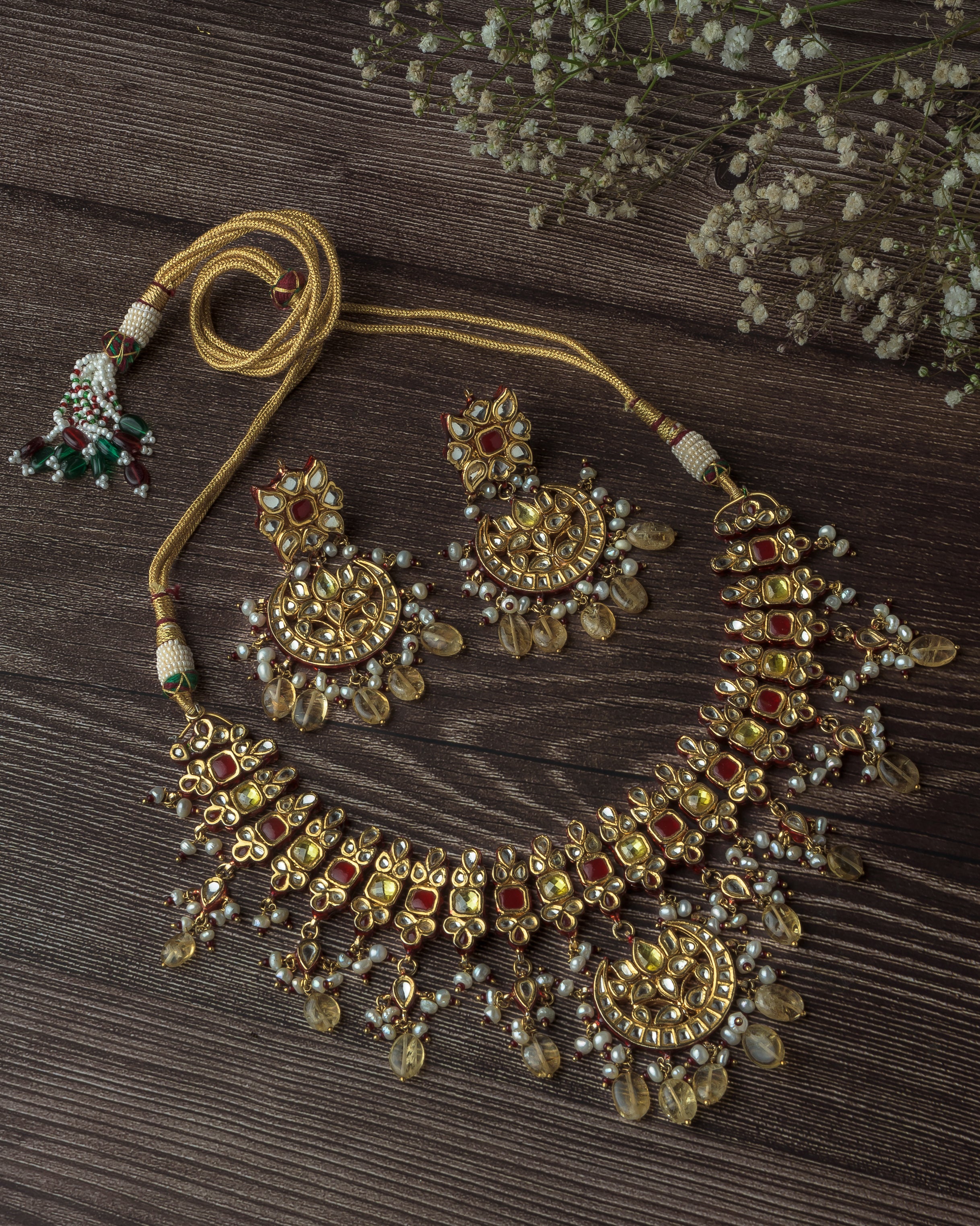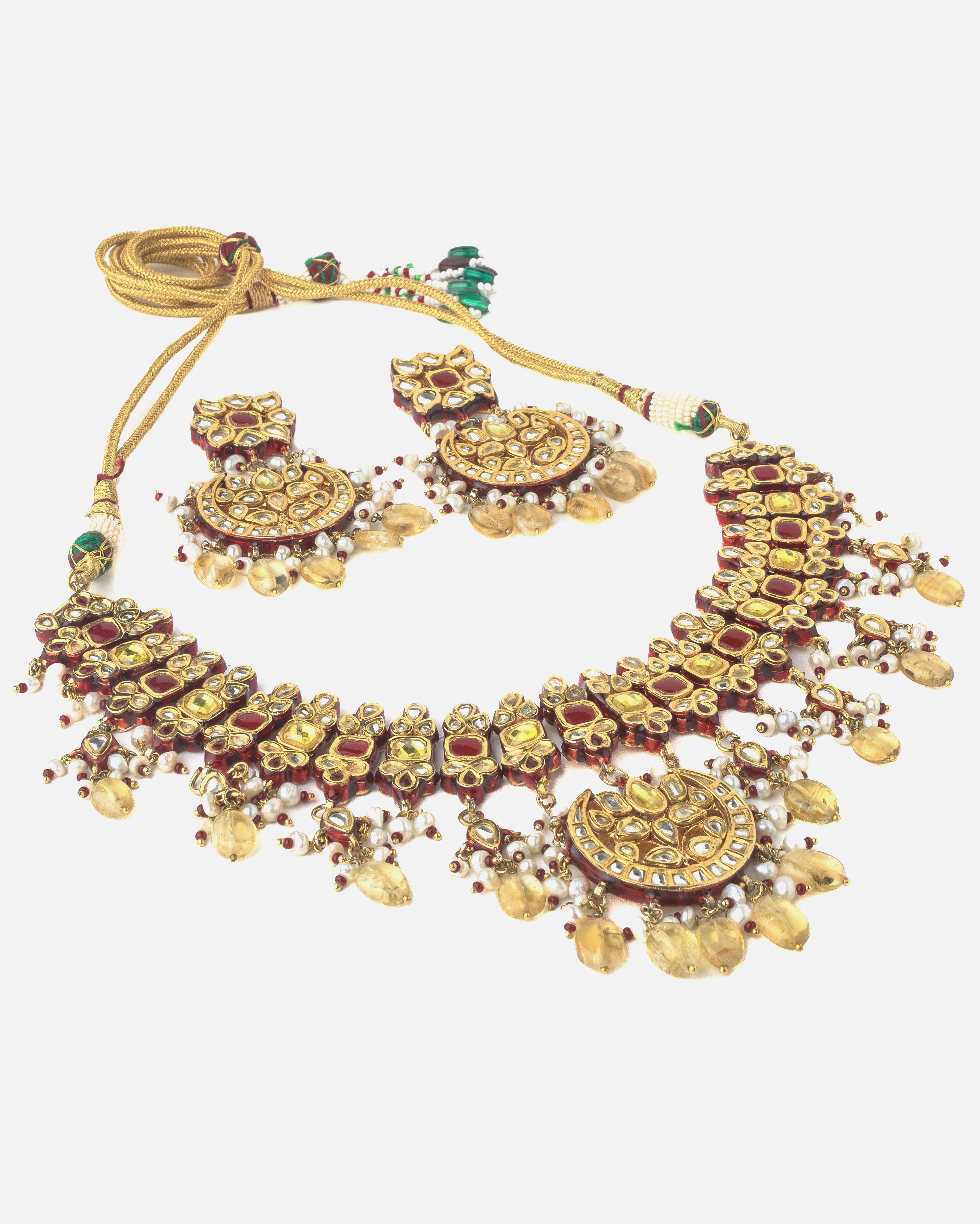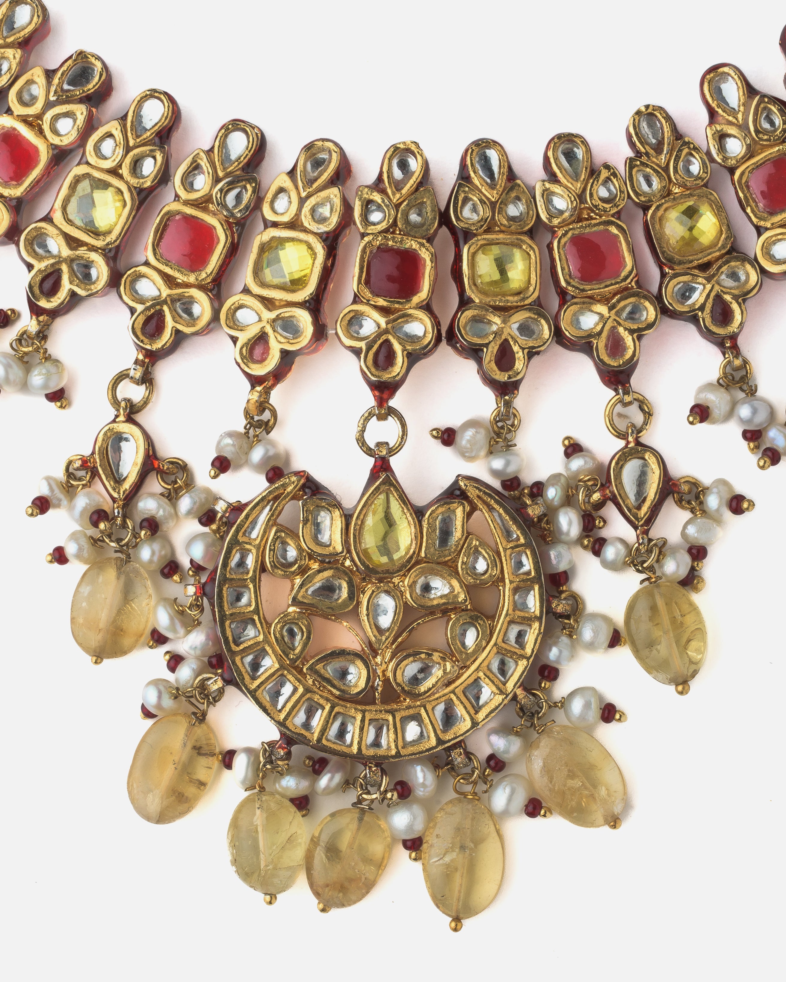 Gold Plated Yellow & Red Womens Kundan Choker Necklace Set with Pair of Earrings