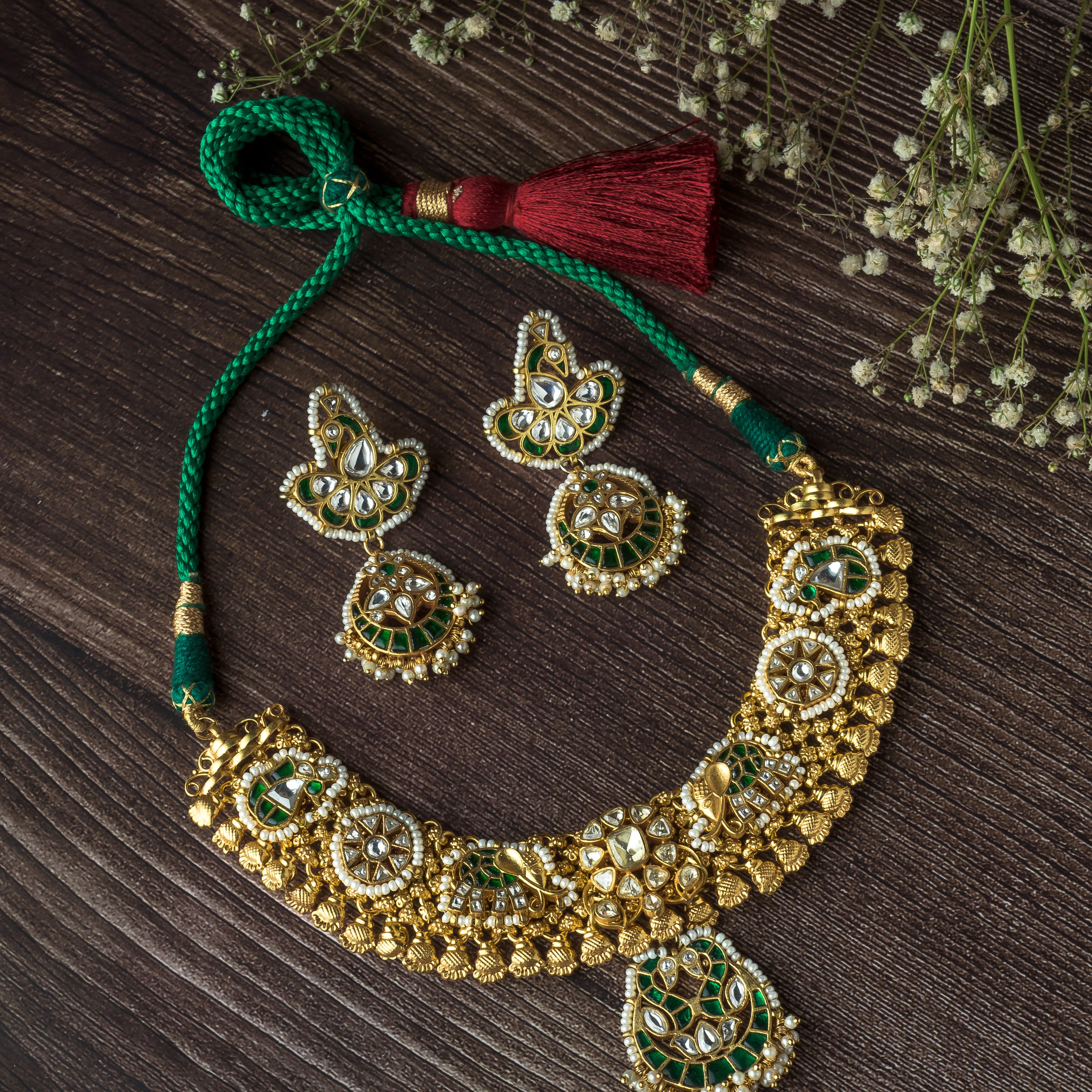 Gold Plated Green Womens Kundan Short Necklace Set with Pair of Earrings