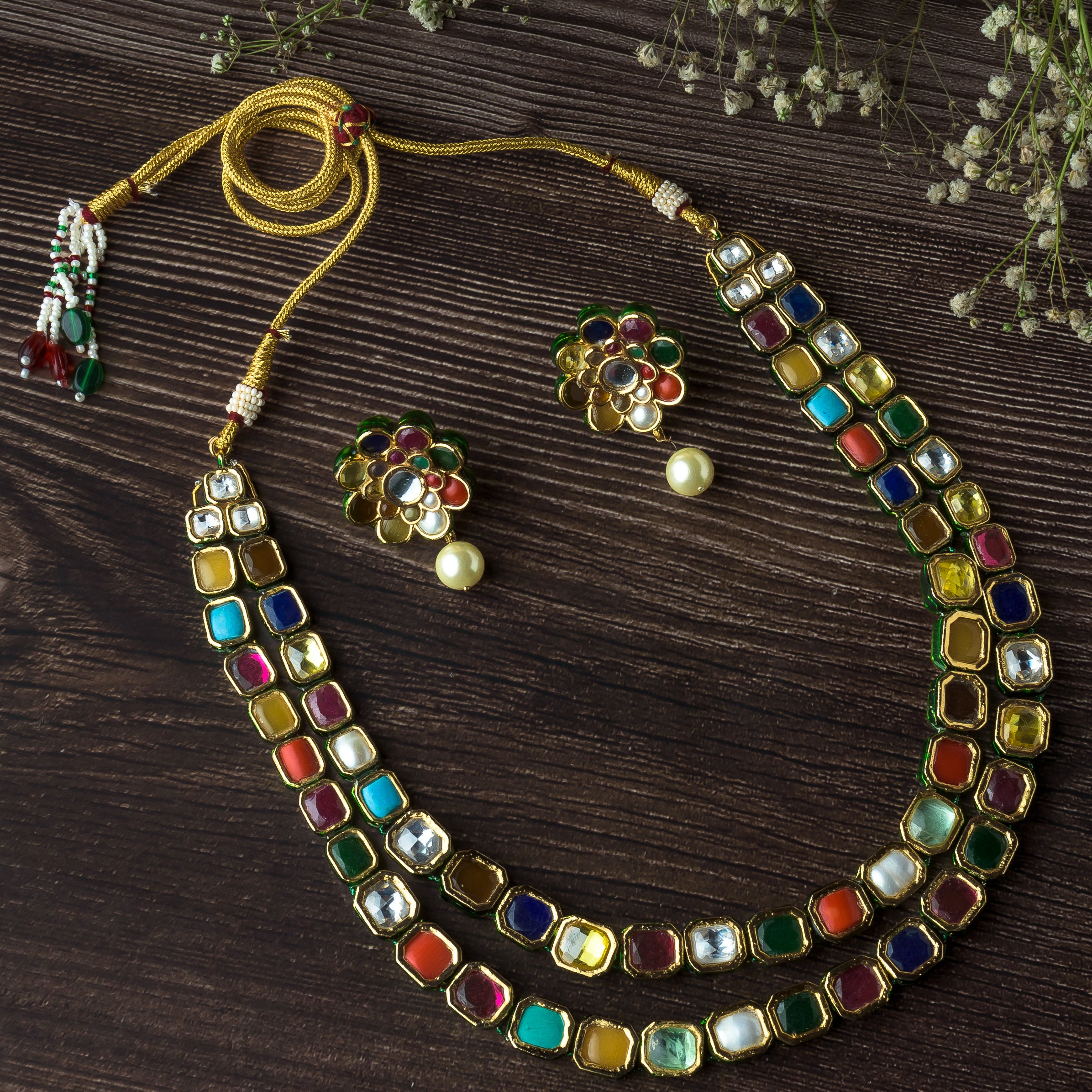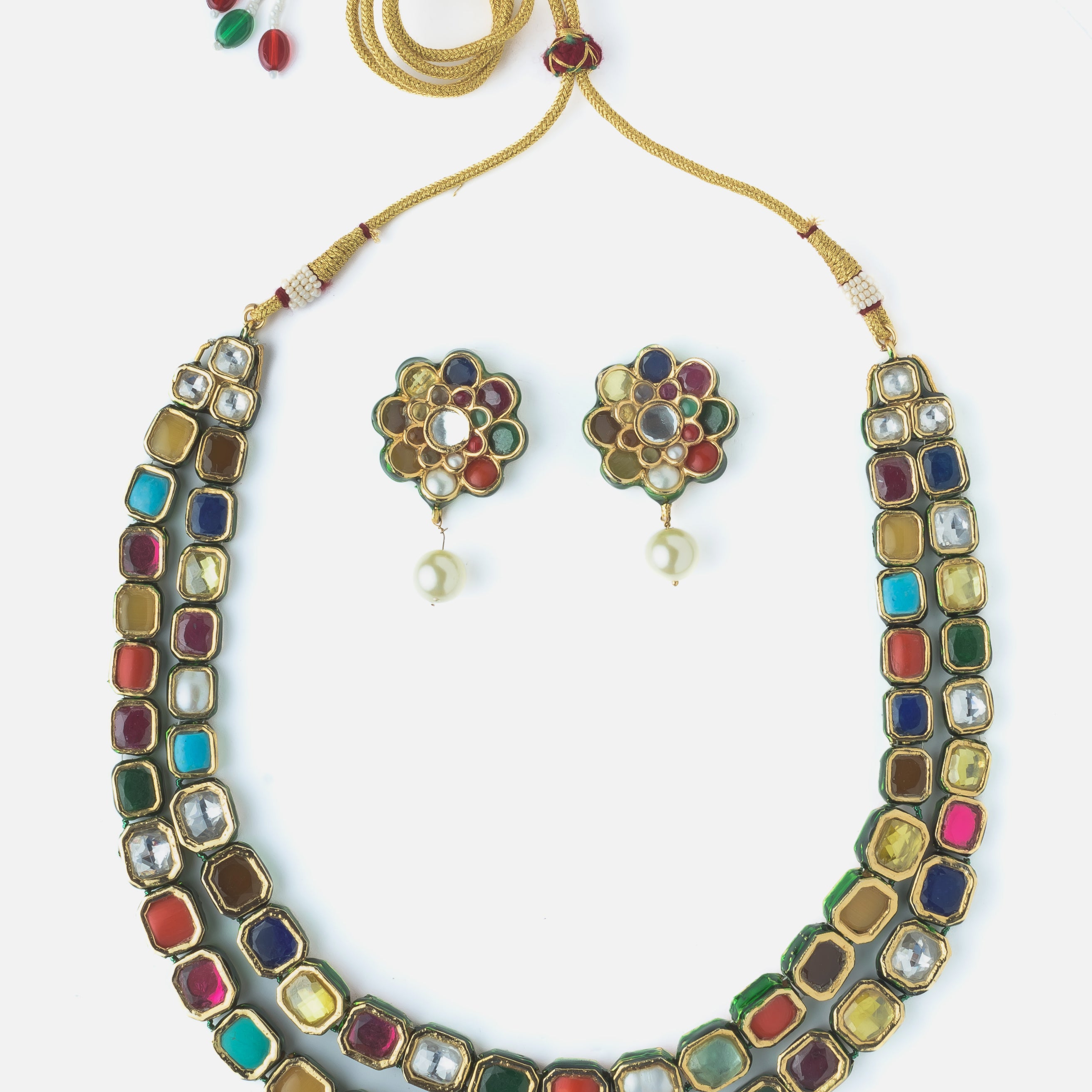 Gold Plated Multicolored Womens Synthetic Stones Short Necklace Set with Pair of Earrings