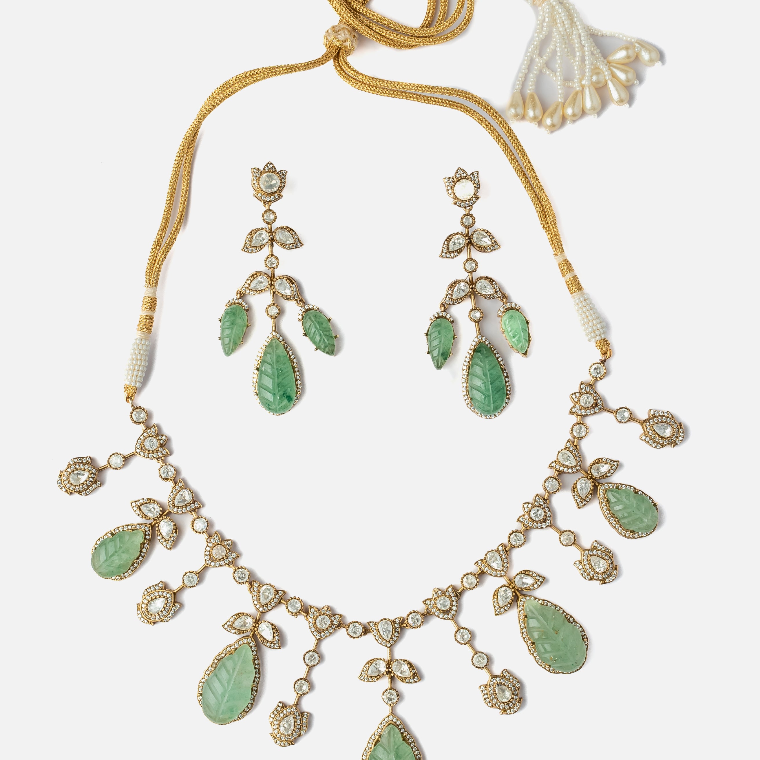 Gold Plated Green Womens Kundan Polki Necklace Set with Pair of Earrings