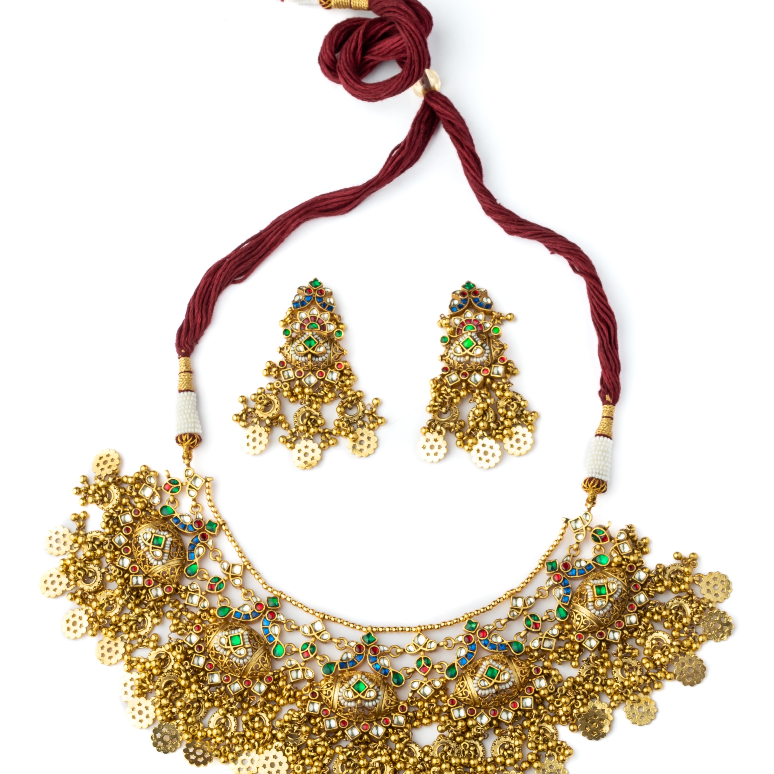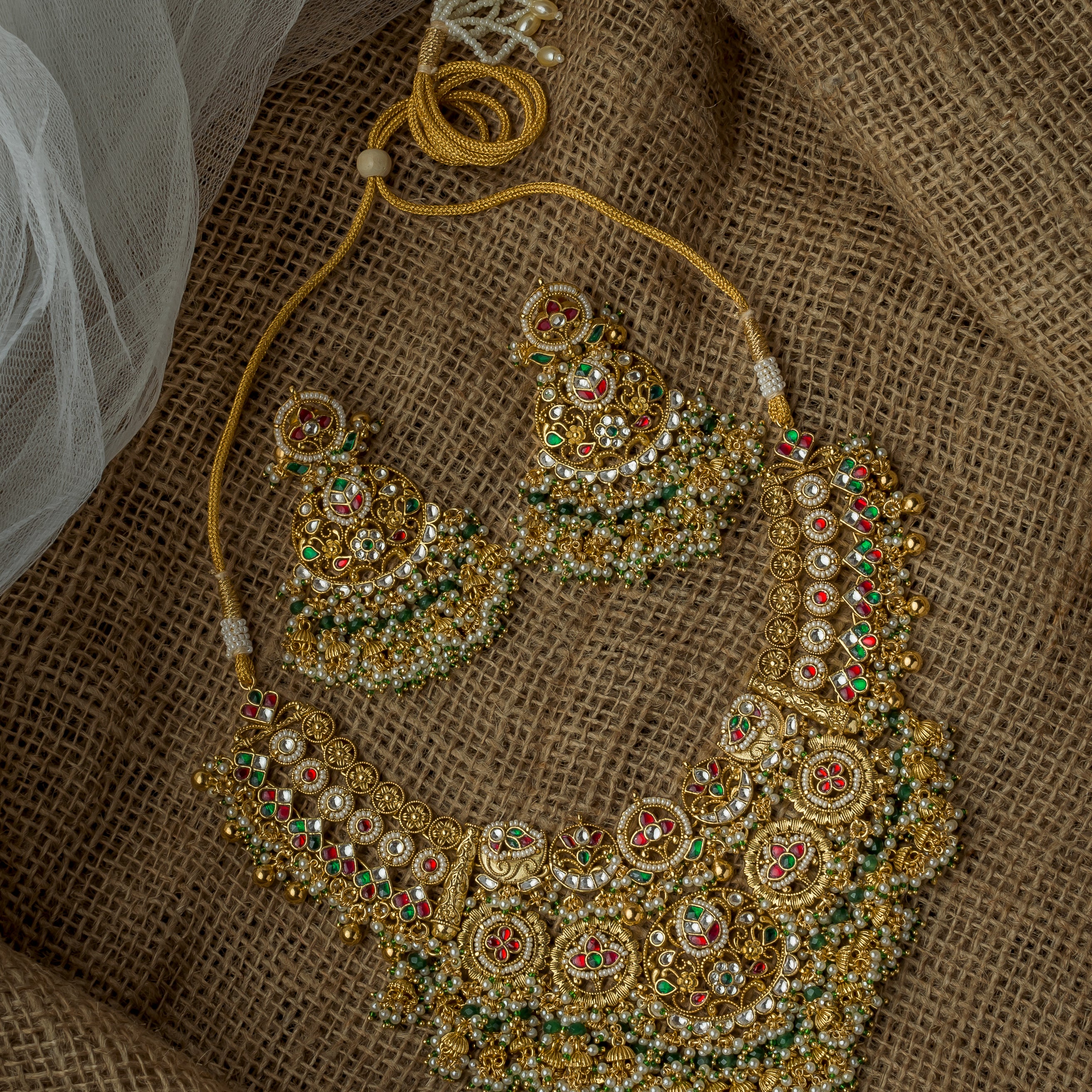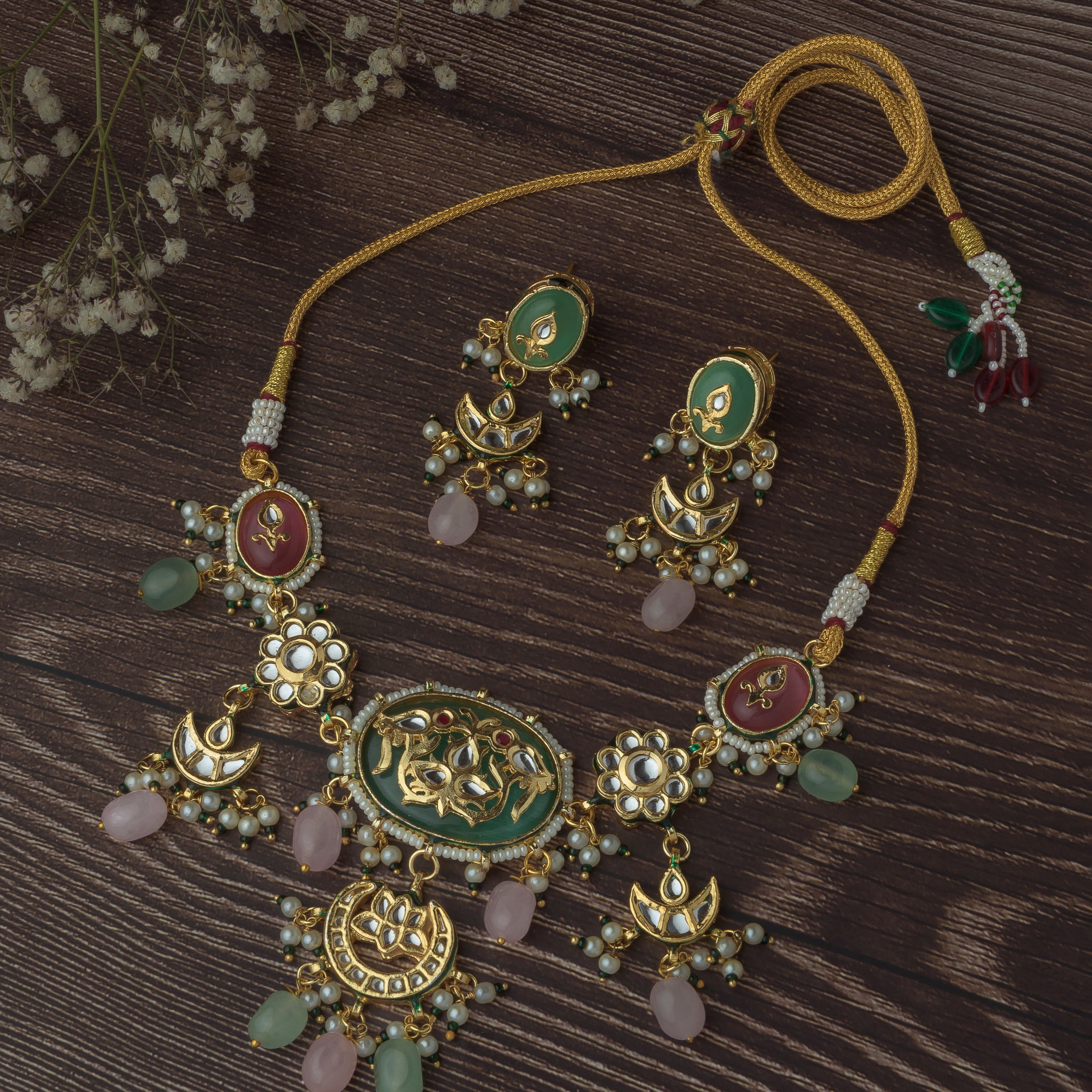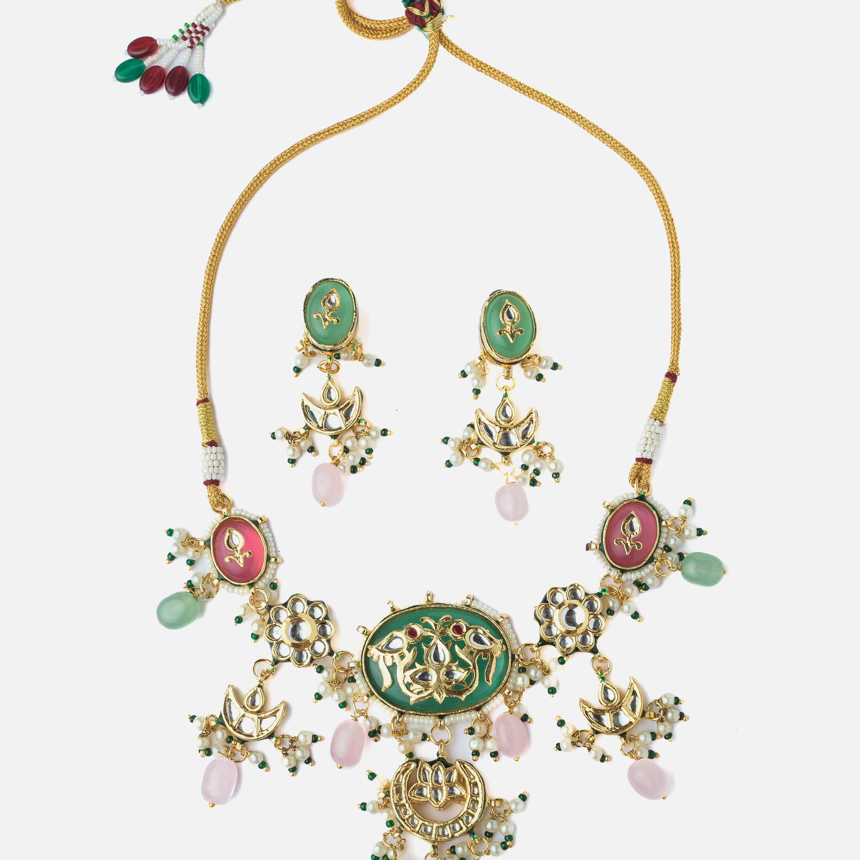 Gold Plated Multicolored Womens Kundan Polki Necklace Set with Pair of Earrings