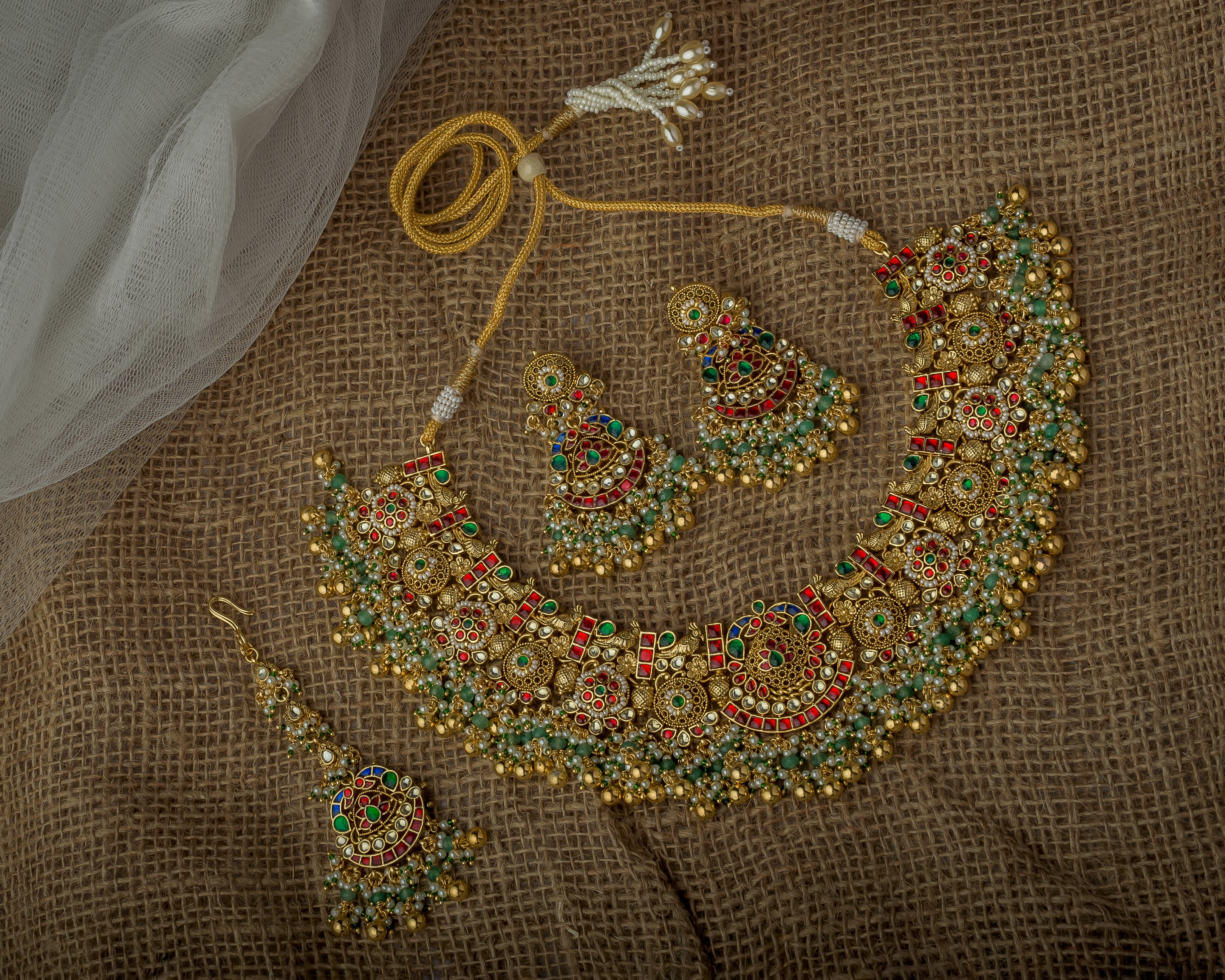 Gold Plated Multicolored Womens Kundan Polki Necklace Set with Pair of Earrings & Maangtikka