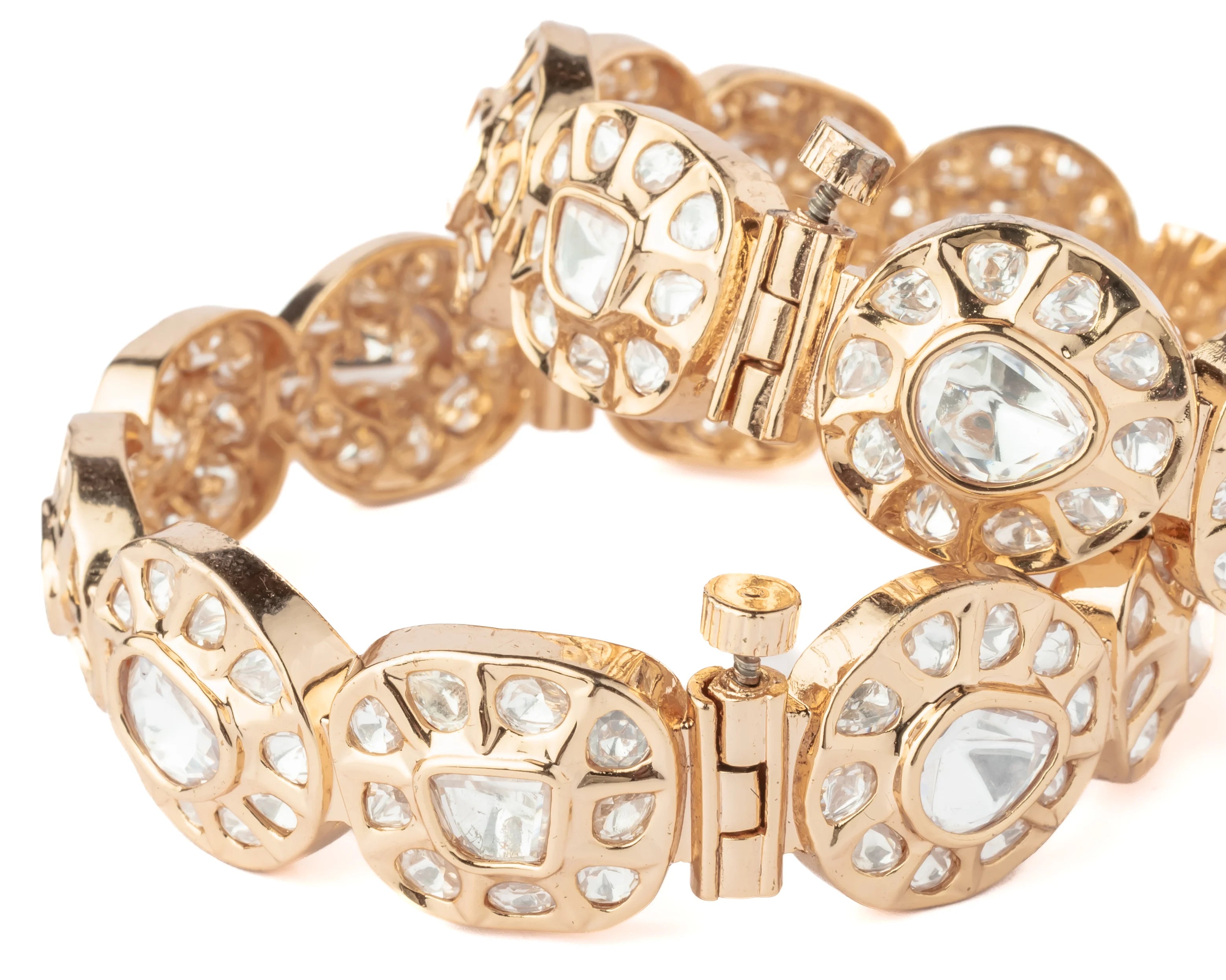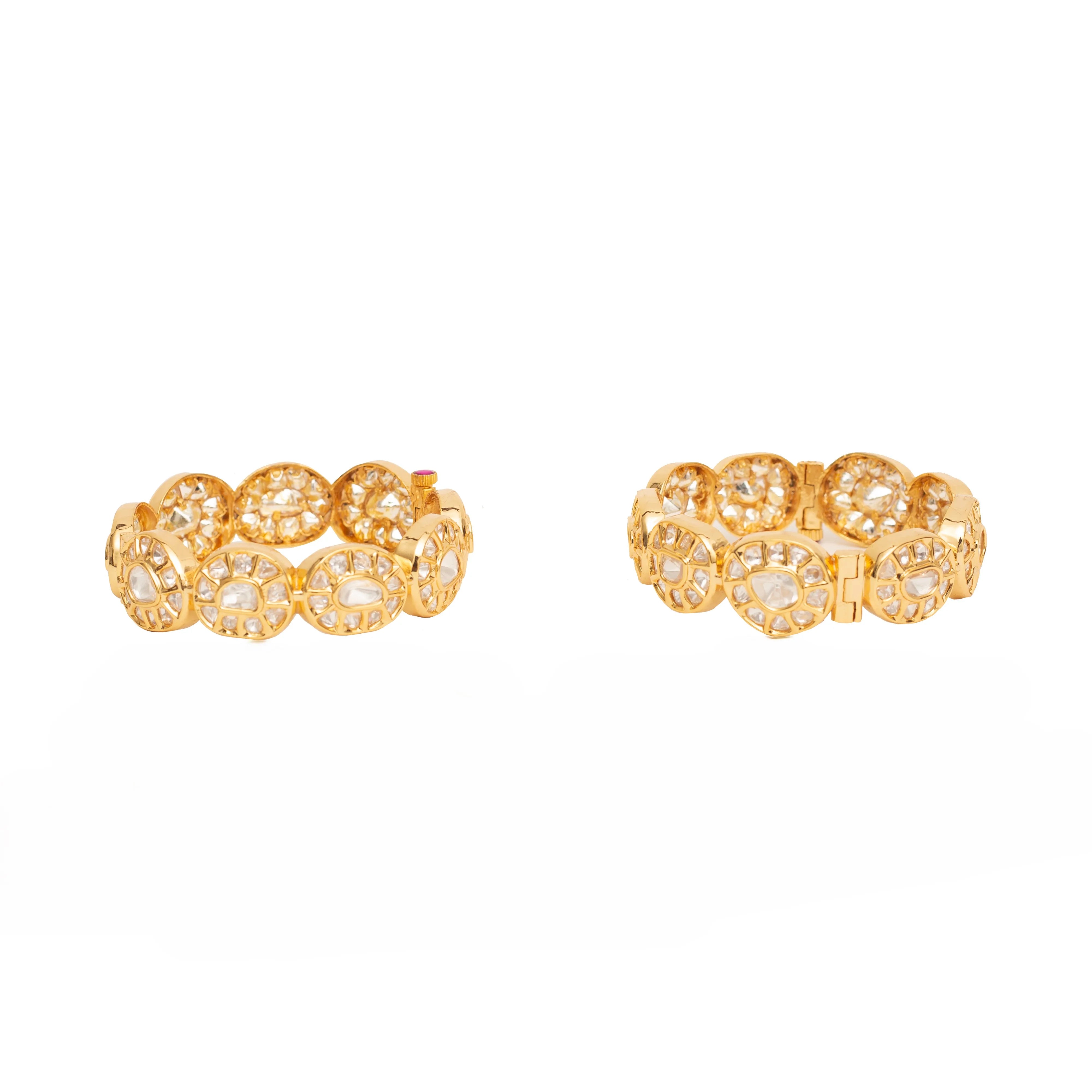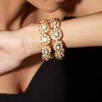 Elegant gold-toned bangles with intricate openwork design, embedded with sparkling stones. A timeless accessory that enhances traditional and modern outfits with grace and charm.