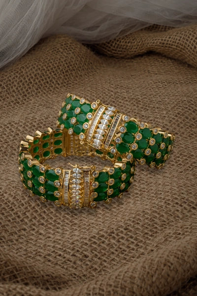 Elegant gold-plated bangles adorned with vibrant green stones and sparkling white embellishments. A perfect blend of tradition and luxury, ideal for weddings and festive occasions.