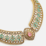 This Pastel Mint Stones Kundan Choker Necklace Set features intricate kundan work with pastel accents, paired with matching earrings. A perfect choice for weddings, festive occasions, and elegant soirées.