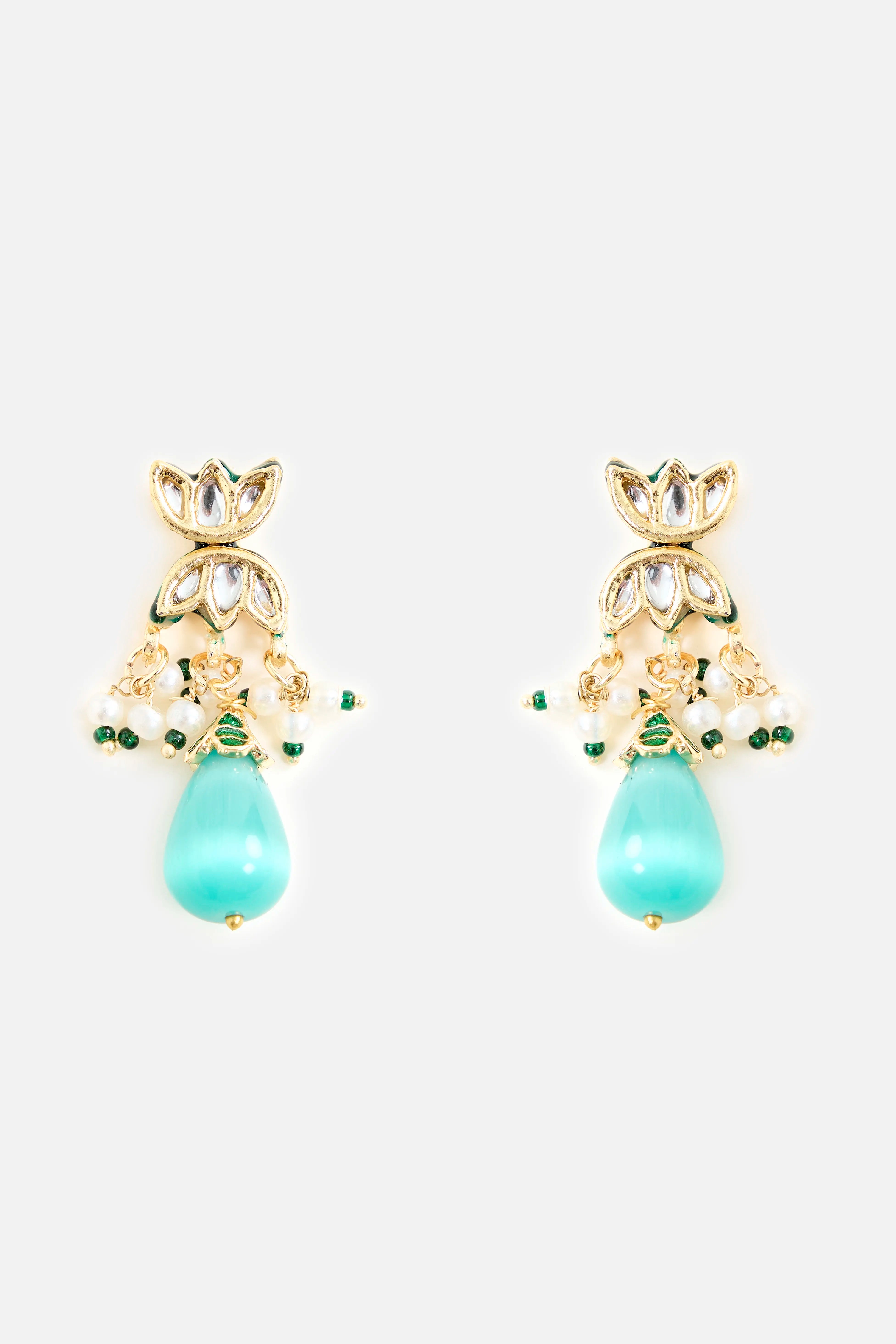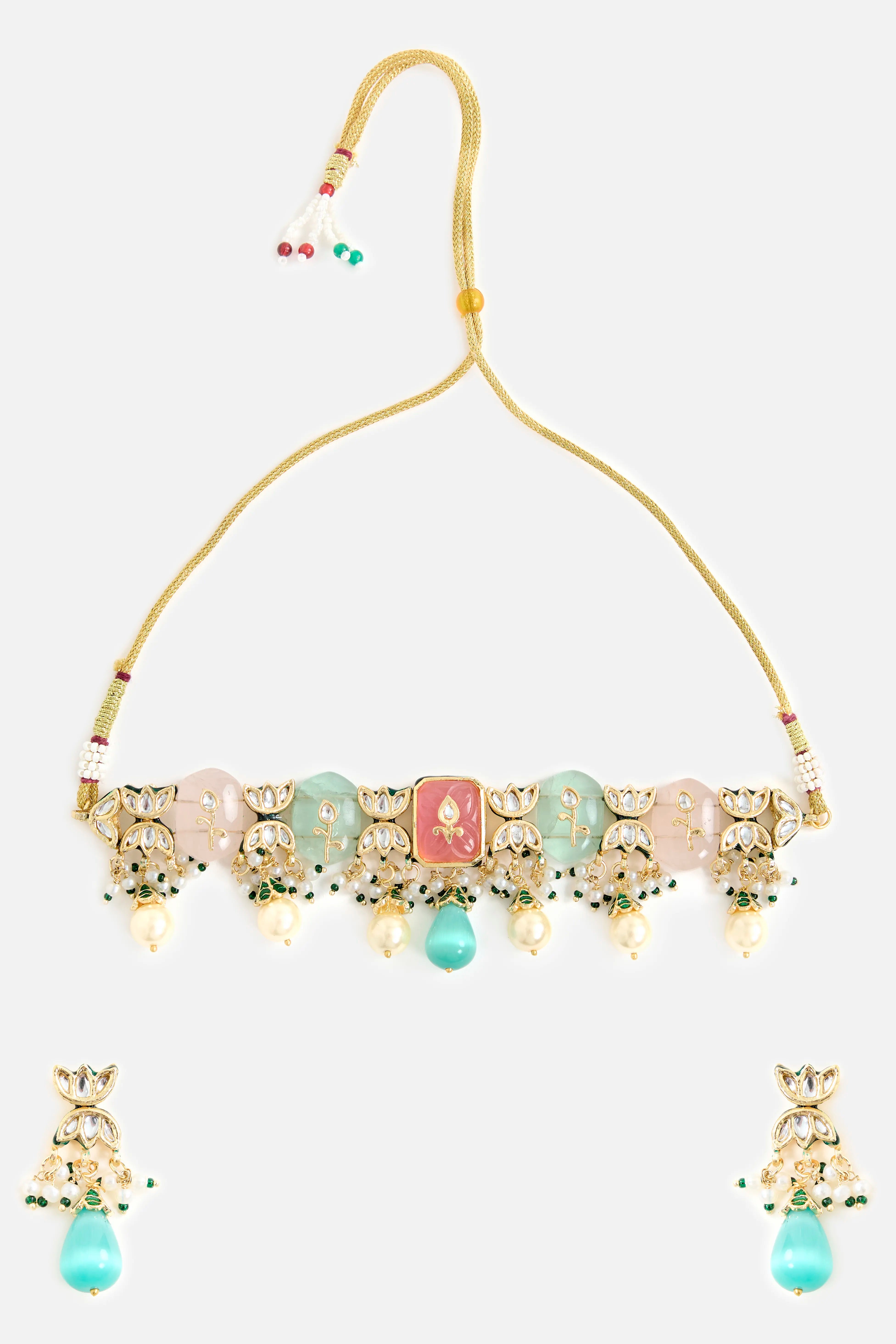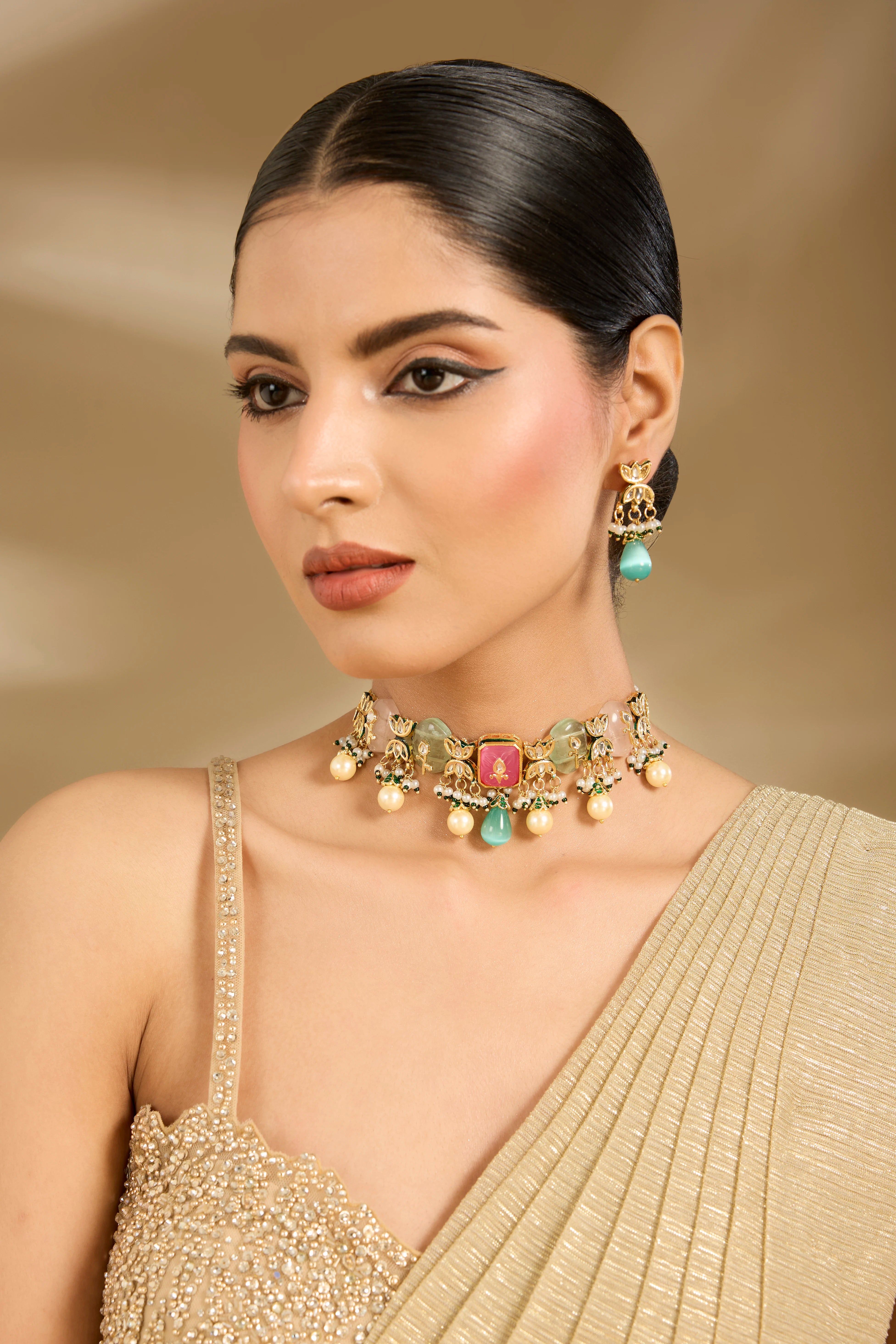 Chic gold-tone choker set with matching earrings, featuring multicolor stone accents and dangling beads. A perfect blend of elegance and tradition, ideal for weddings, festive events, and parties.