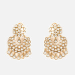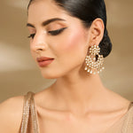 Gold-plated chandelier earrings adorned with pearls and stones, offering a lightweight yet statement look. Perfect to style with ethnic, festive, or party outfits for timeless elegance.