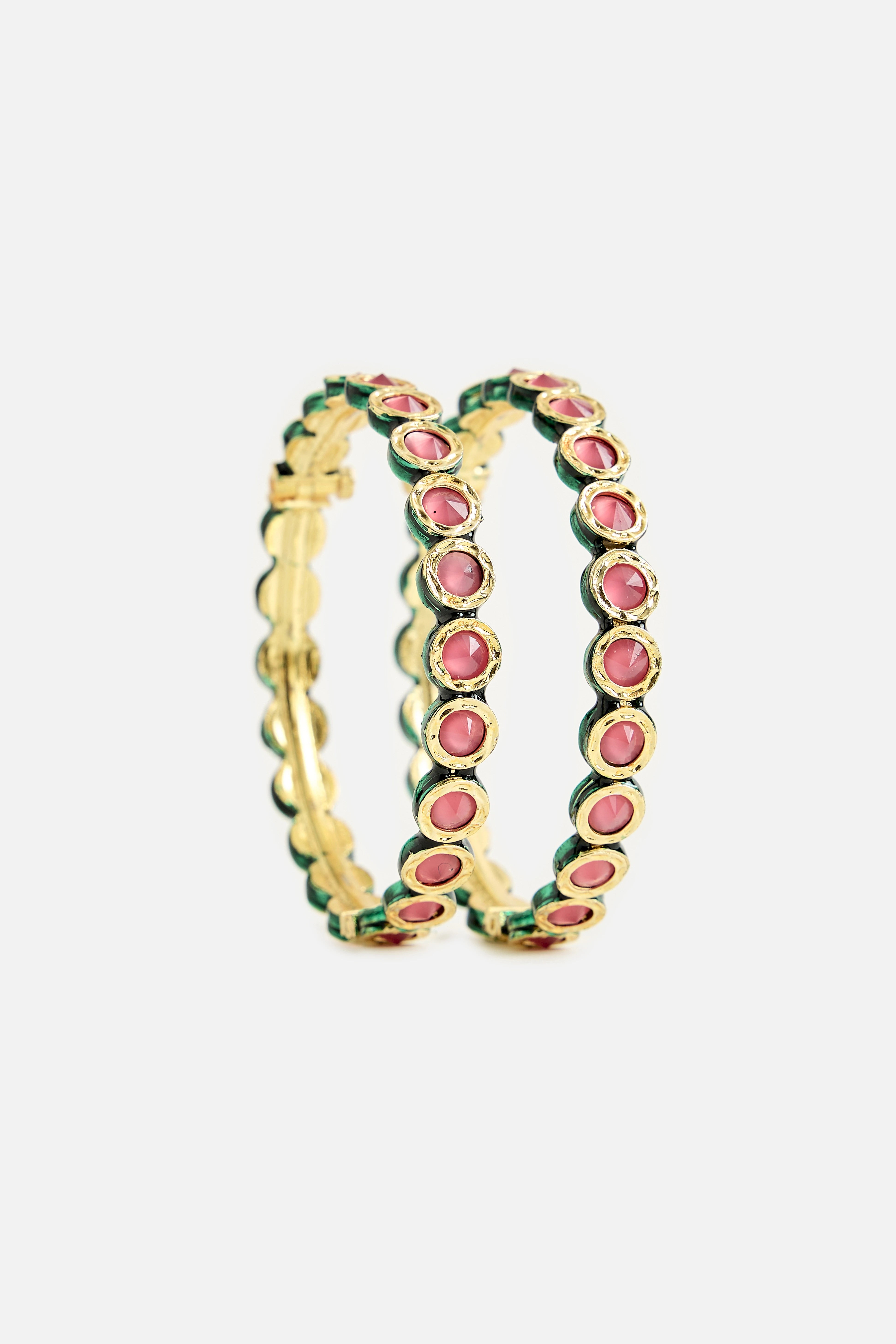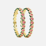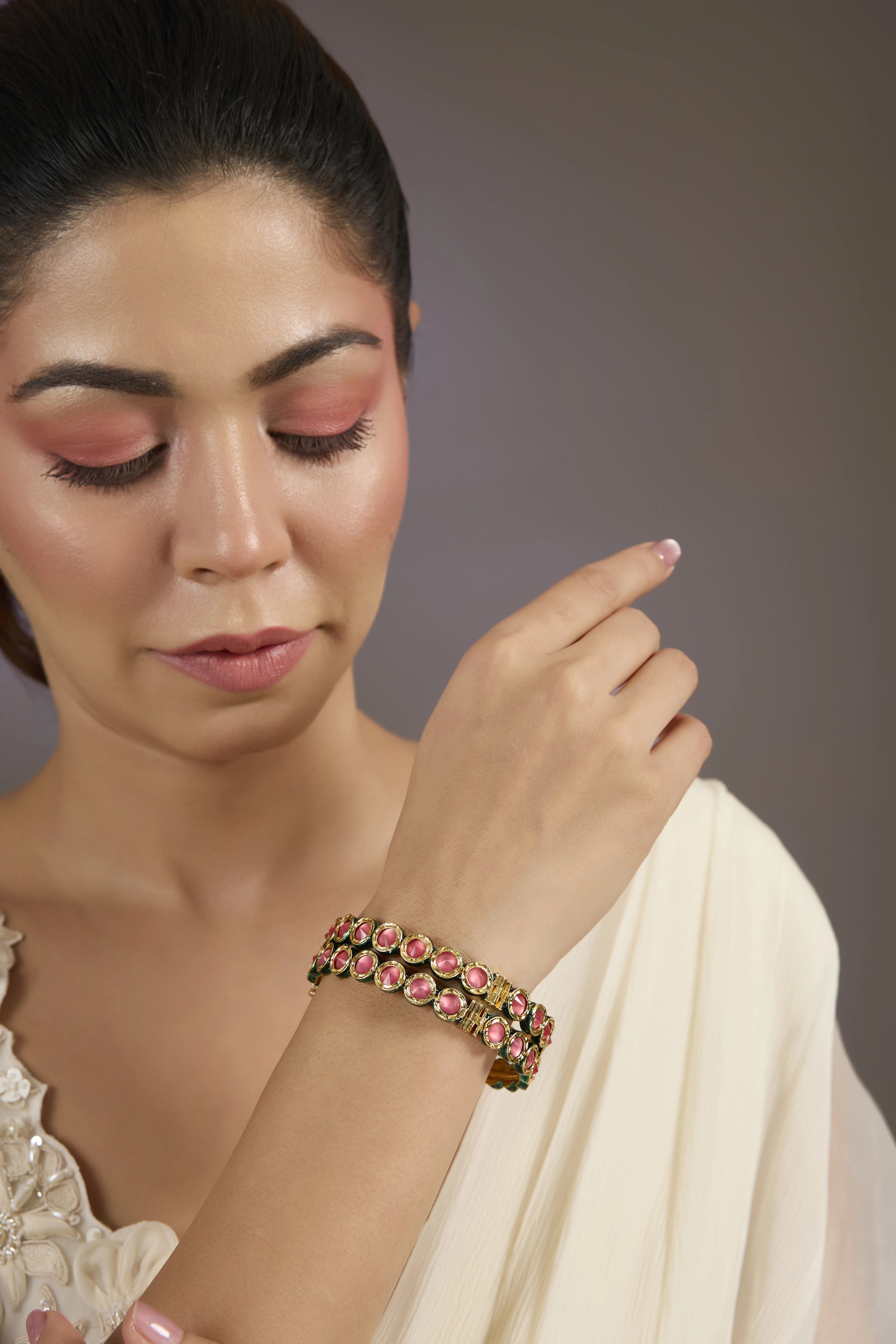 Delicate floral enamel kundan bracelet with pink and green detailing, crafted in an antique gold finish. A graceful piece perfect for weddings, festive occasions, and traditional celebrations.