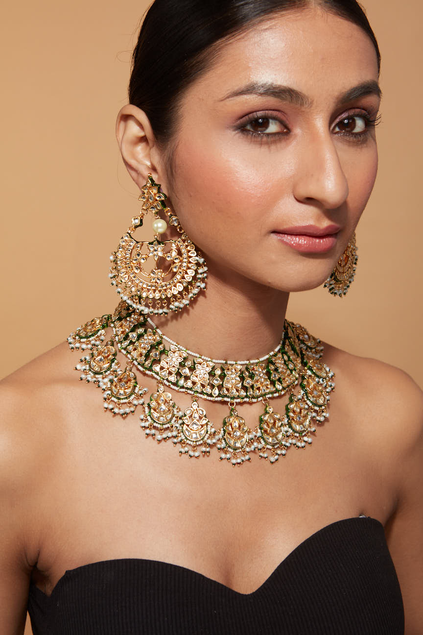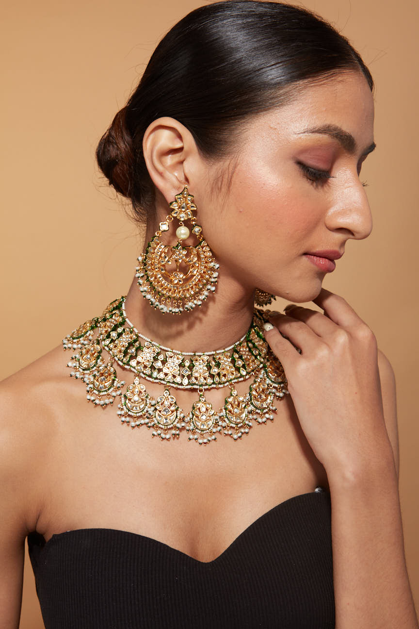 - Elegant Design: Gold-toned choker necklace set with intricate detailing and fine green accents for a luxurious look.