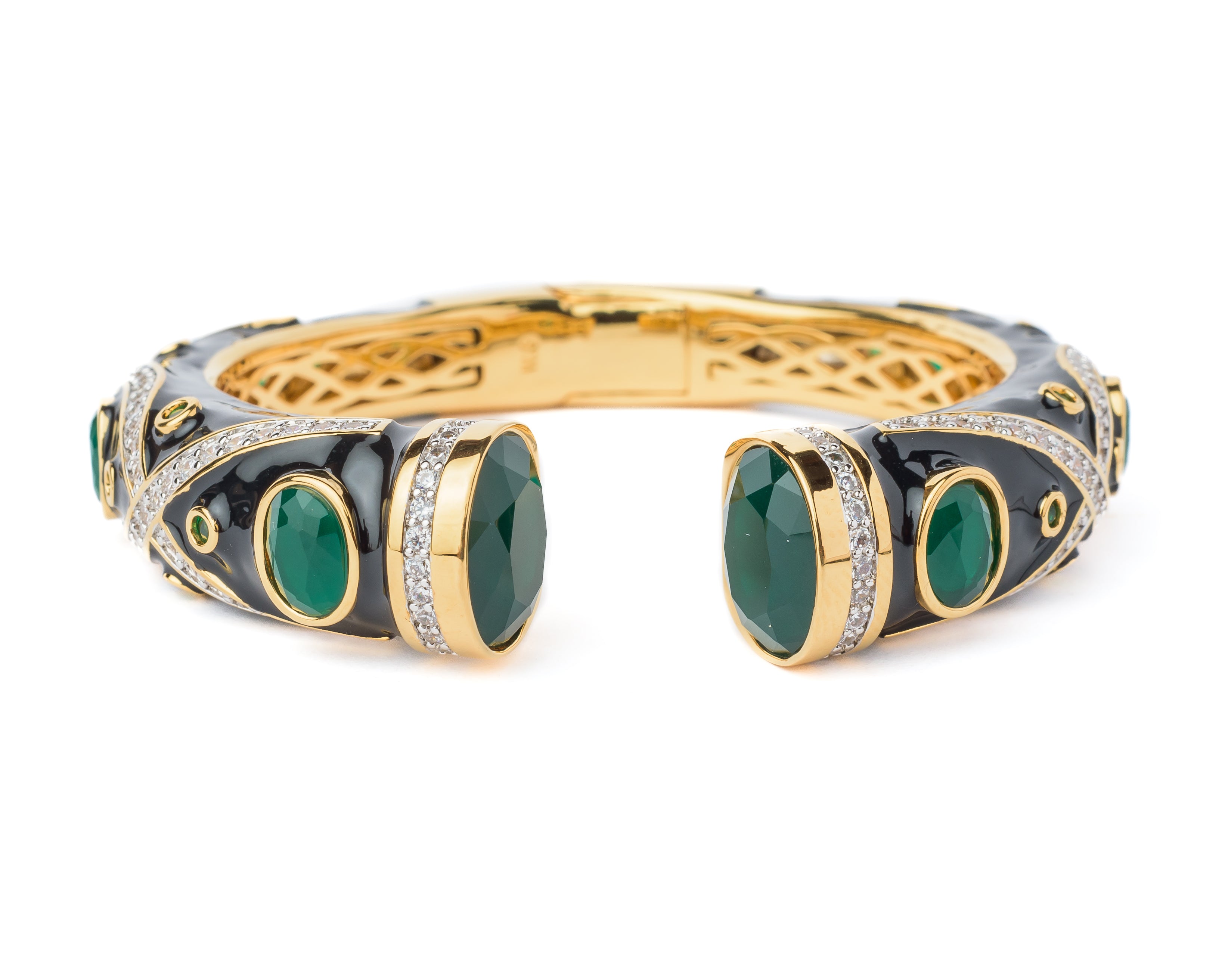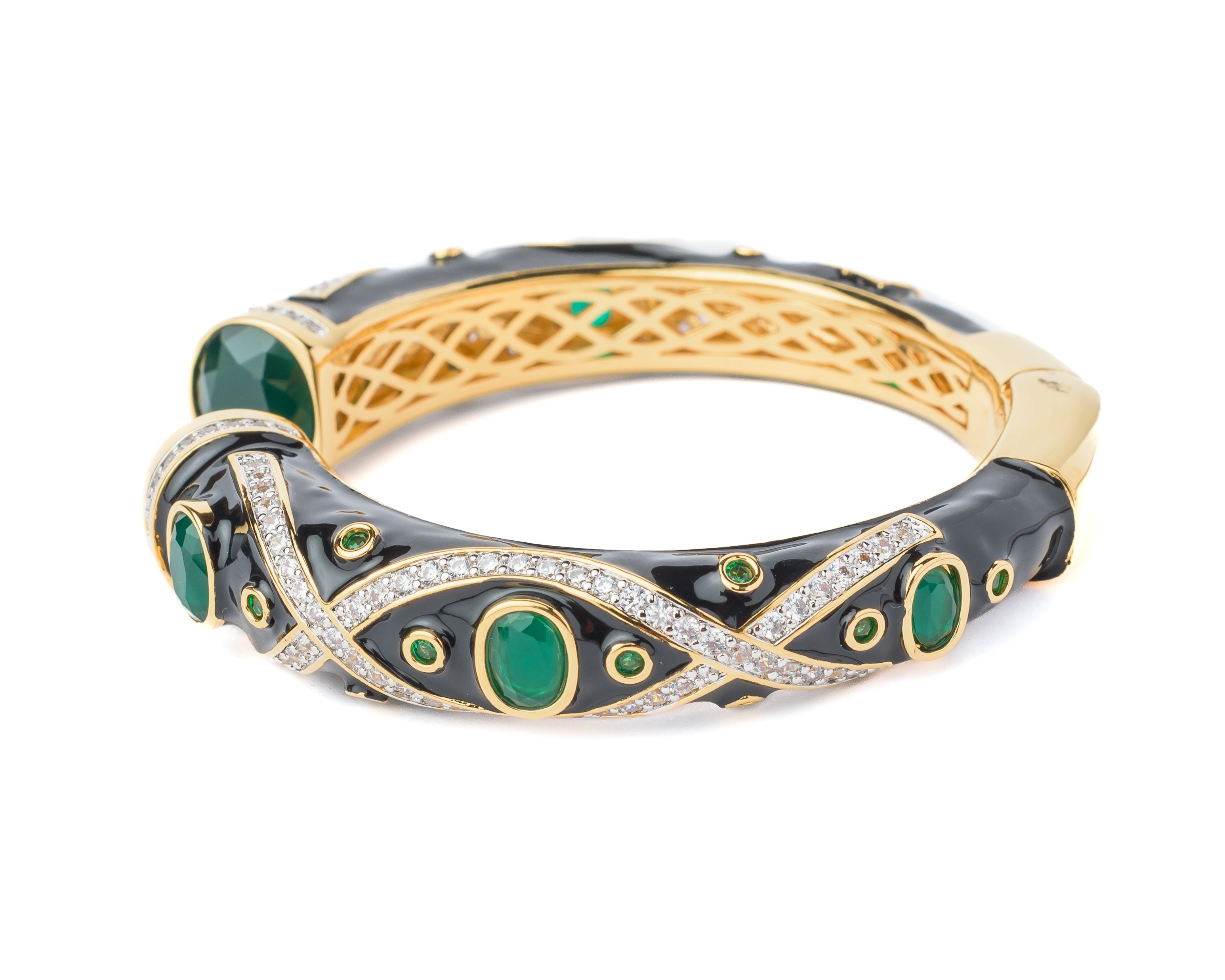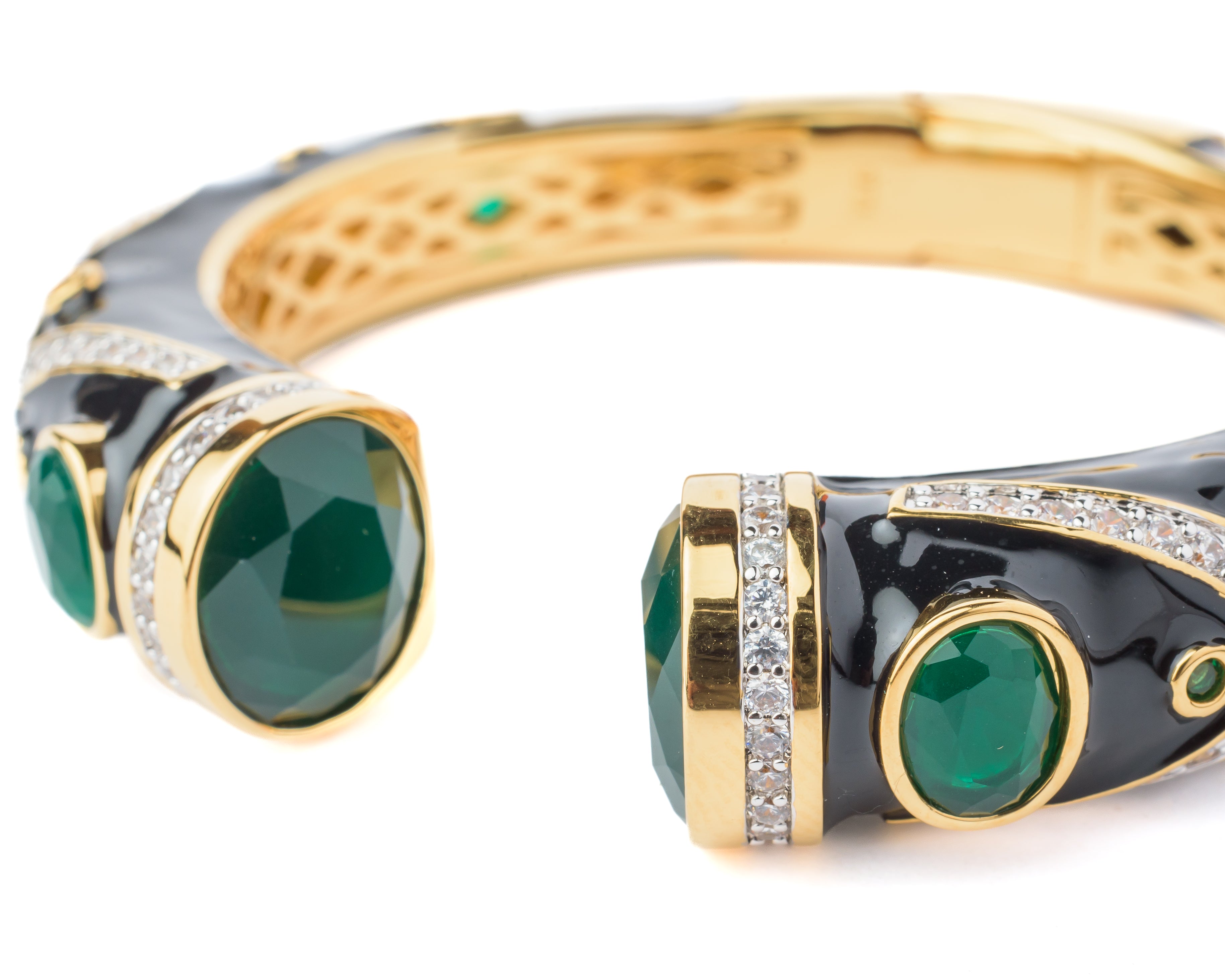 Elegant gold-toned bracelet with emerald green gemstones, black enamel detailing, and sparkling stones. A bold open cuff design, perfect for statement styling and festive occasions.