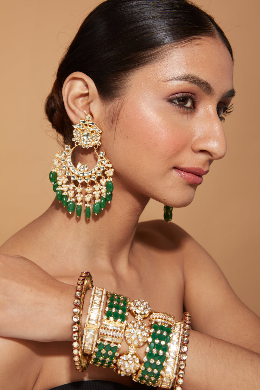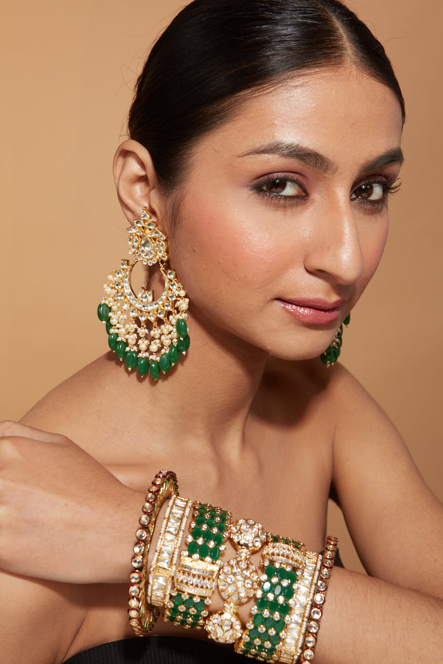 Elegant gold-tone earrings featuring intricate detailing and green gemstone embellishments. A perfect blend of traditional and modern design, ideal for weddings, festive occasions, or statement styling.