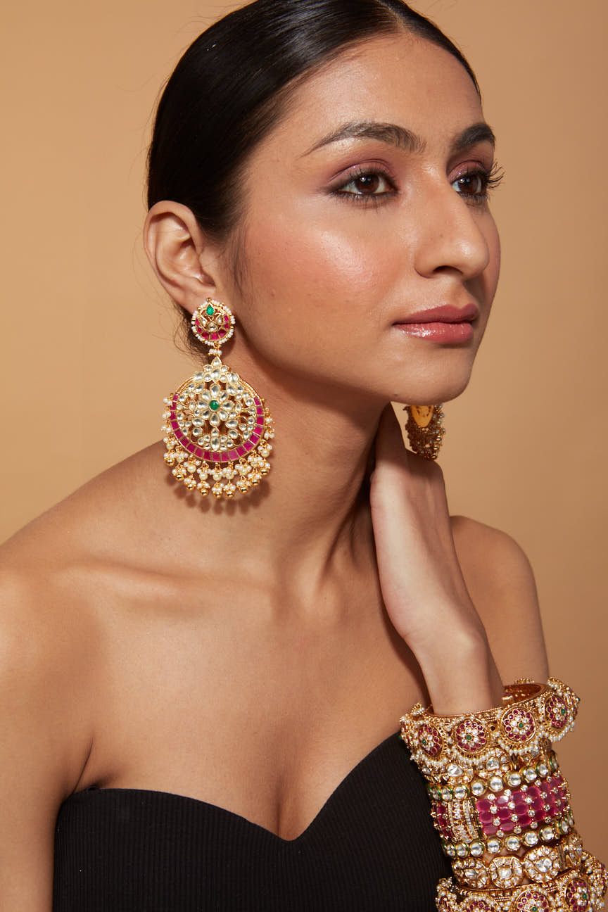 Elegant handcrafted earrings adorned with intricate gold-tone details, vibrant red and green gemstones, and delicate pearl embellishments. Perfect for weddings, festive occasions, or statement styling.