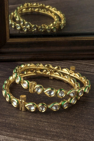 Add a touch of elegance with these gold-toned bangles, adorned with teardrop-shaped white stones and subtle green enamel accents. Perfect for weddings, festivals, or traditional celebrations.