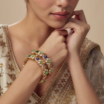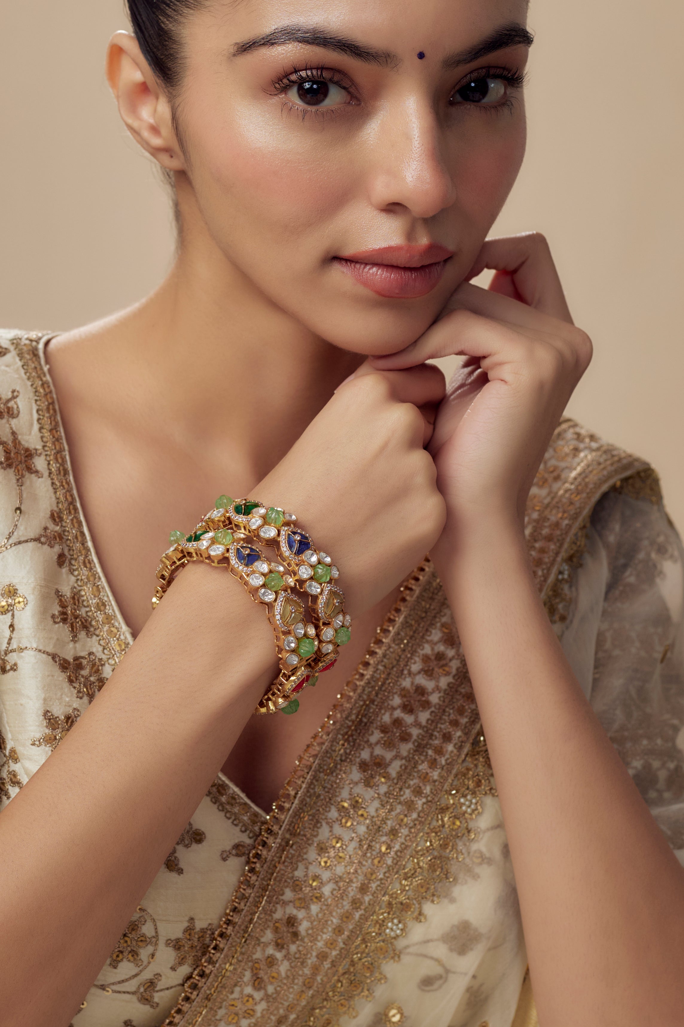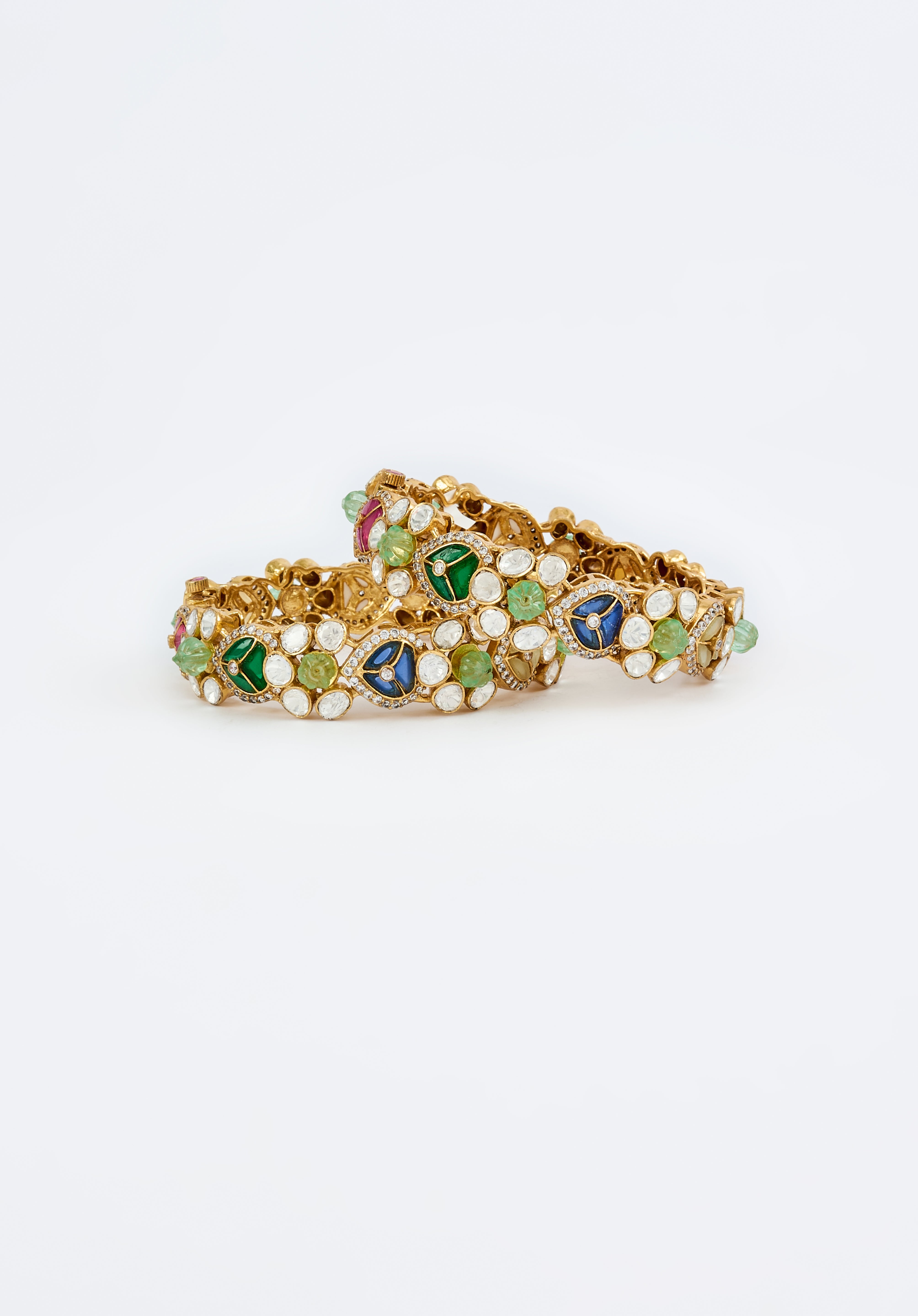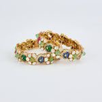 Exquisite gold-plated bracelets adorned with vibrant multicolored stones & pearls, showcasing a stunning blend of elegance and craftsmanship. Perfect for enhancing your traditional and festive attire.