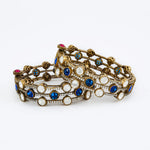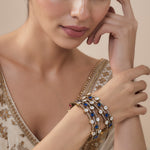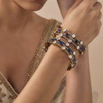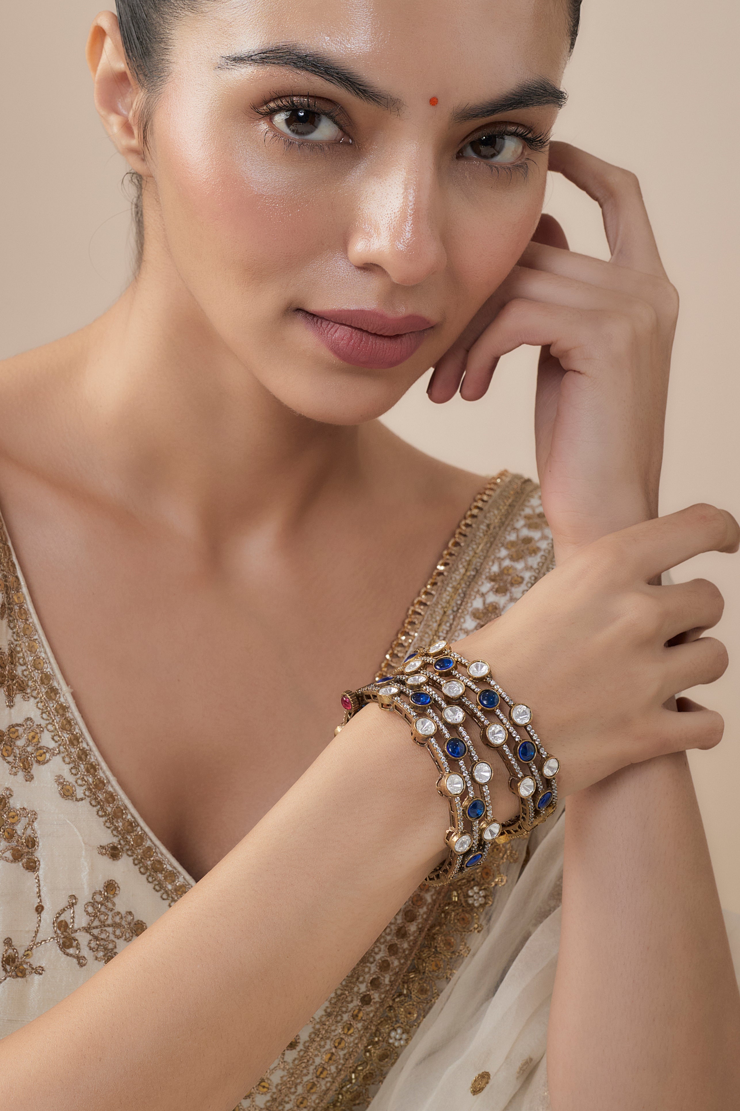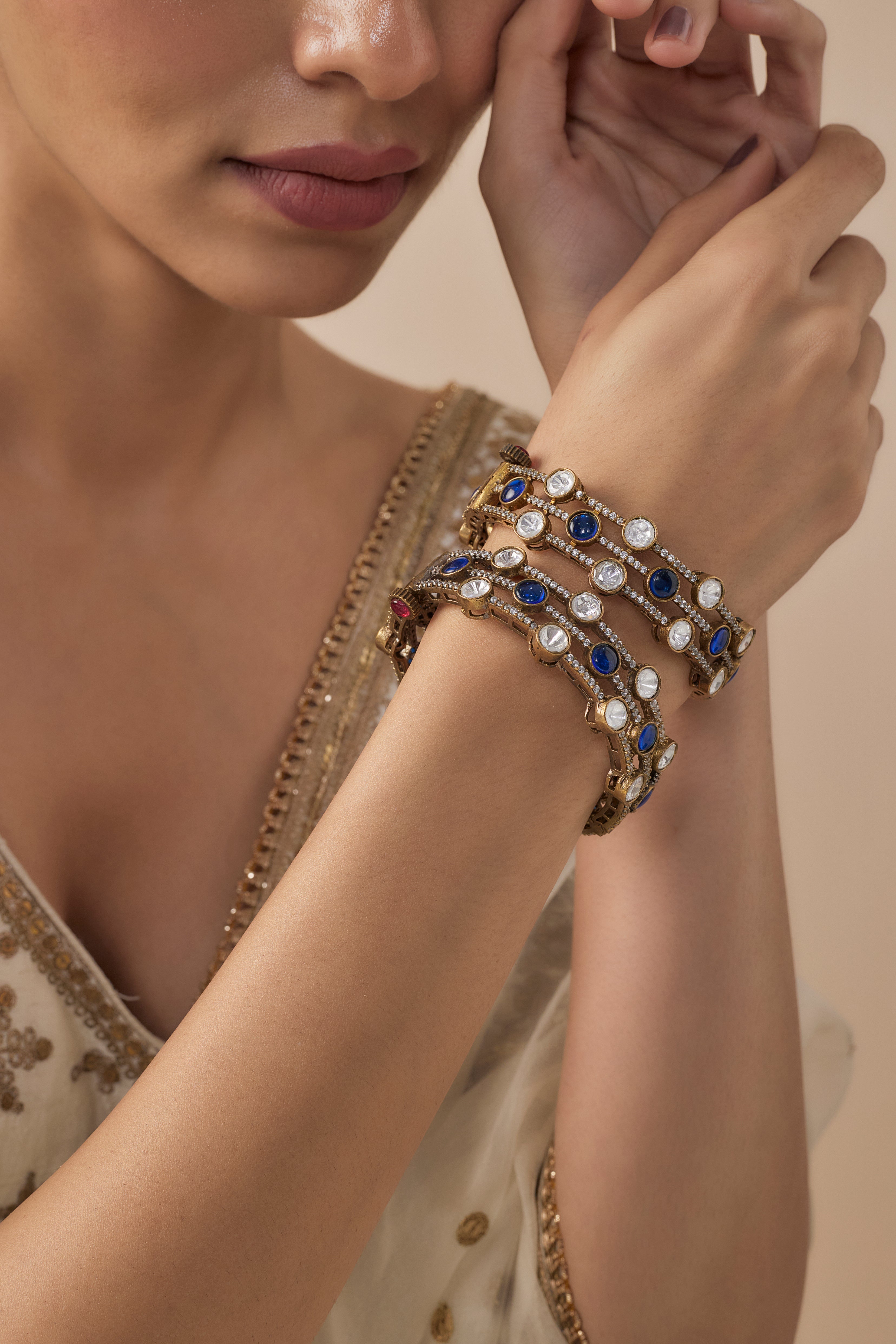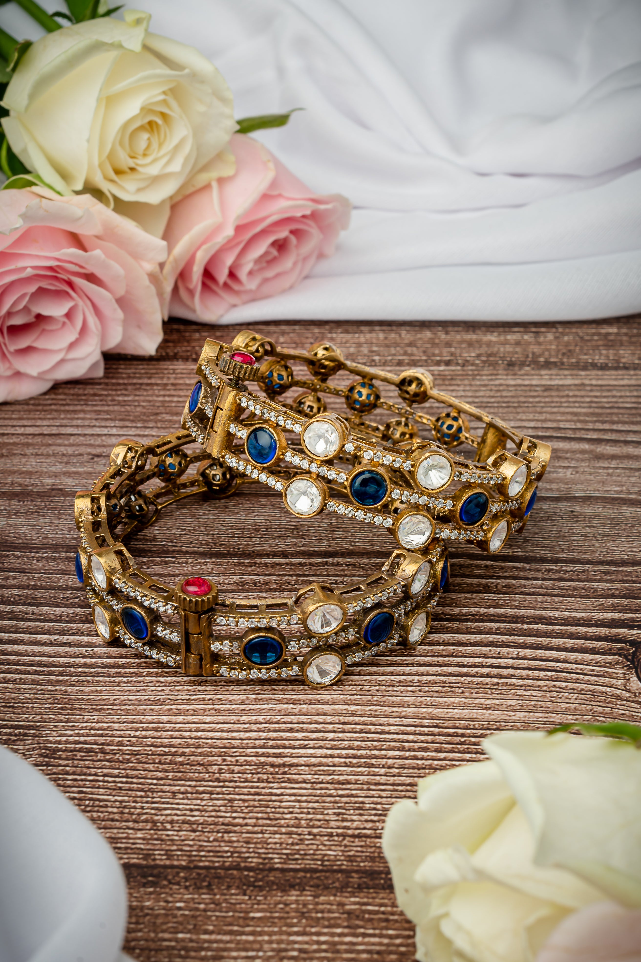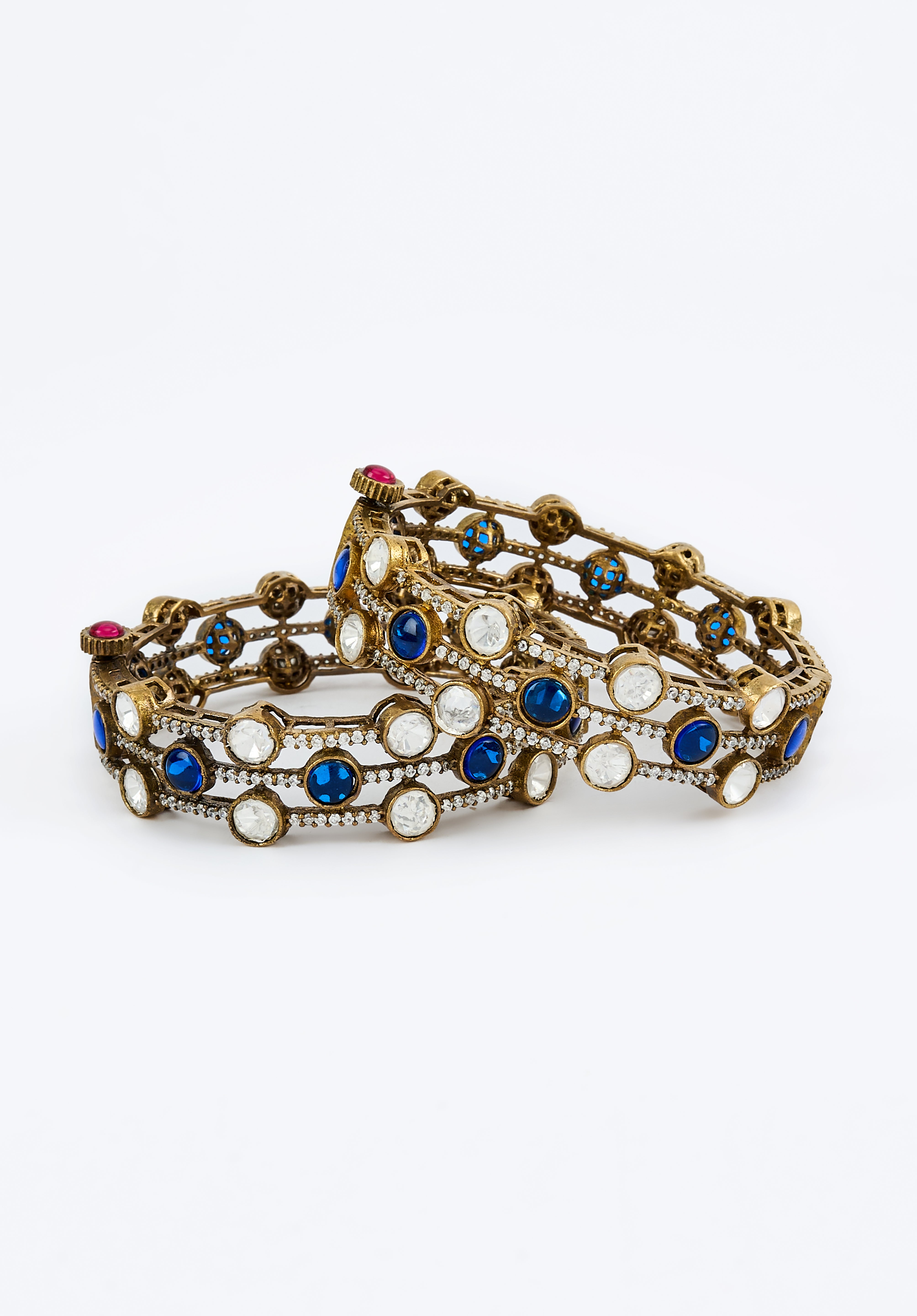 Elegant antique-inspired bangles adorned with vibrant blue & white stones. Exquisitely crafted with intricate detailing, these bangles are timeless accessory for traditional & contemporary alike.