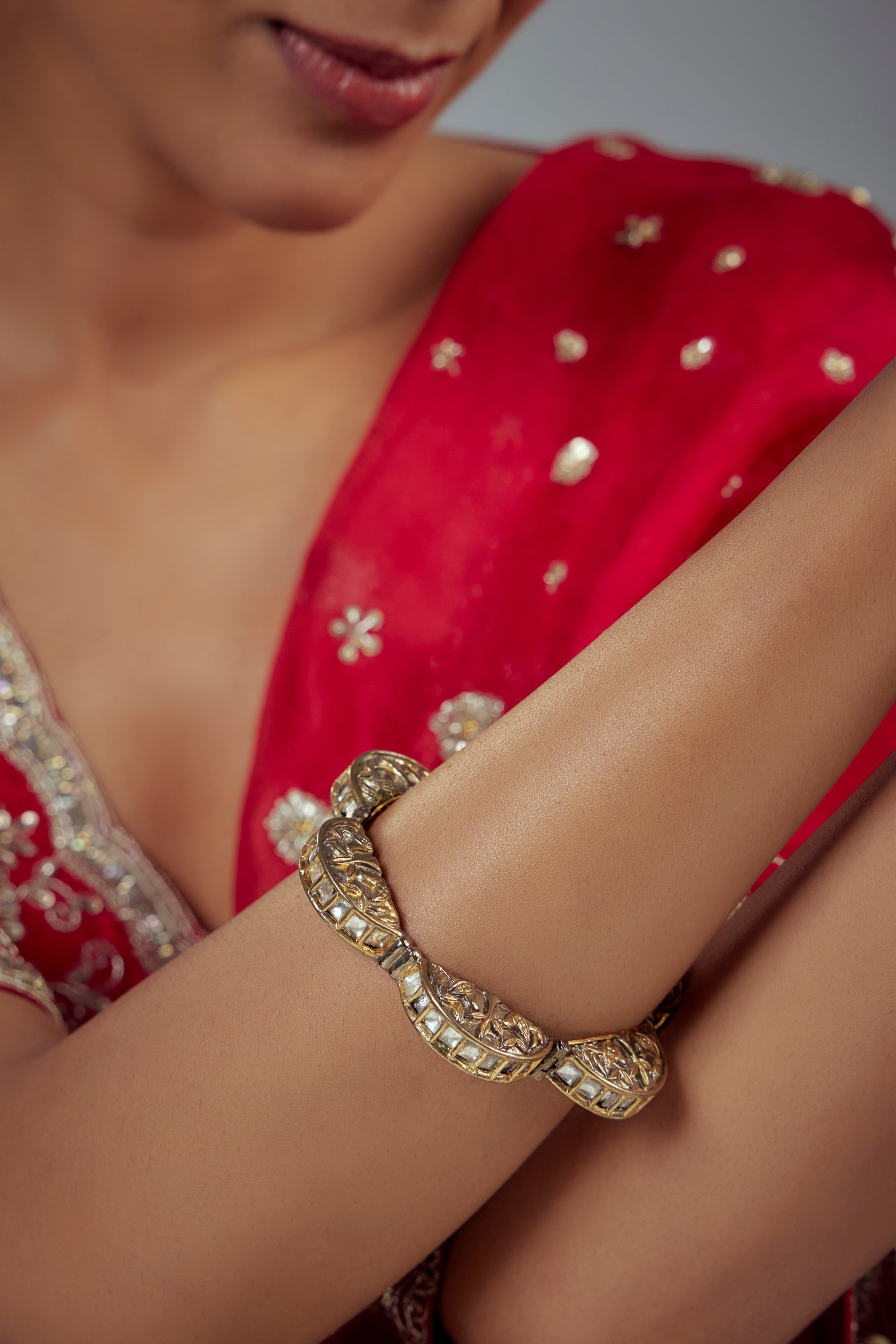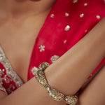 This image showcases an ornate gold bracelet with intricate patterns and studded white stones, complementing a vibrant red and gold embroidered traditional outfit, exuding elegance and cultural charm.