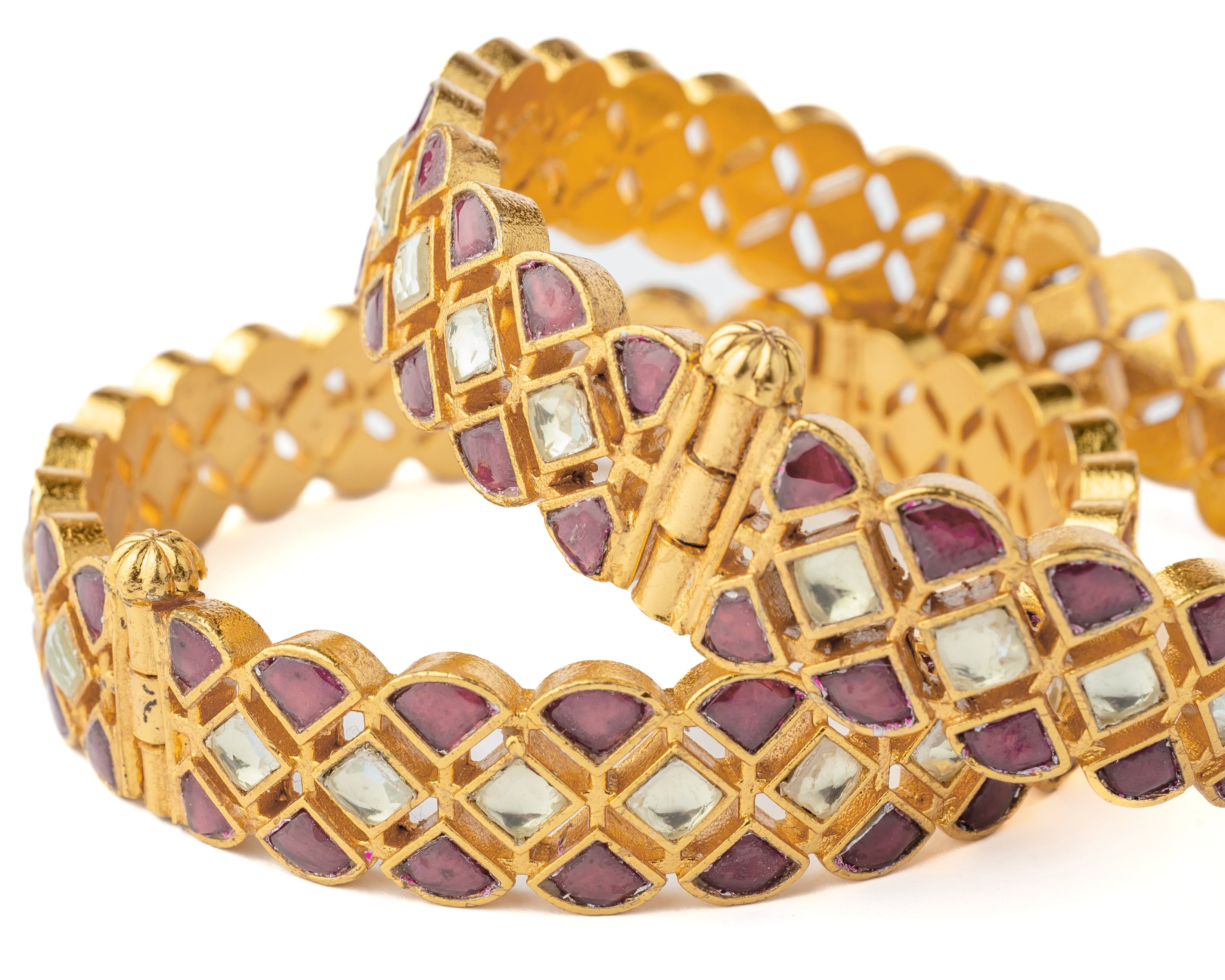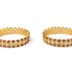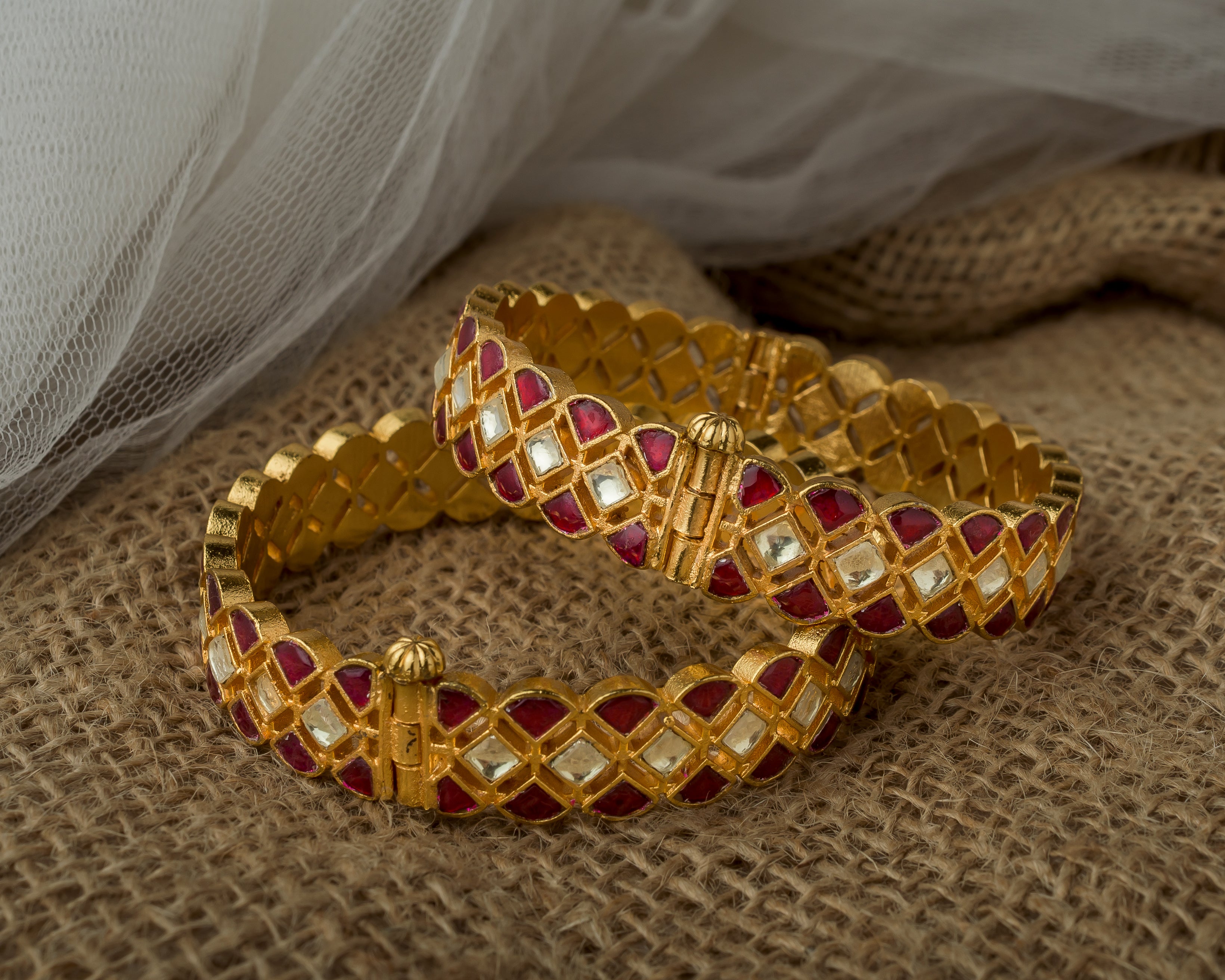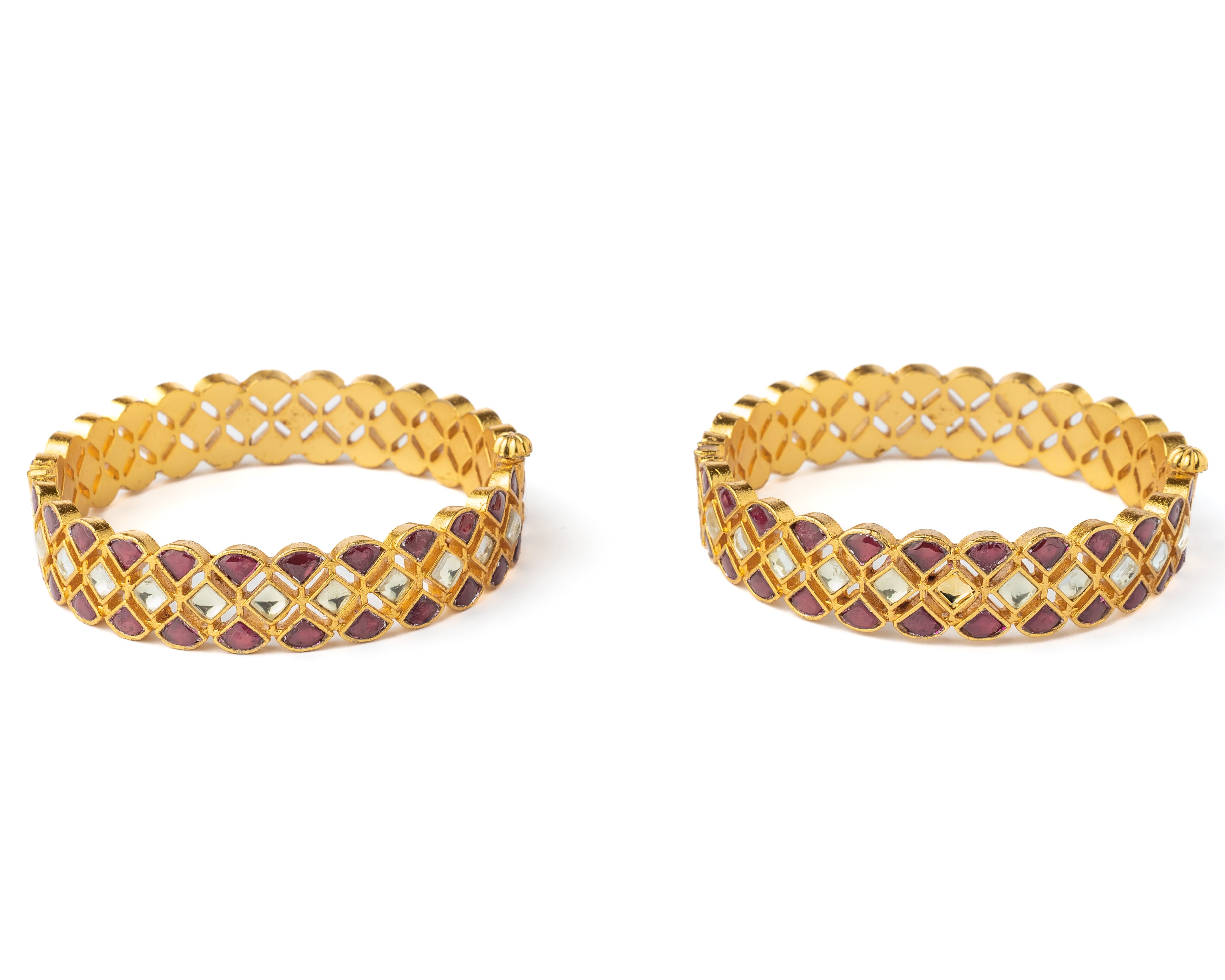 Elegant gold bangles with a lattice design, adorned with red and white gemstones for a royal, timeless look.