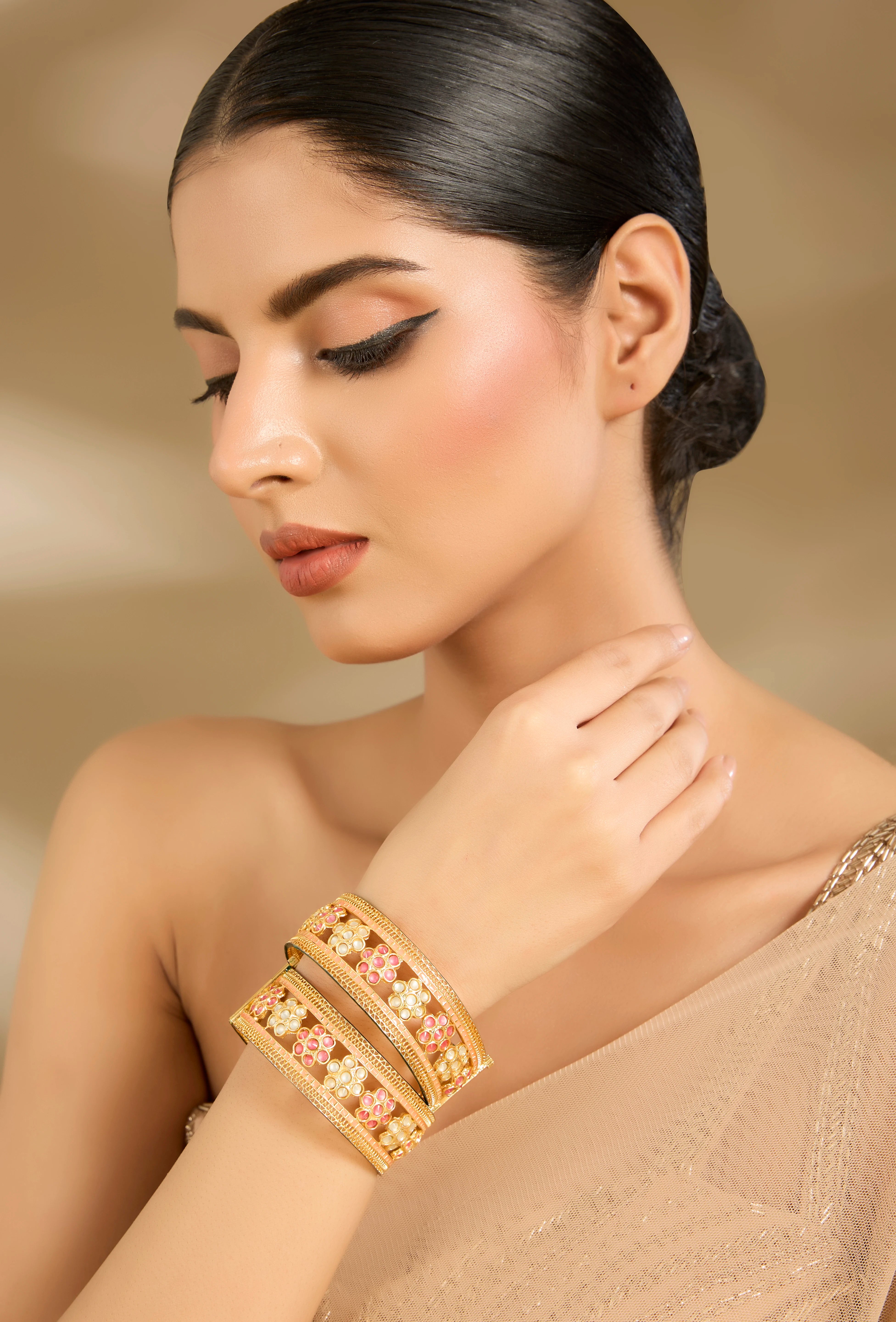 Gold Plated Pink Womens Kundan & Polki Bracelet