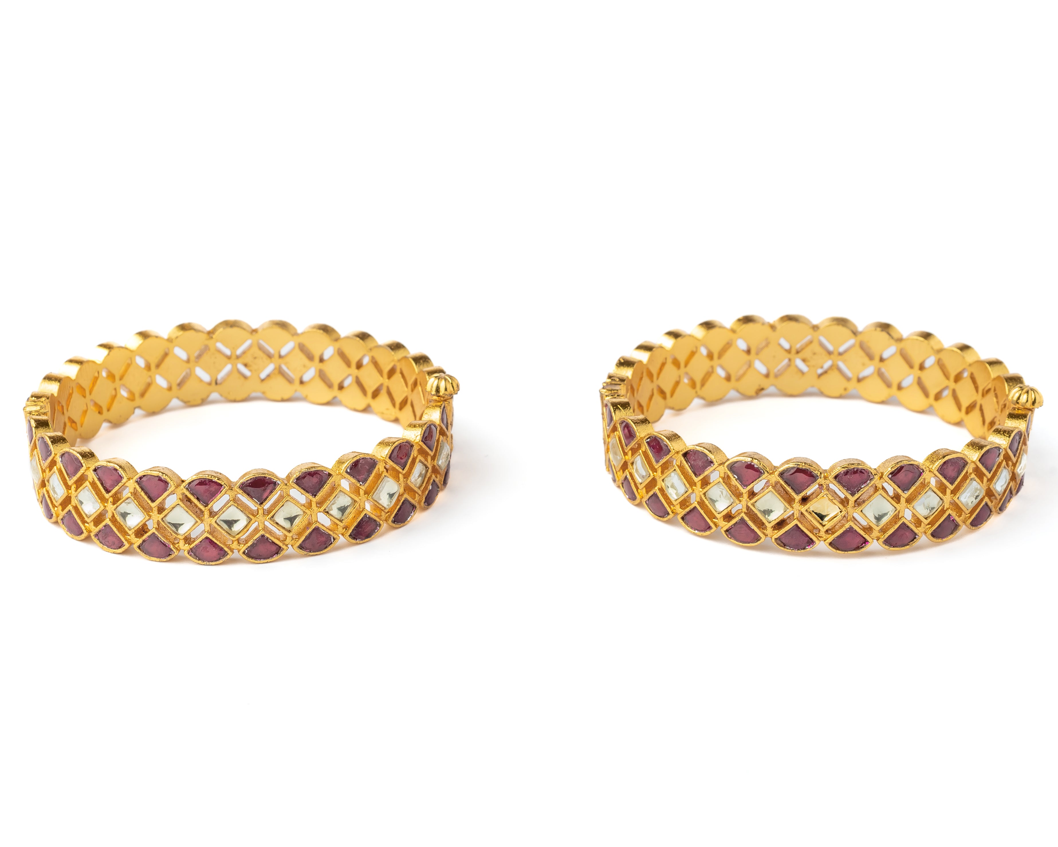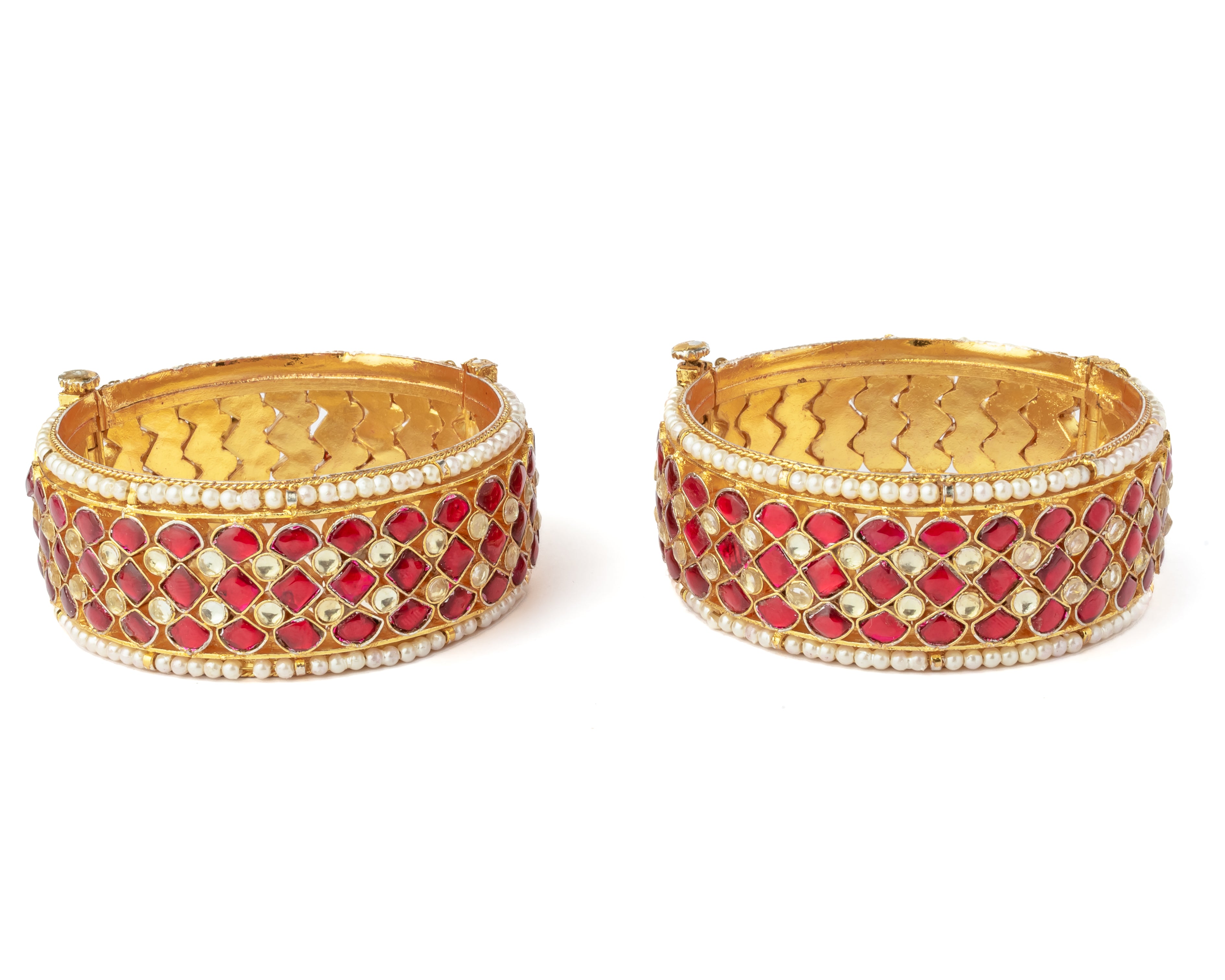 Gold Plated Red Womens Kundan, Polki Pair of Bangle