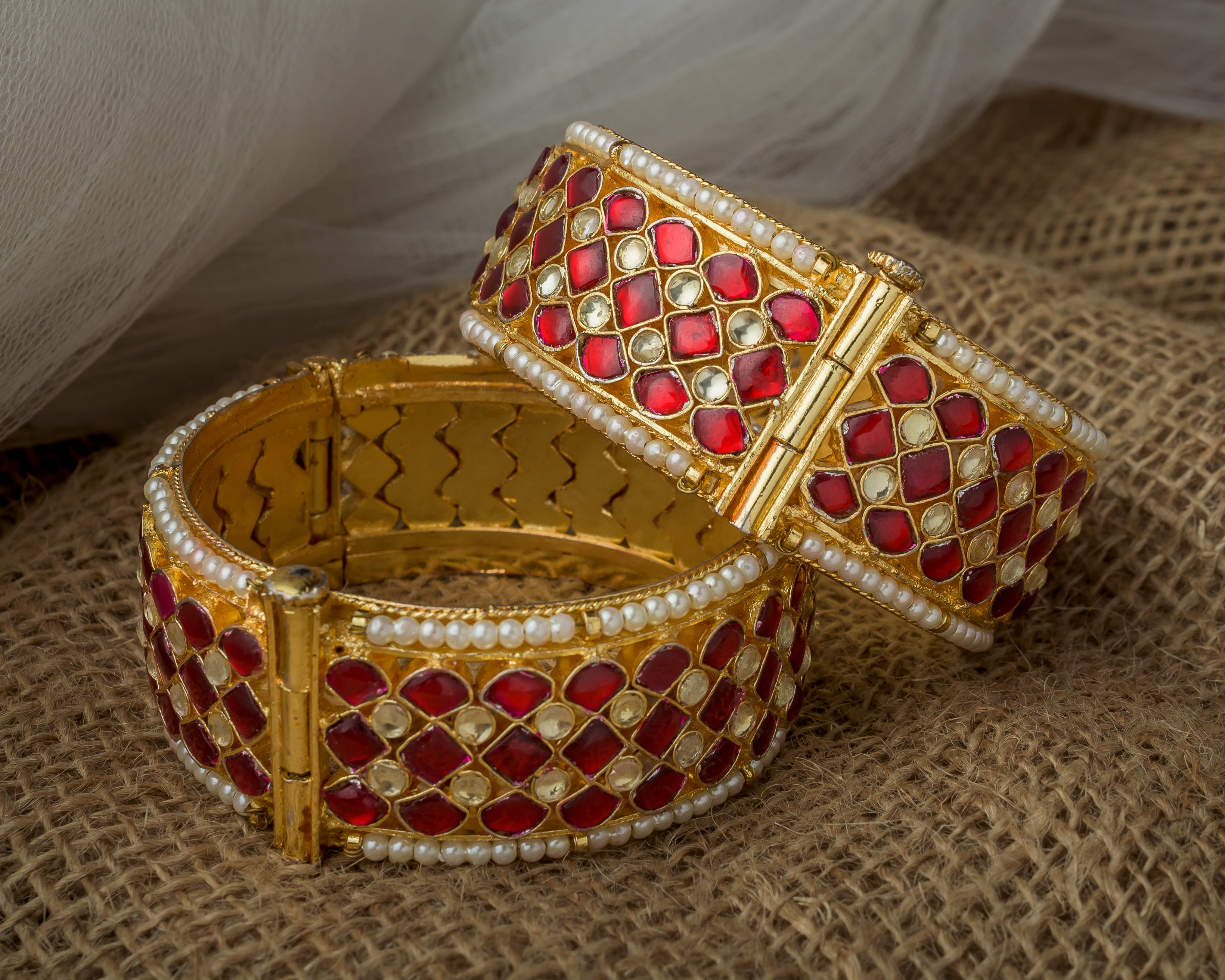 Gold Plated Red Womens Kundan, Polki Pair of bangles