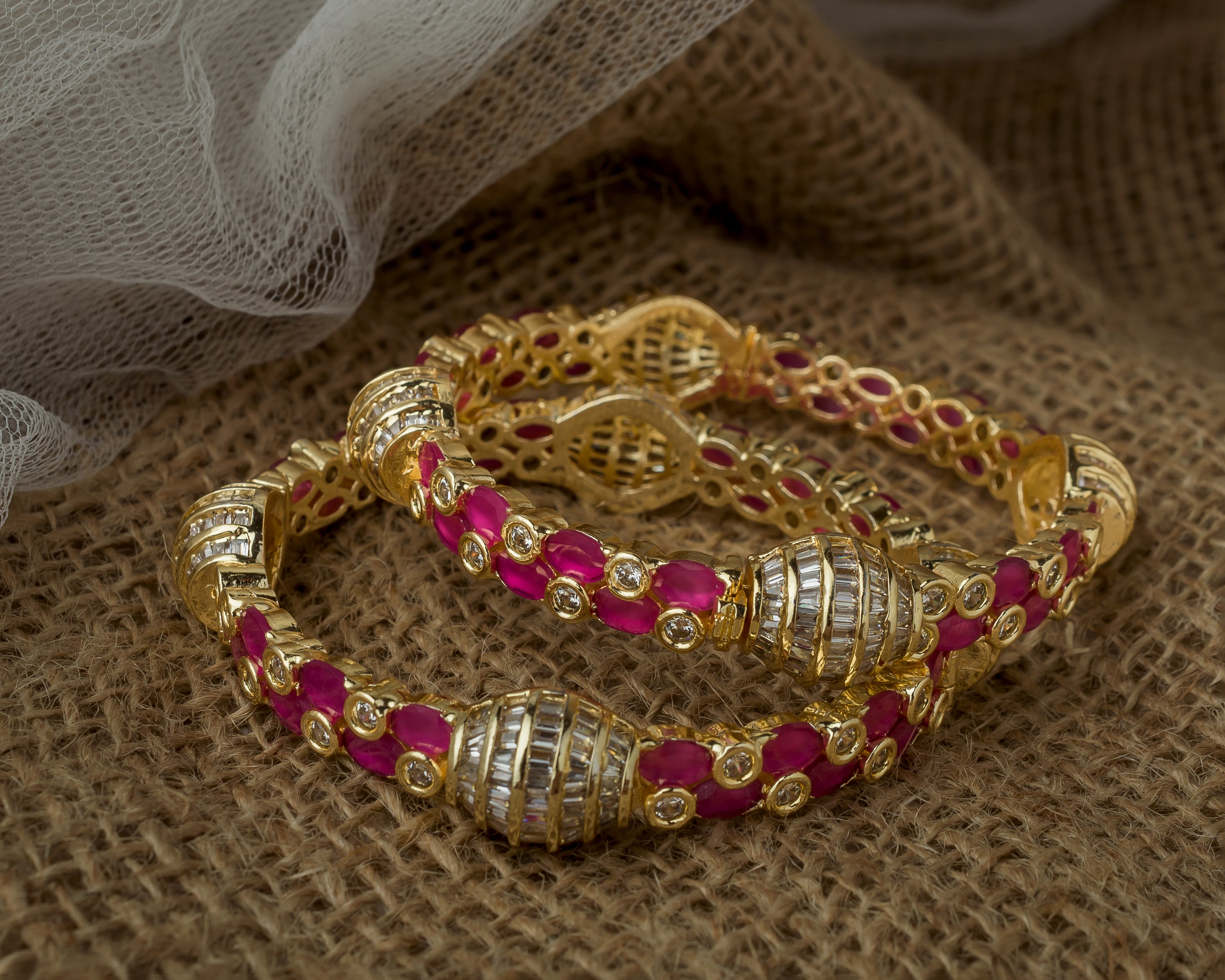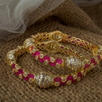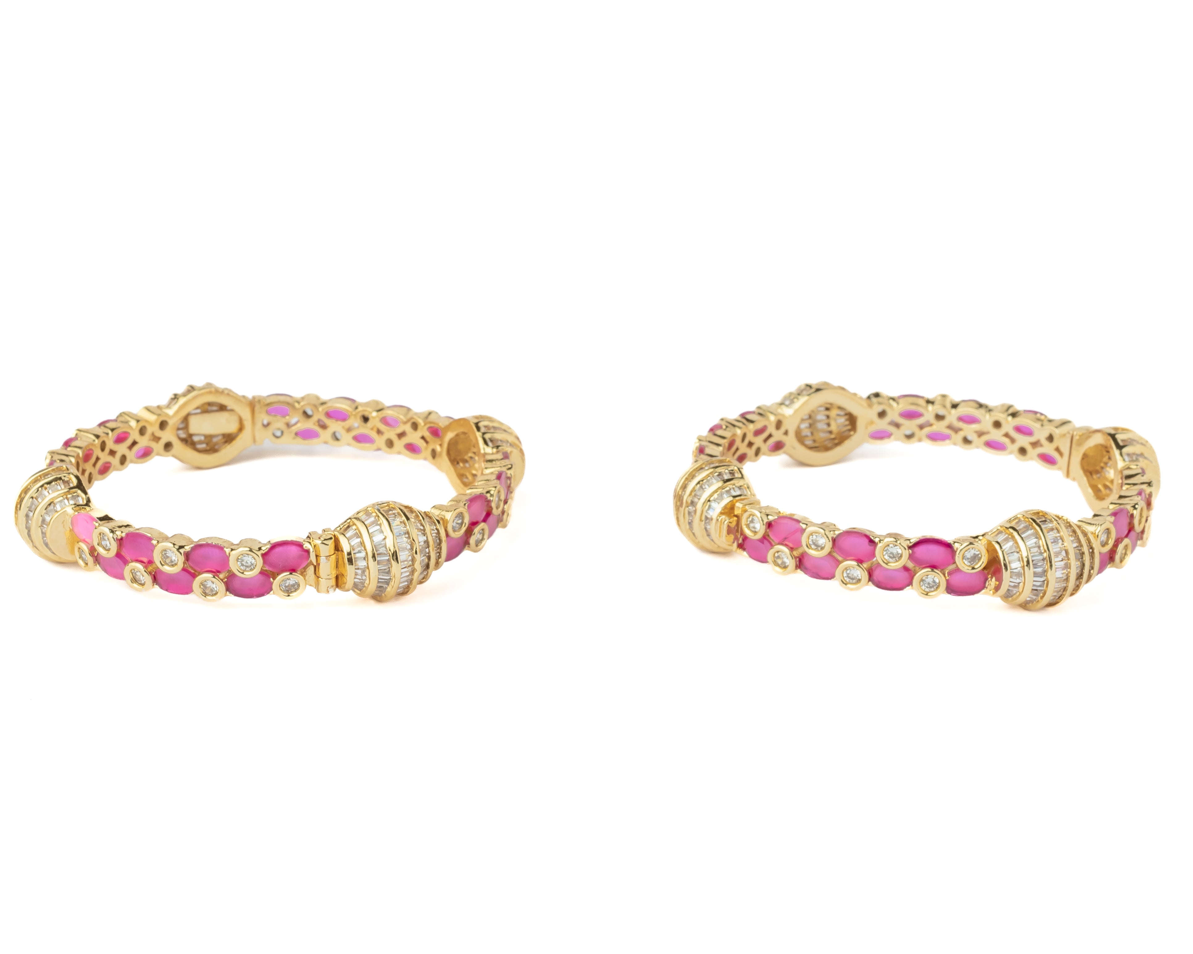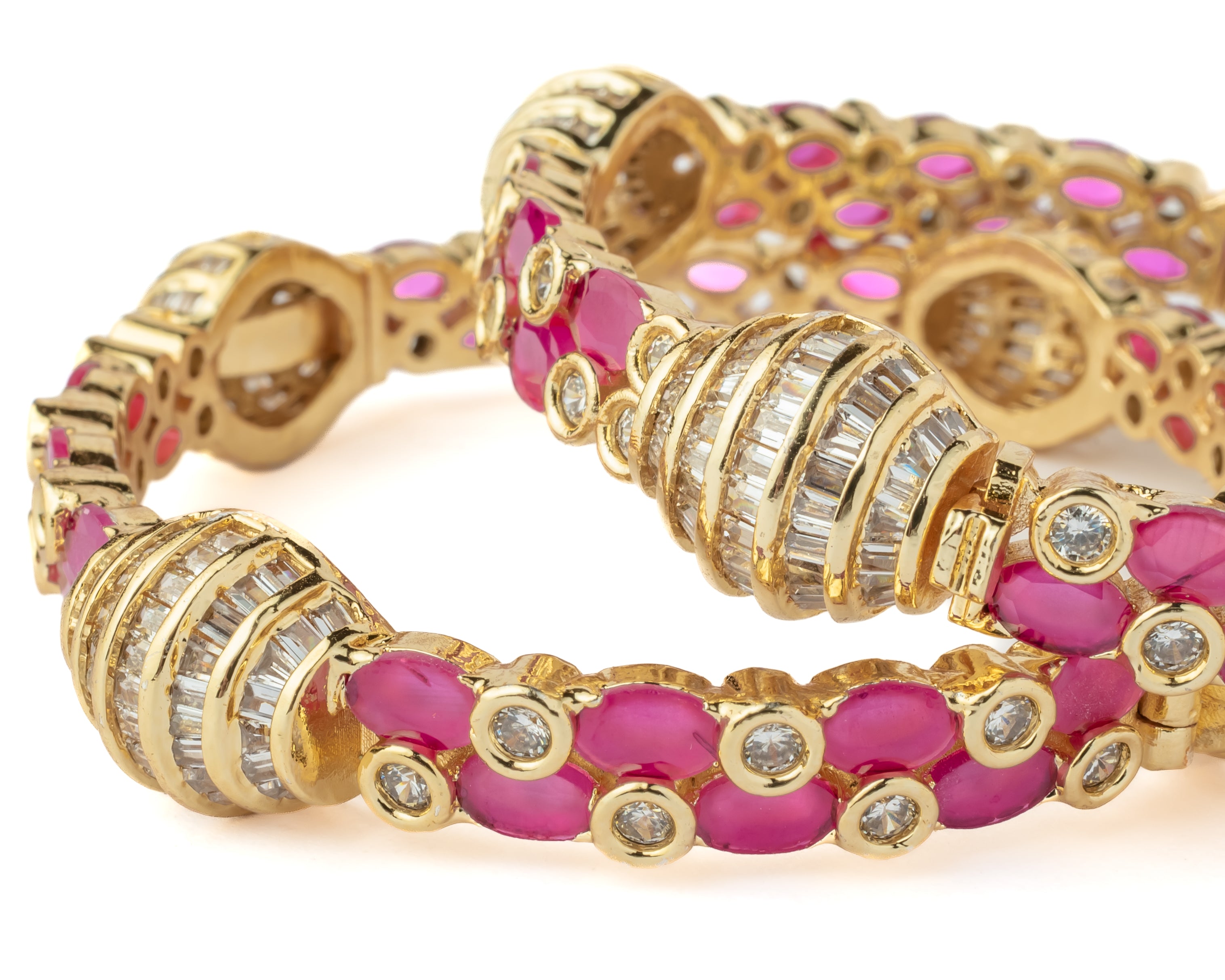 Elegant gold-finish bangles adorned with dazzling white stones and vibrant pink accents. A perfect blend of tradition and modernity, ideal for special occasions and everyday glamour.