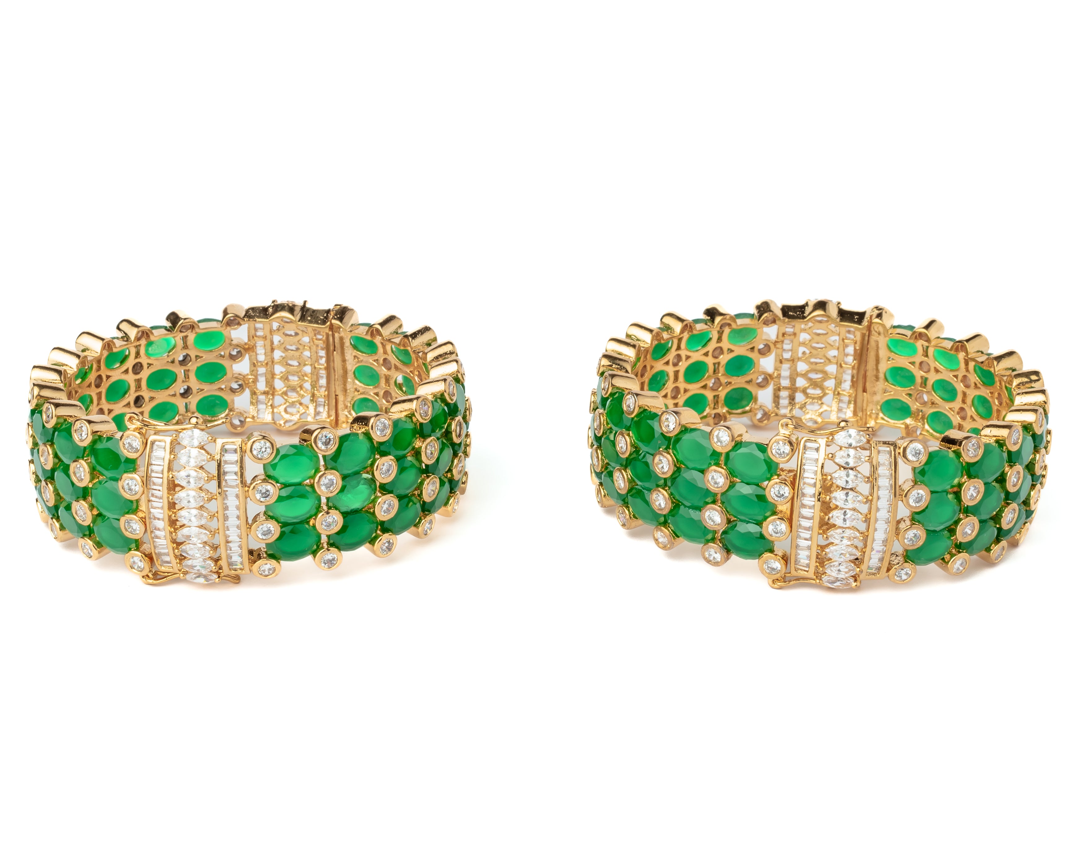 Elegant gold-plated bangles adorned with vibrant green stones and sparkling white embellishments. A perfect blend of tradition and luxury, ideal for weddings and festive occasions.