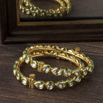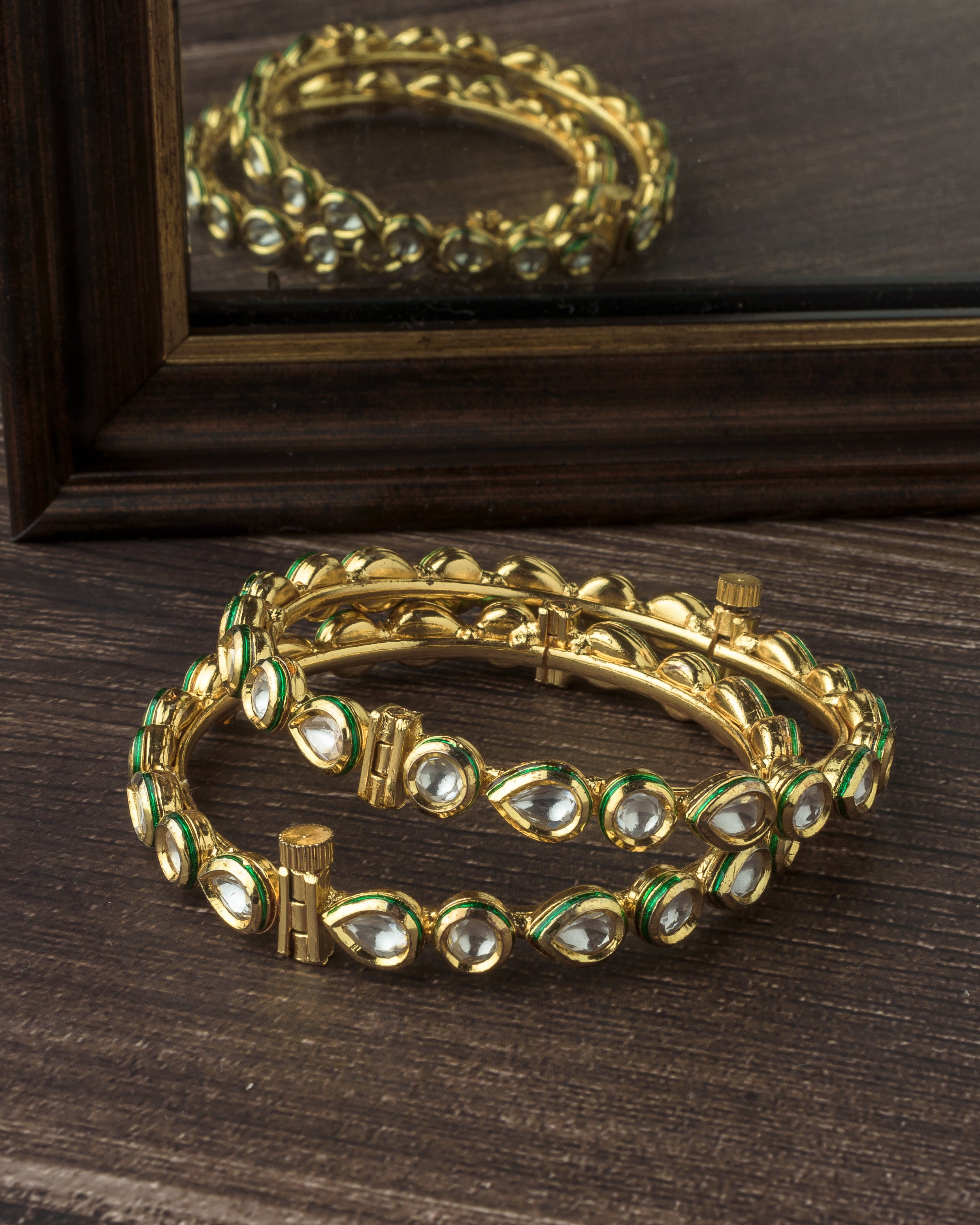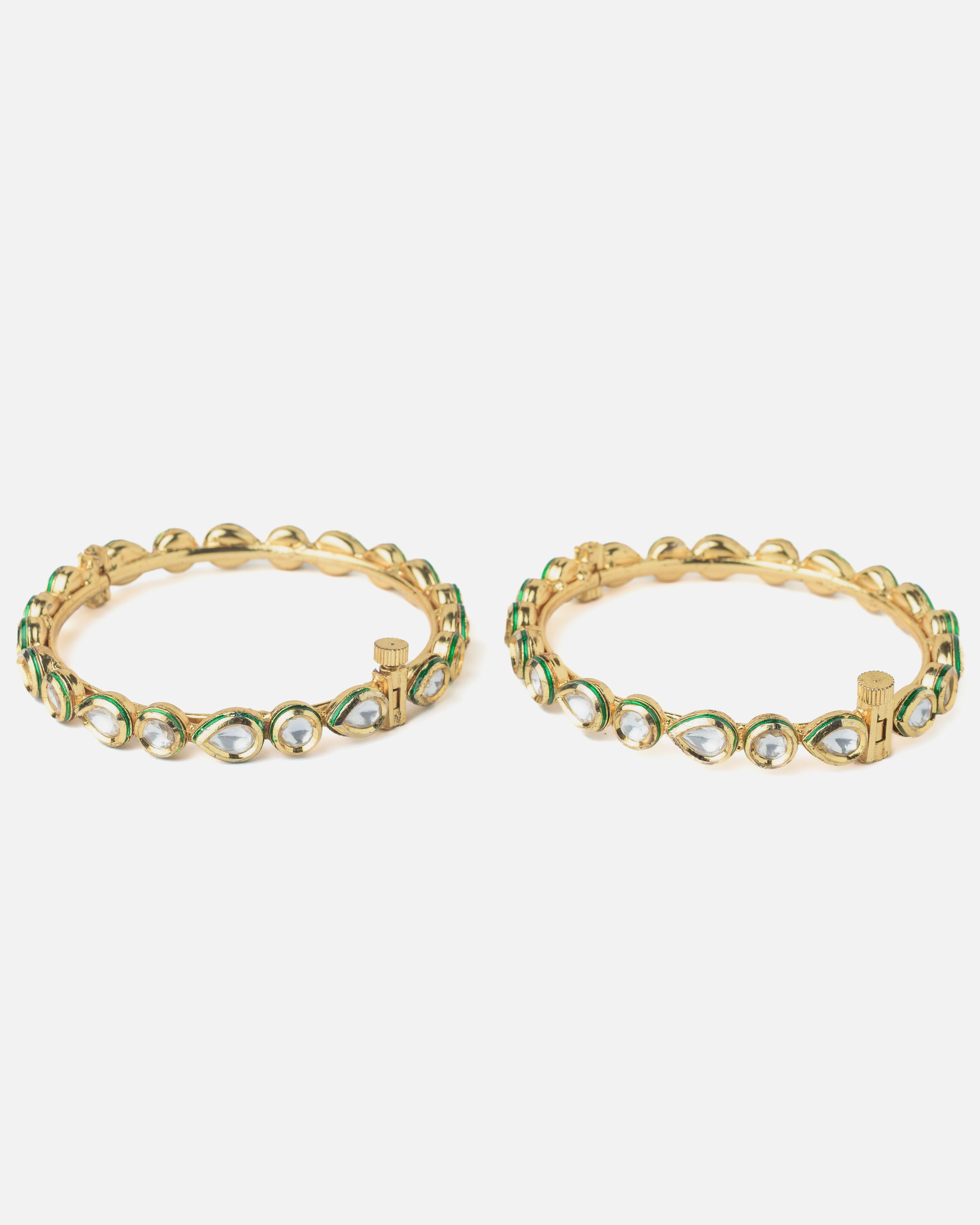 Add a touch of elegance with these gold-toned bangles, adorned with teardrop-shaped white stones and subtle green enamel accents. Perfect for weddings, festivals, or traditional celebrations.