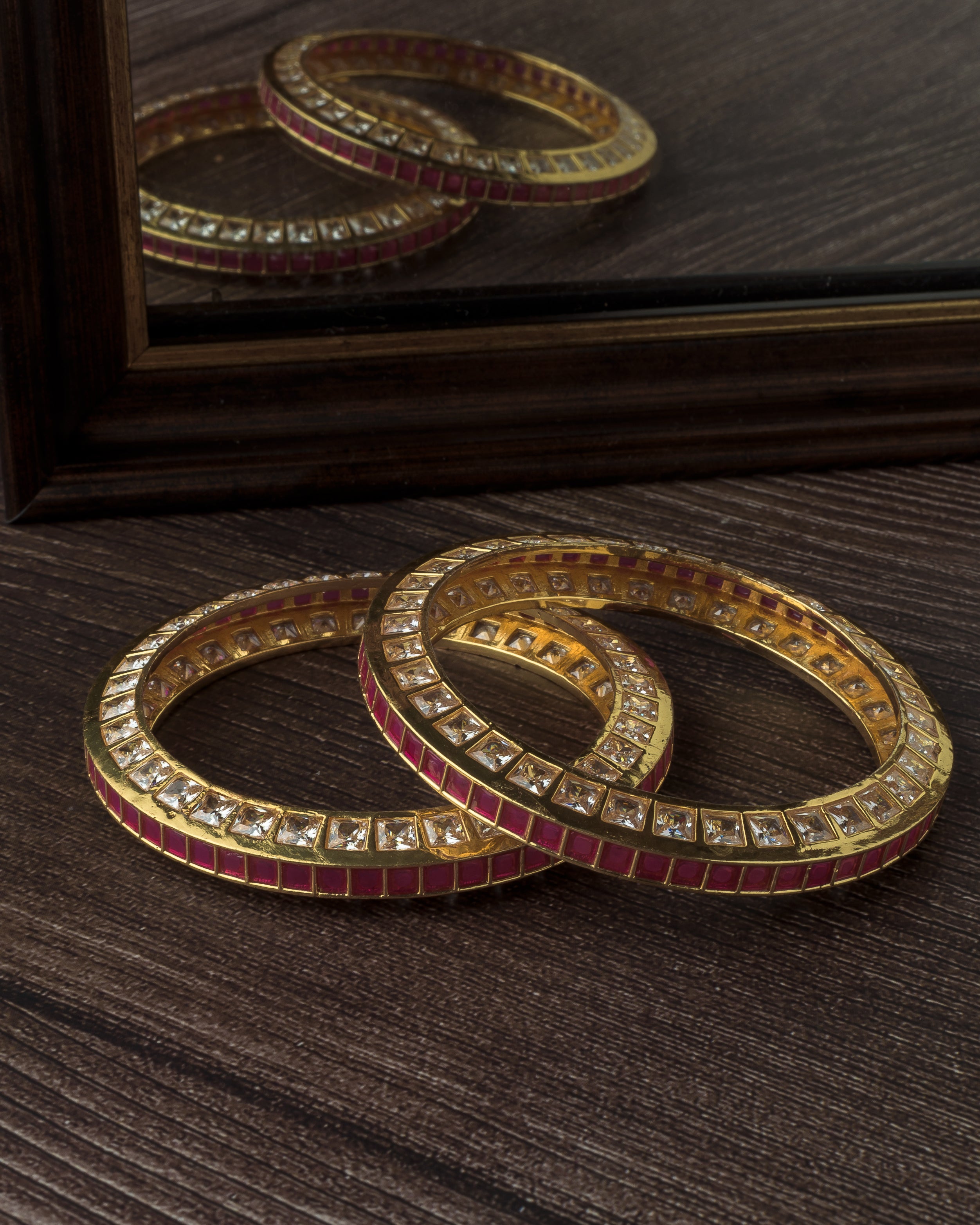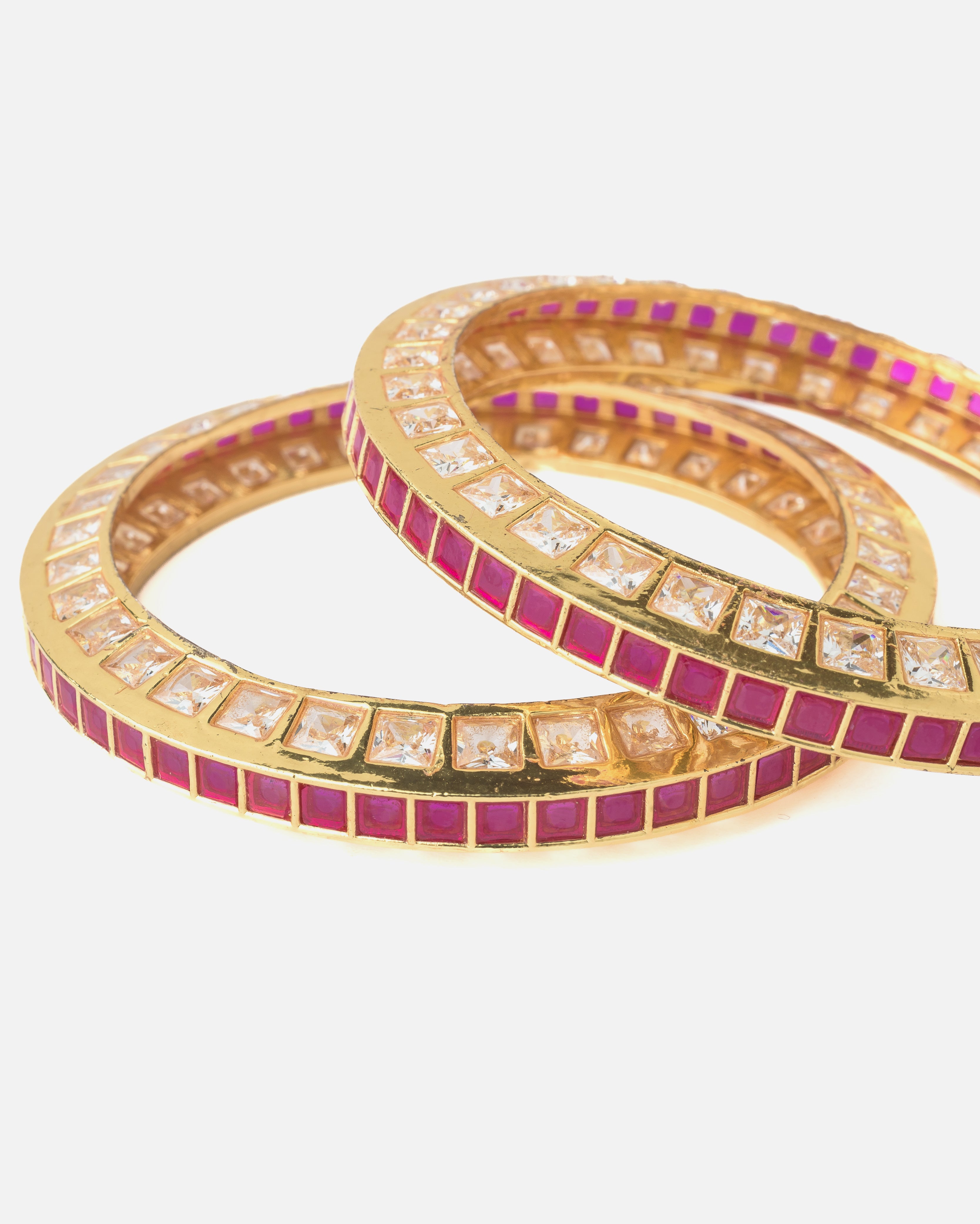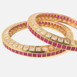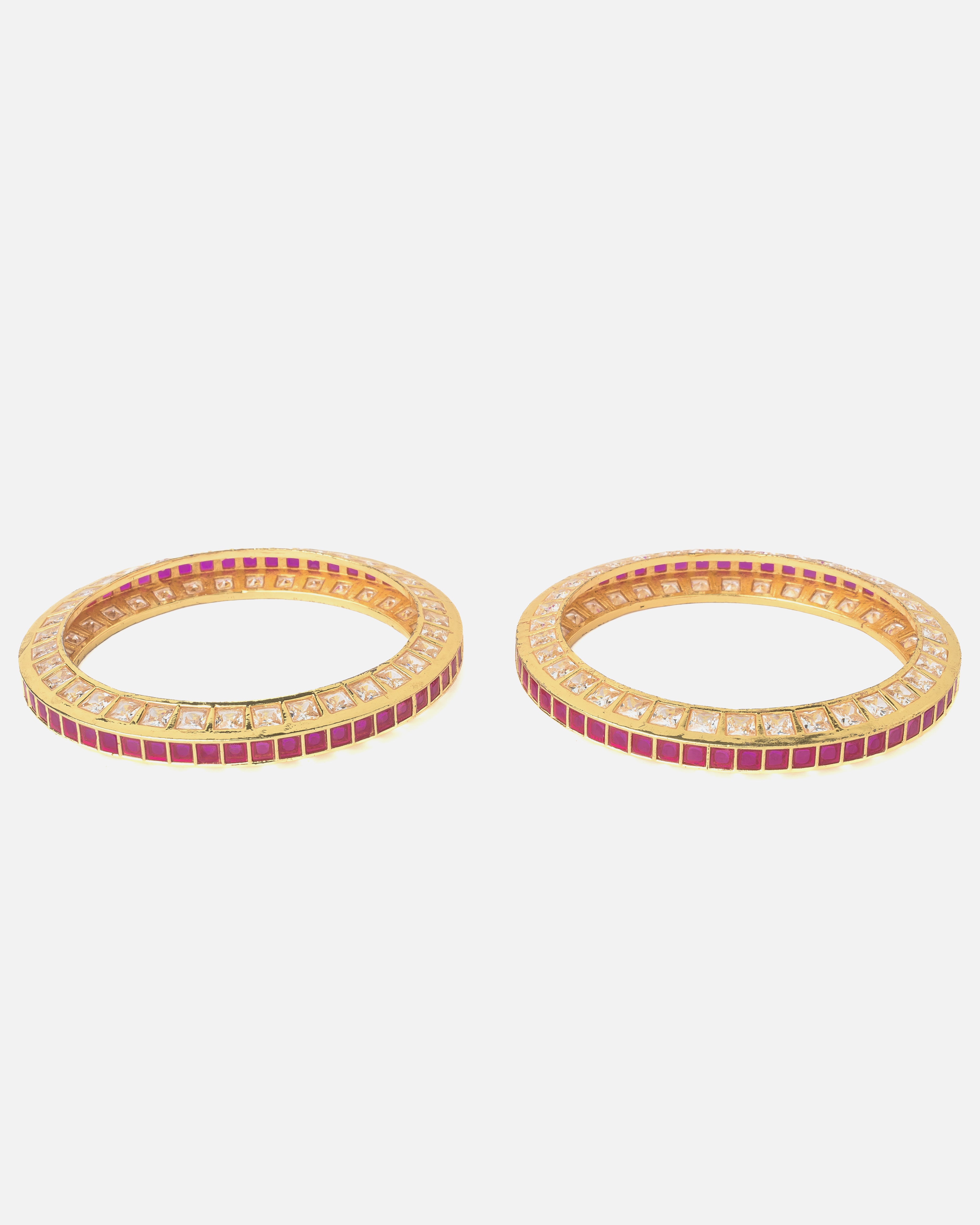 Elegant gold-tone bangles adorned with square-cut pink and white stones, perfect for festive and traditional occasions. A stunning blend of modern sparkle and ethnic charm for timeless appeal.