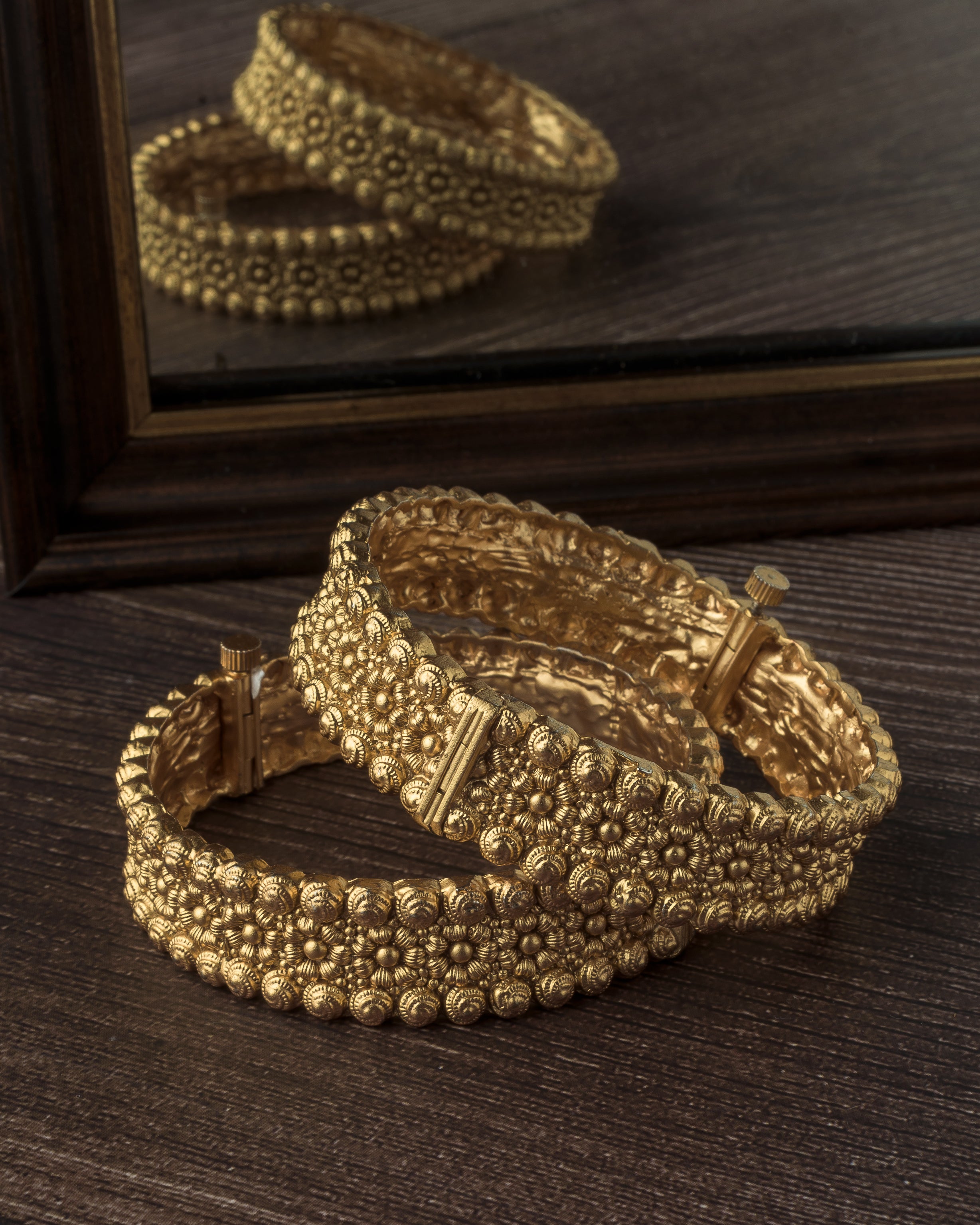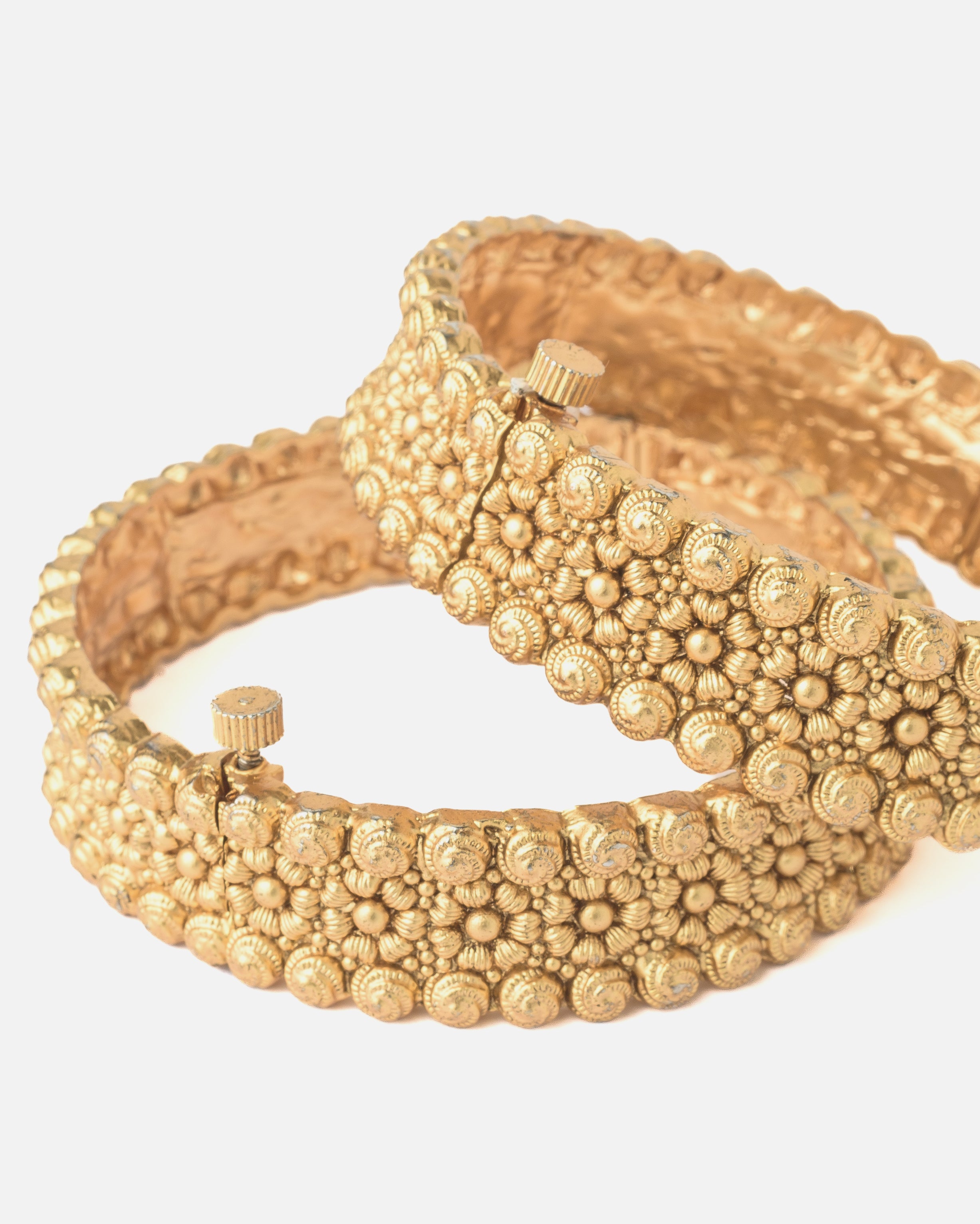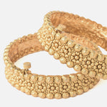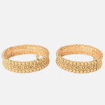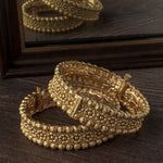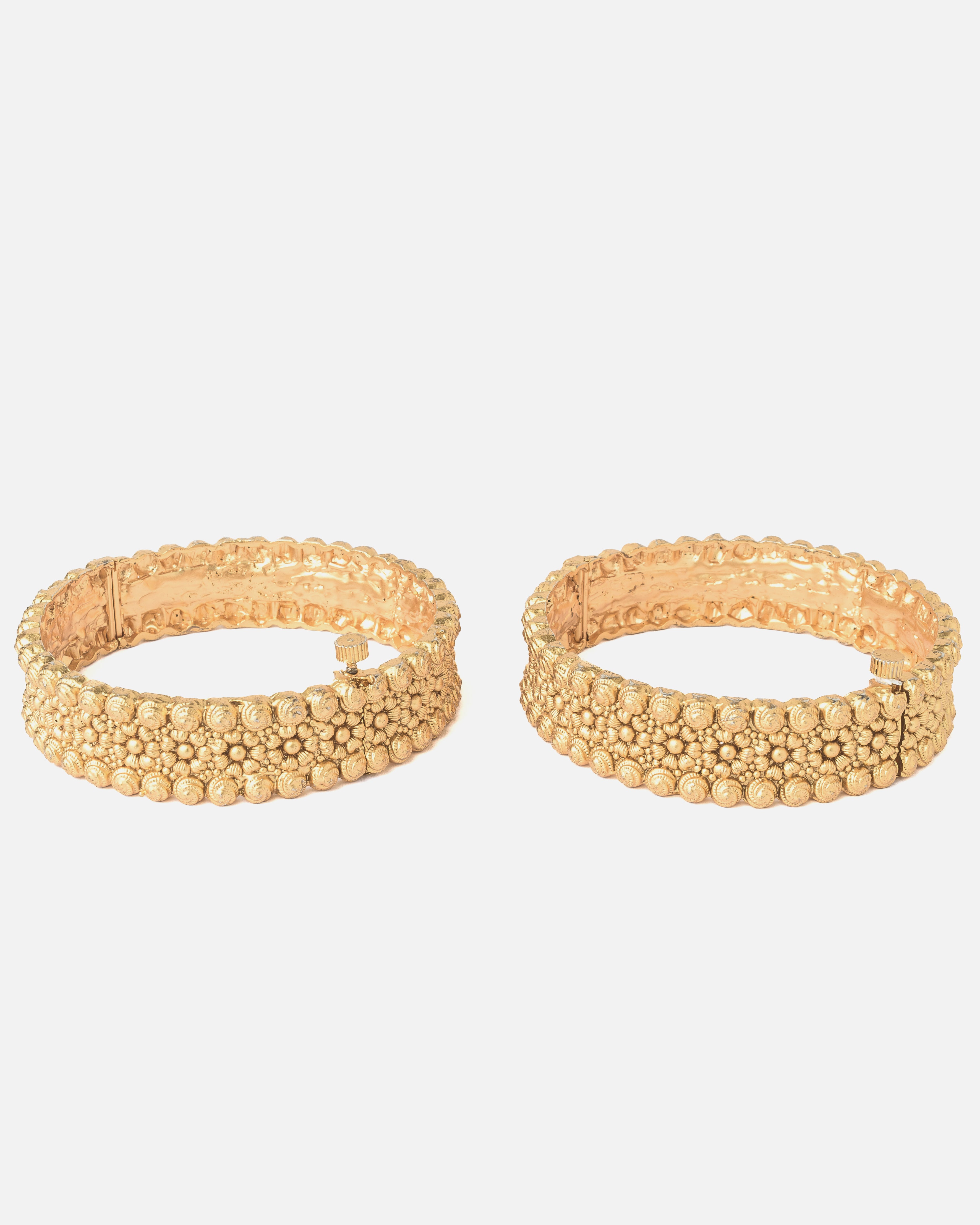 Make a bold statement with these traditional gold-finish bangles, featuring intricate dome-shaped motifs. Their antique texture and rich craftsmanship make them perfect for festive and bridal occasions.