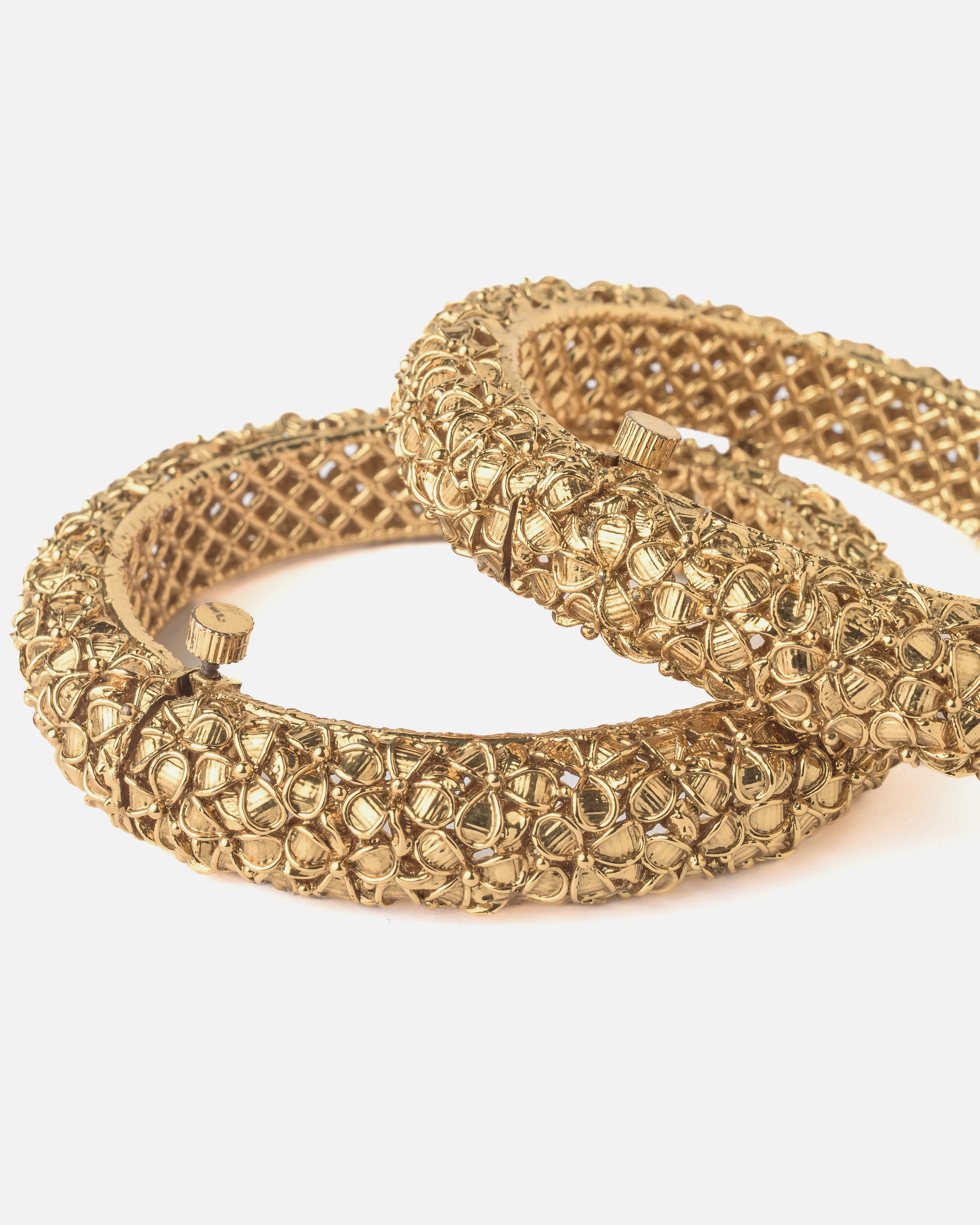 Intricately designed gold-toned bangles with a textured, lattice-like pattern. These elegant pieces add traditional charm and are perfect for festive and ethnic wear, offering a timeless appeal.
