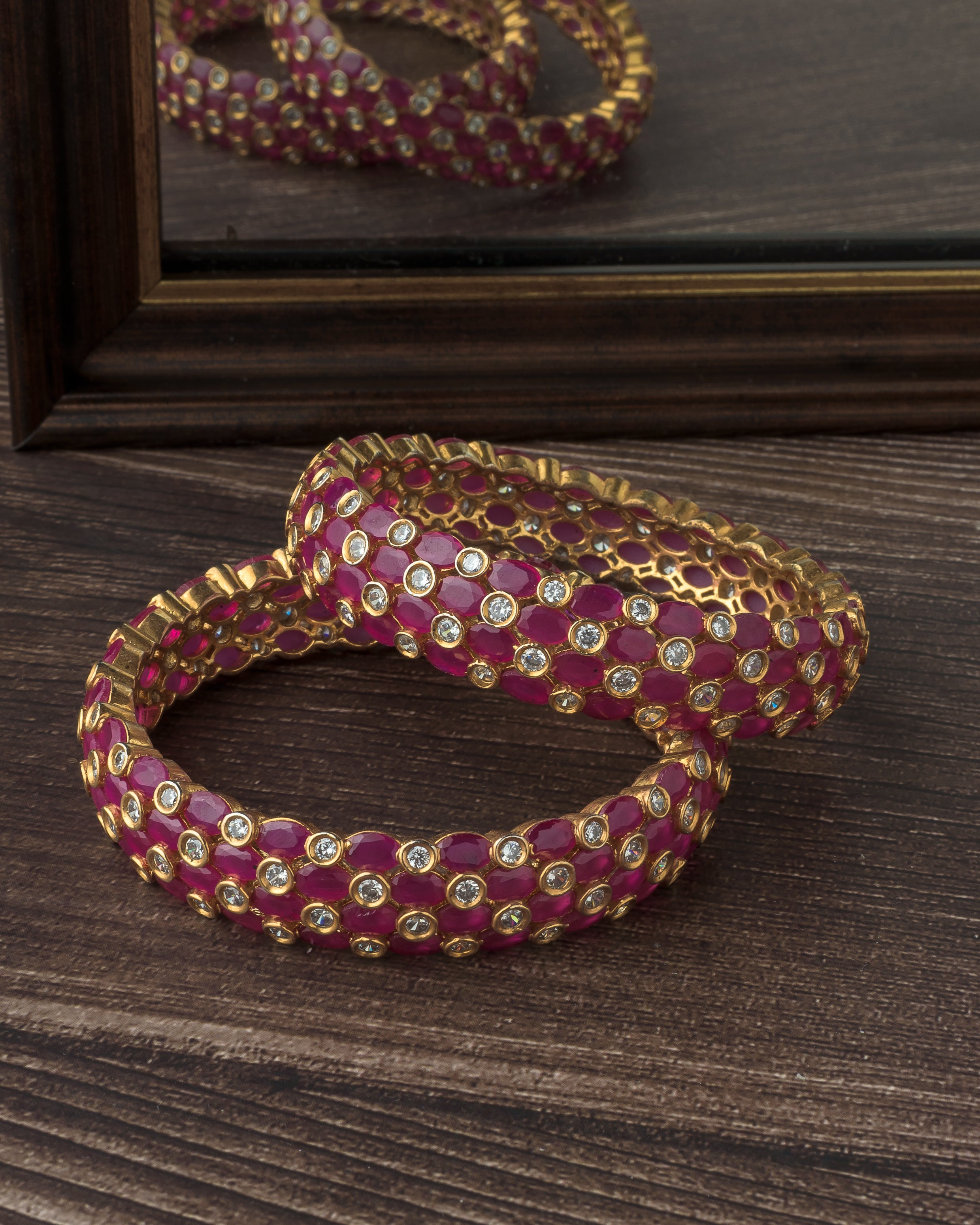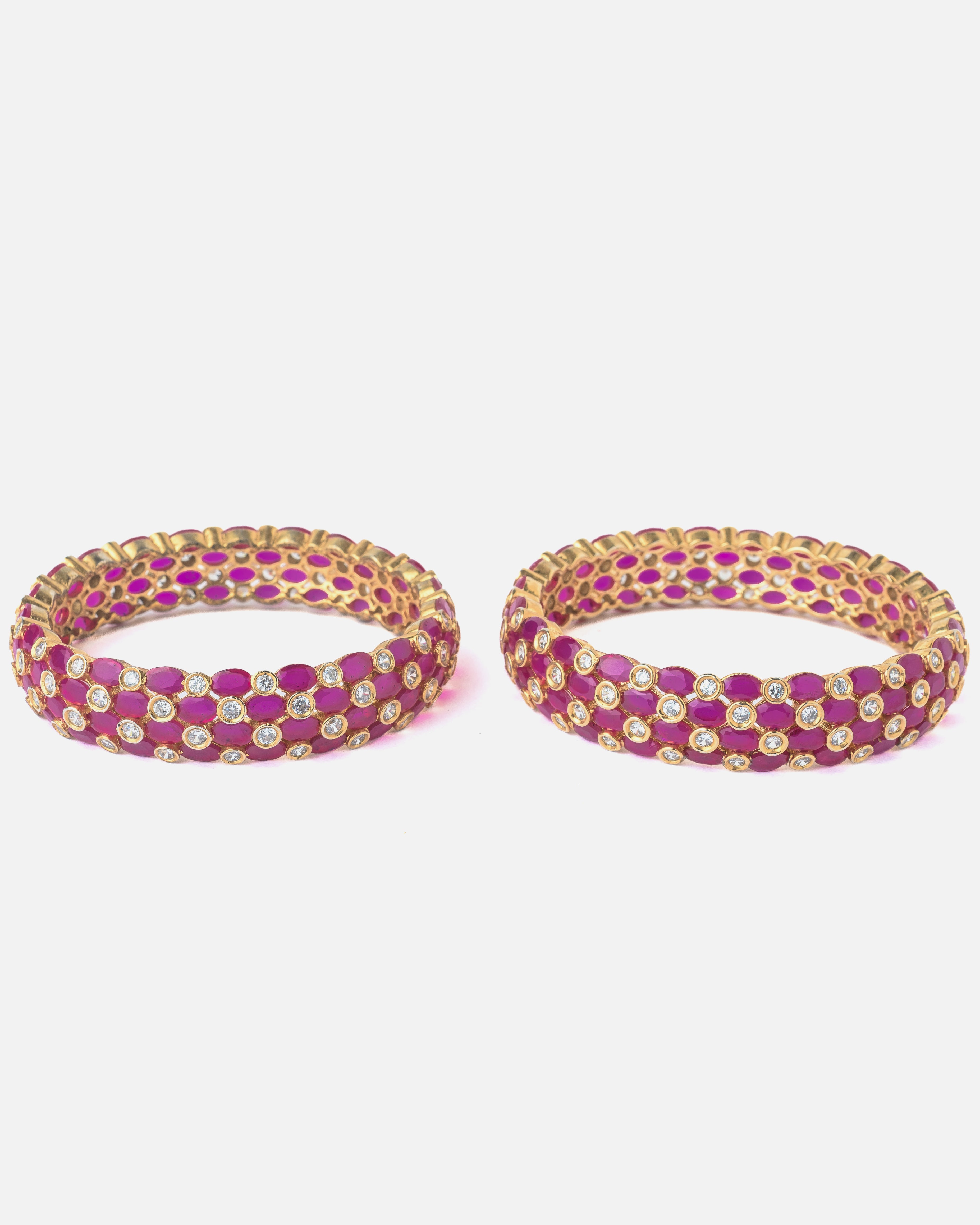 Exquisitely crafted gold bangles adorned with vibrant ruby-red stones and sparkling white crystals, perfect for weddings or festive occasions. A stunning blend of traditional elegance and luxury.
