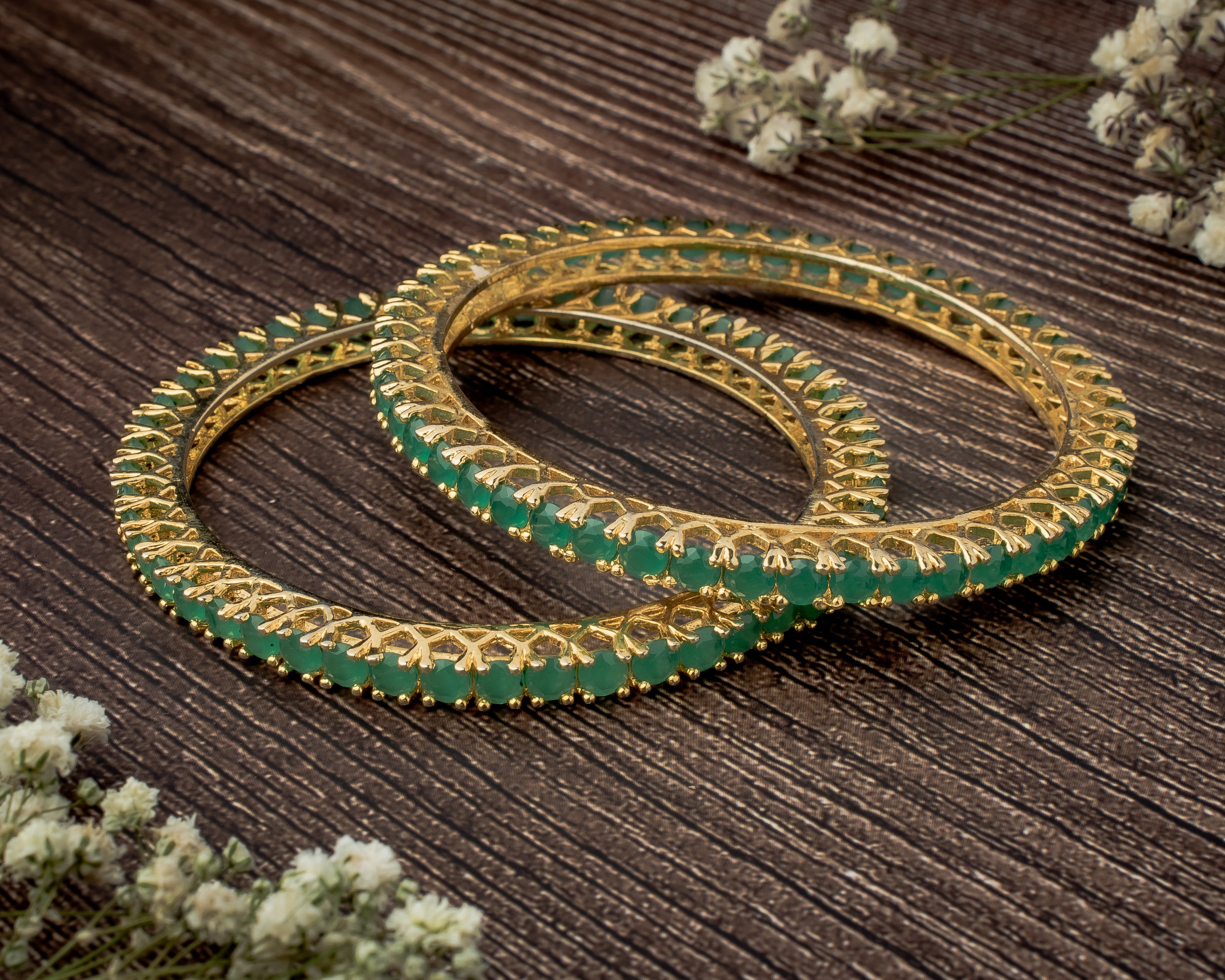 Elegant gold-tone bangles adorned with vibrant green gemstones, showcasing a perfect blend of traditional craftsmanship and contemporary design. Ideal for enhancing any festive or formal look.