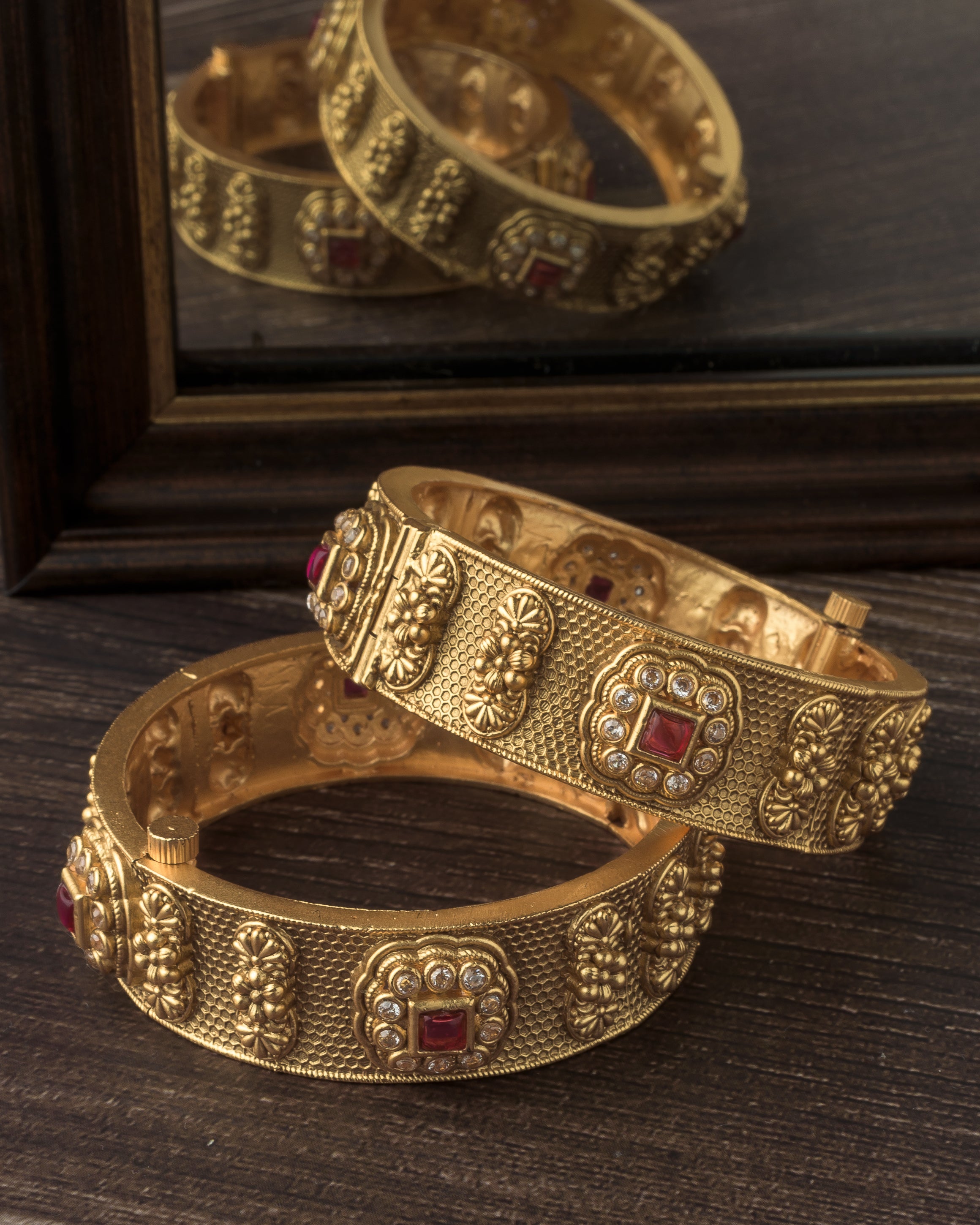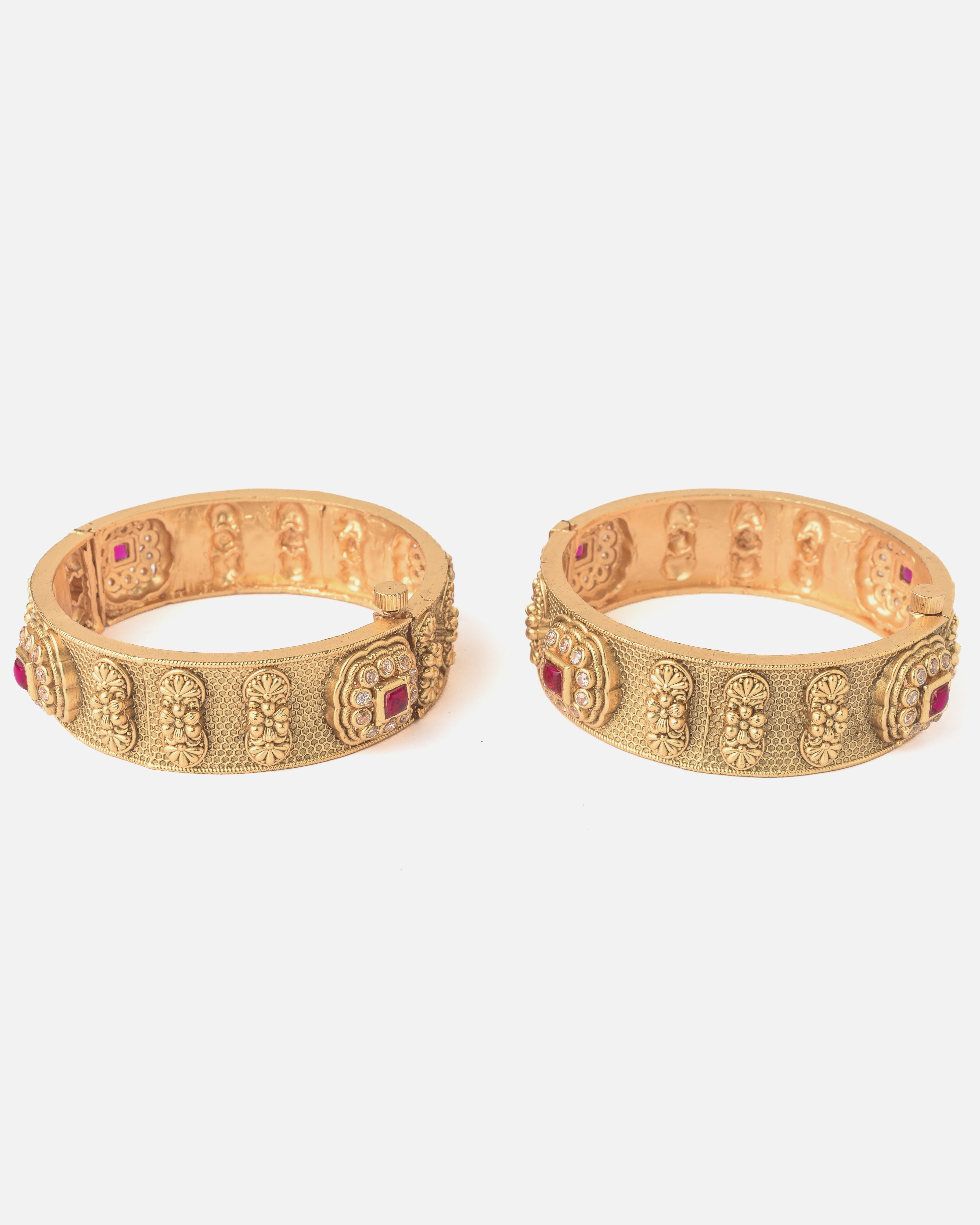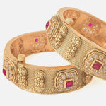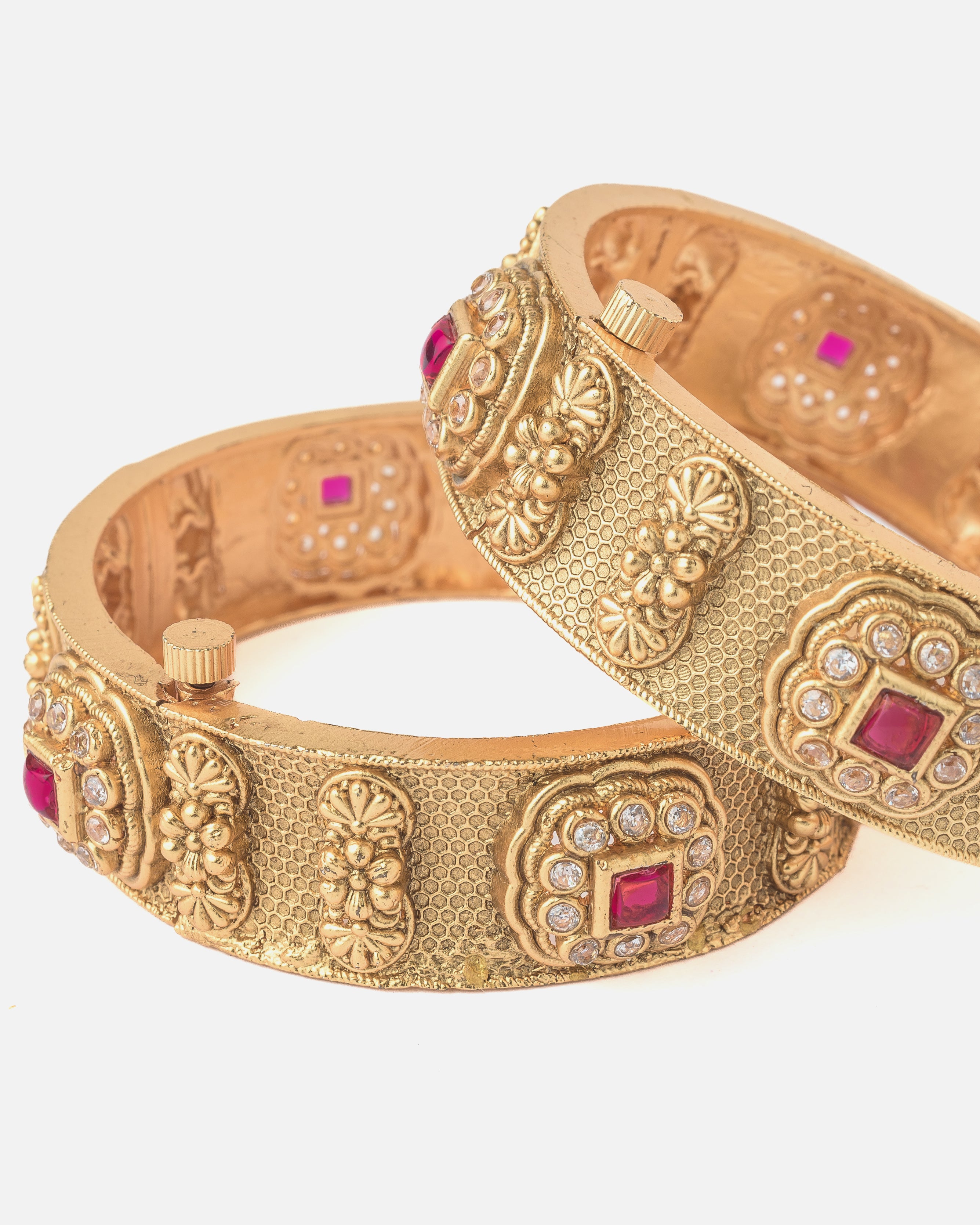 Elegant gold-plated bangles featuring intricate floral motifs and ruby-red accents, designed to enhance your traditional attire with a touch of royal sophistication.