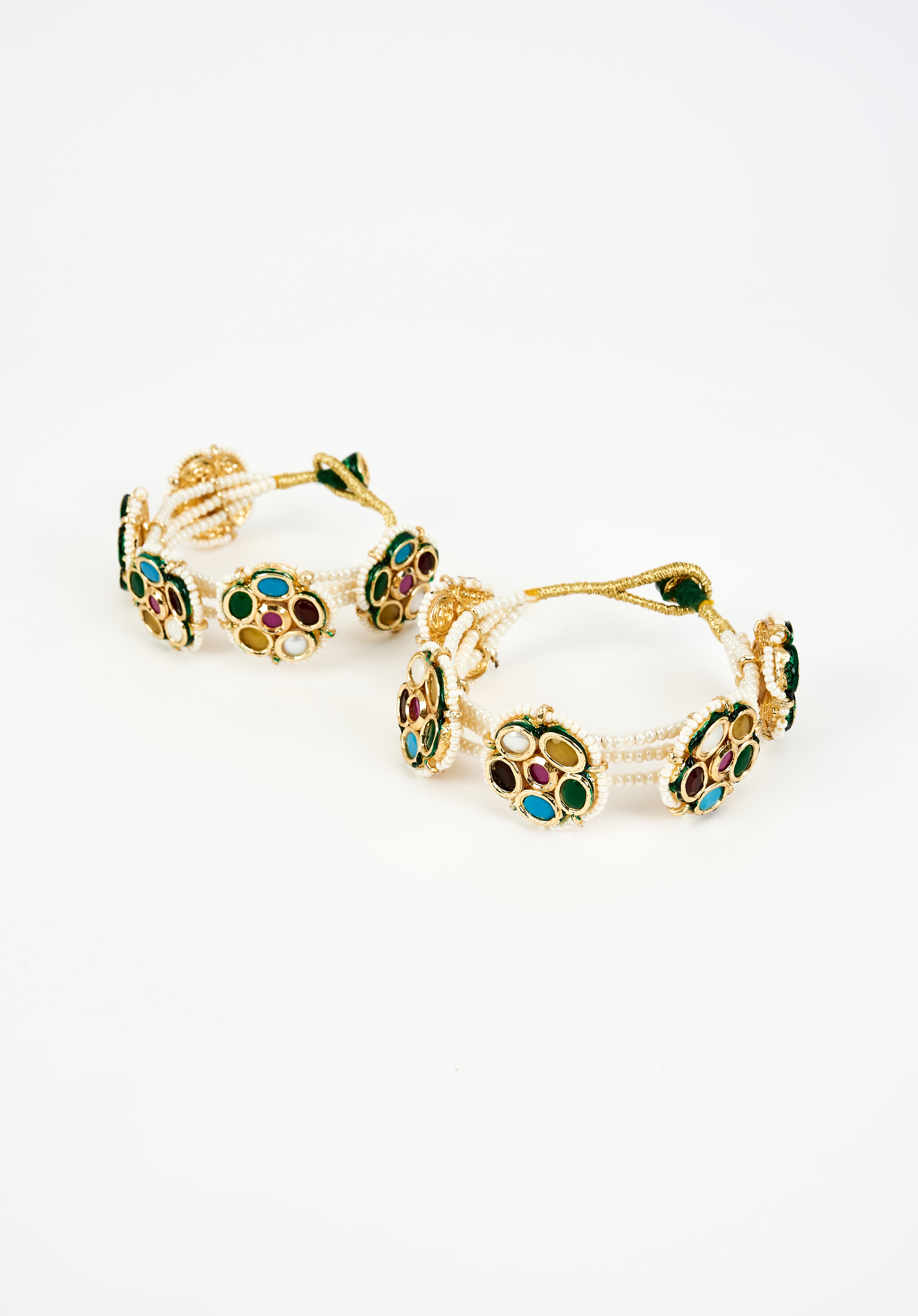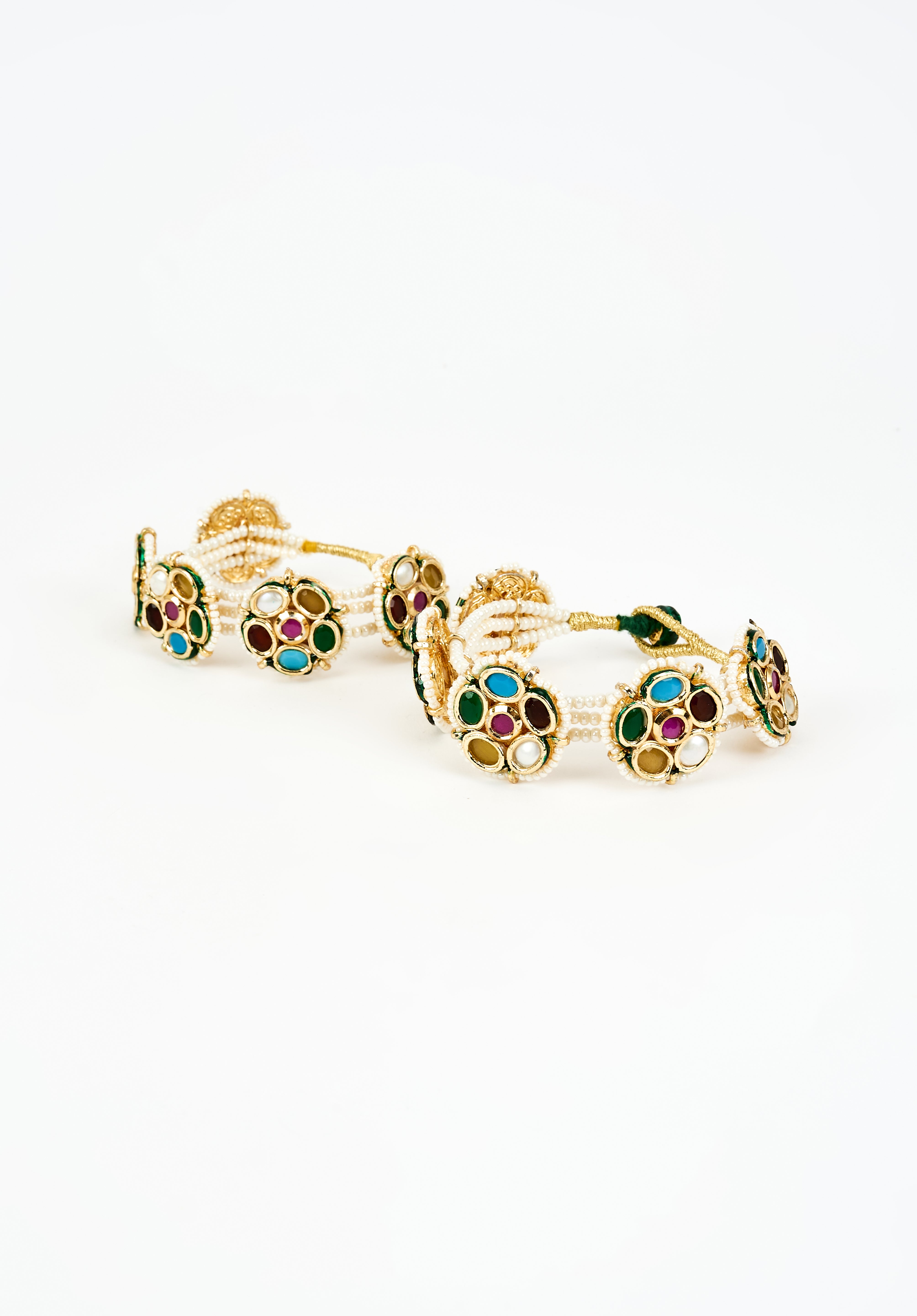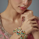 Exquisite handcrafted bracelet featuring vibrant multi-coloured gemstones framed in gold accent, paired with delicate pearl strand. A bold & elegant statement piece for special occasions or festive wear.