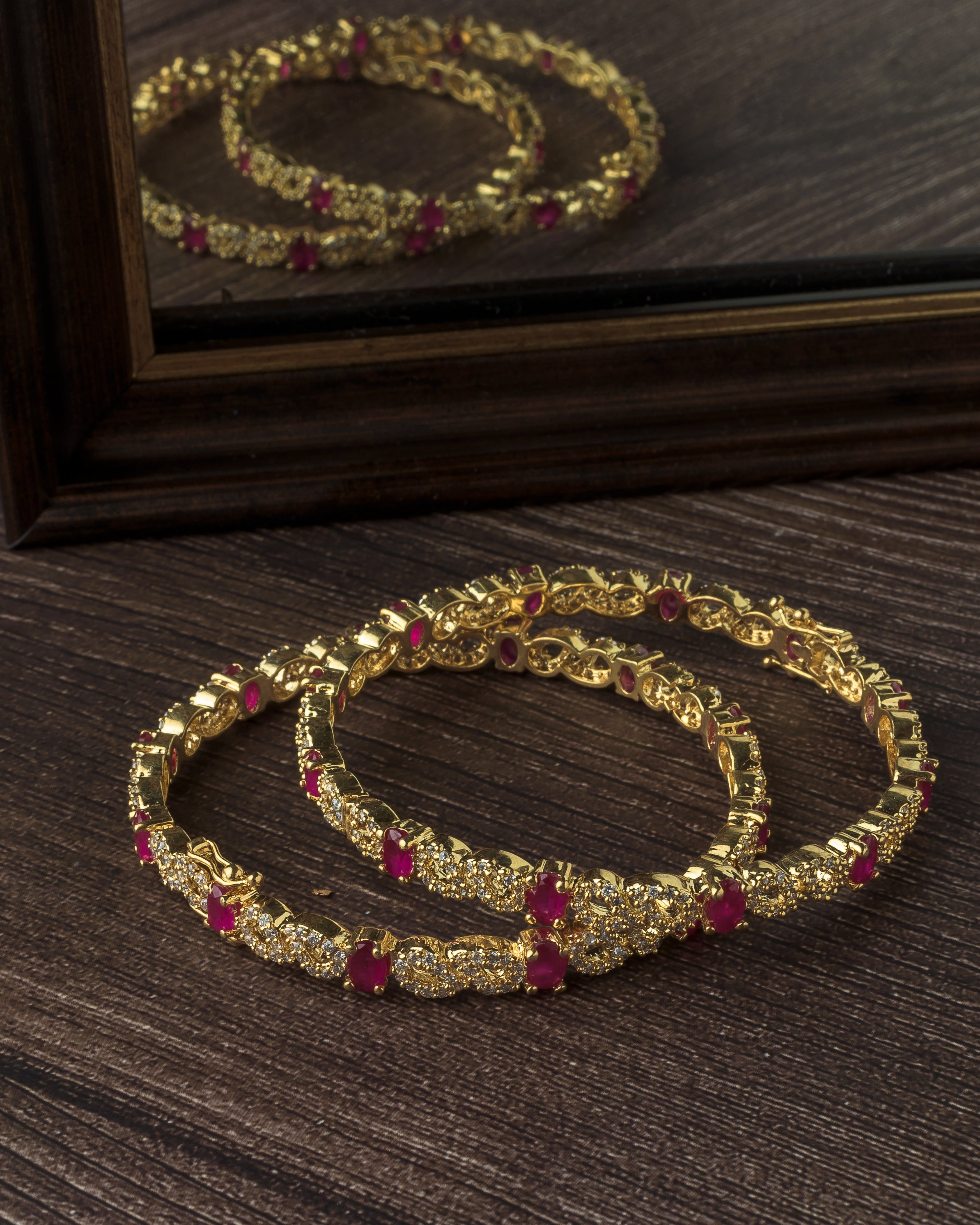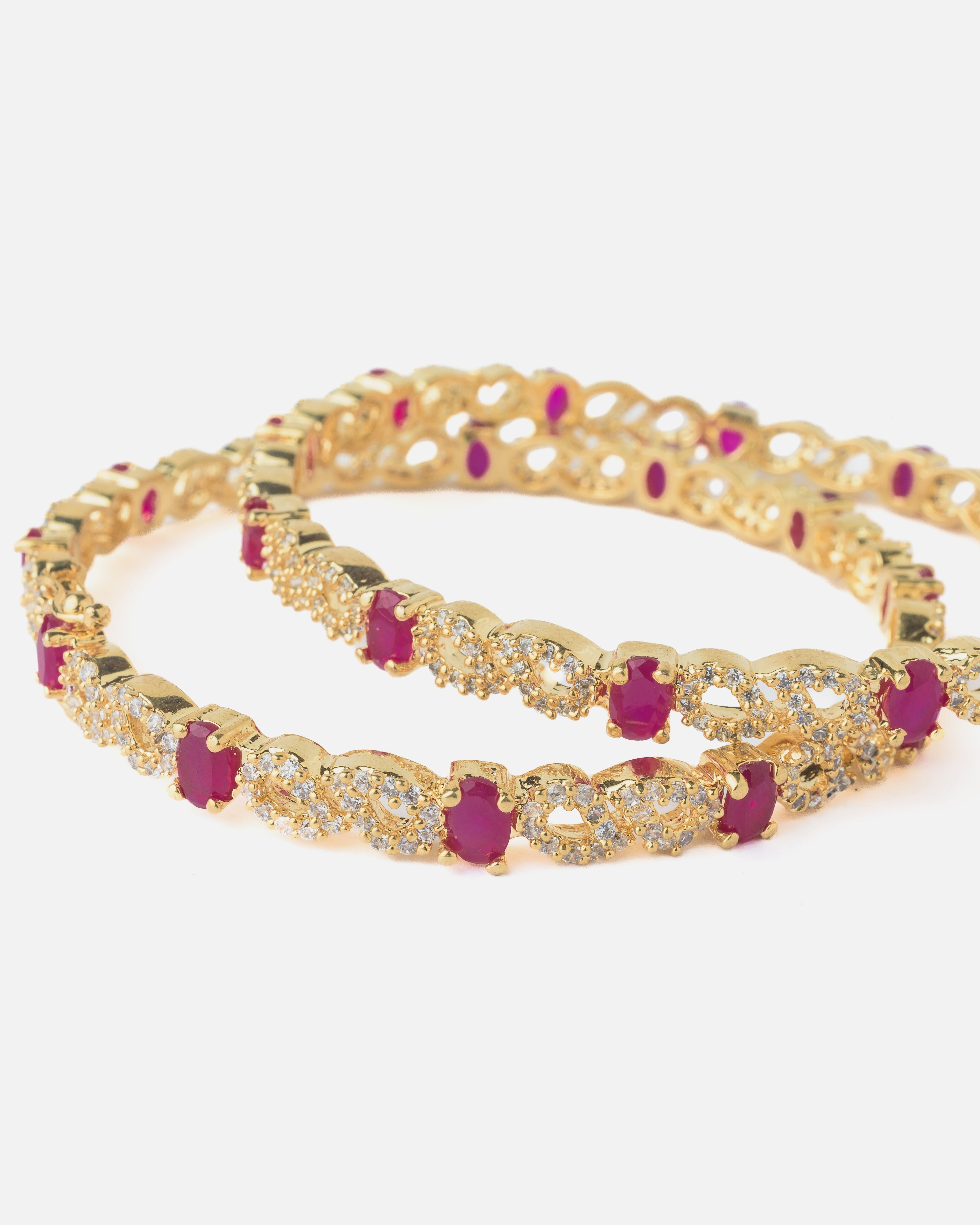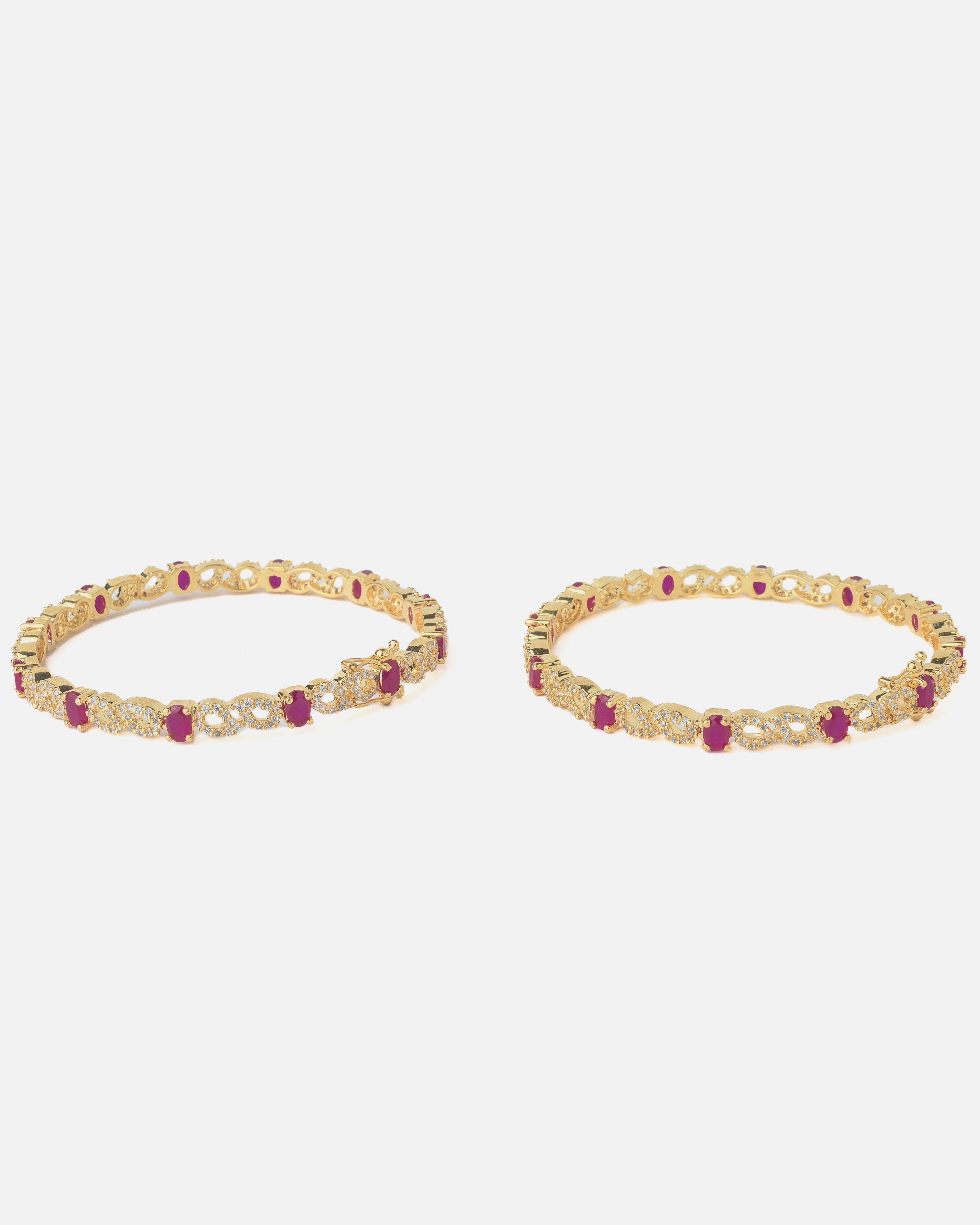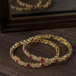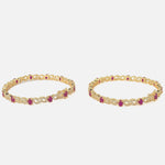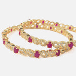 Radiant gold-toned bangles adorned with sparkling white stones and vibrant ruby-red accents. These elegant bangles are perfect for festive occasions, adding a touch of luxury and traditional charm.