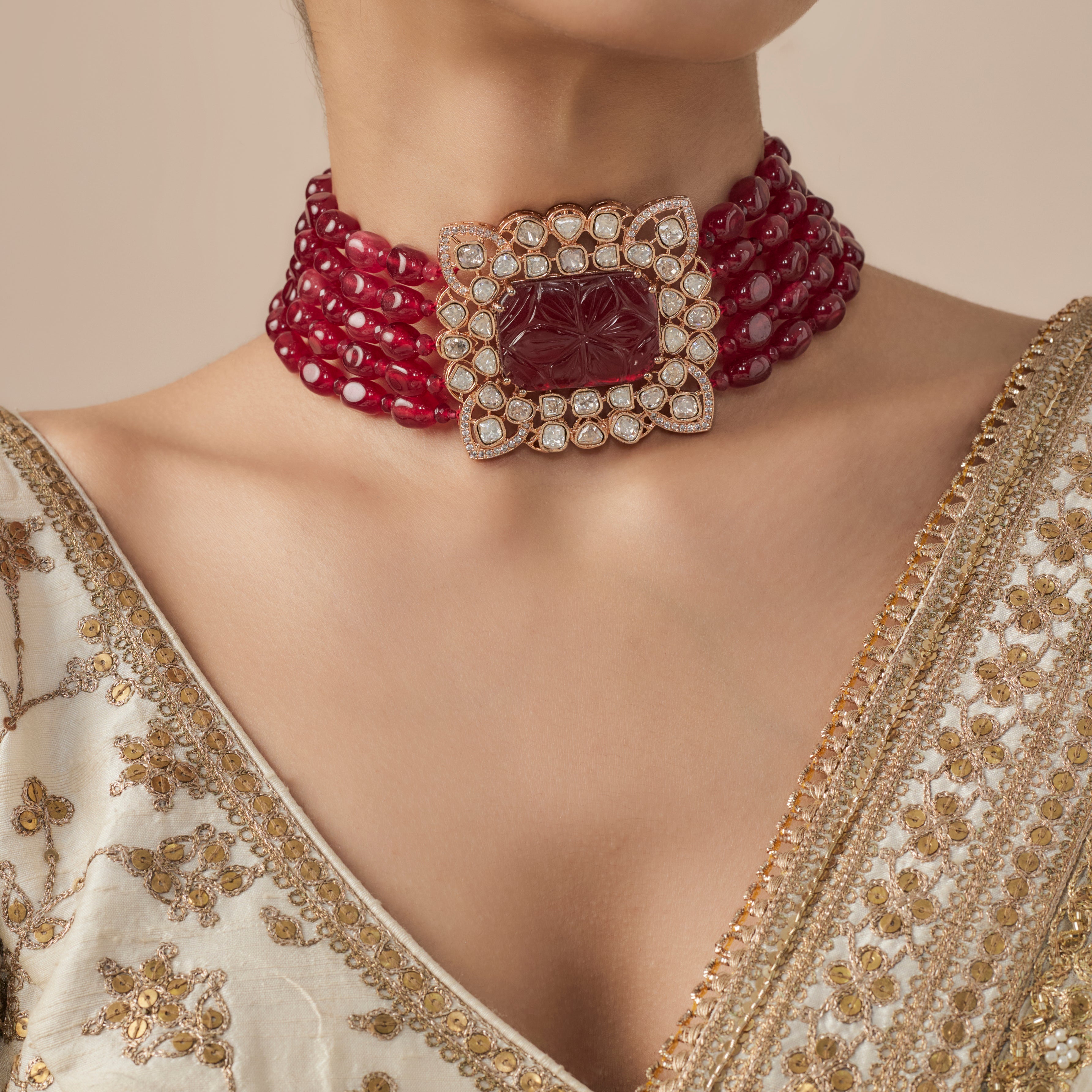 Antara Gold Plated Red Womens Beaded Choker Necklace Set