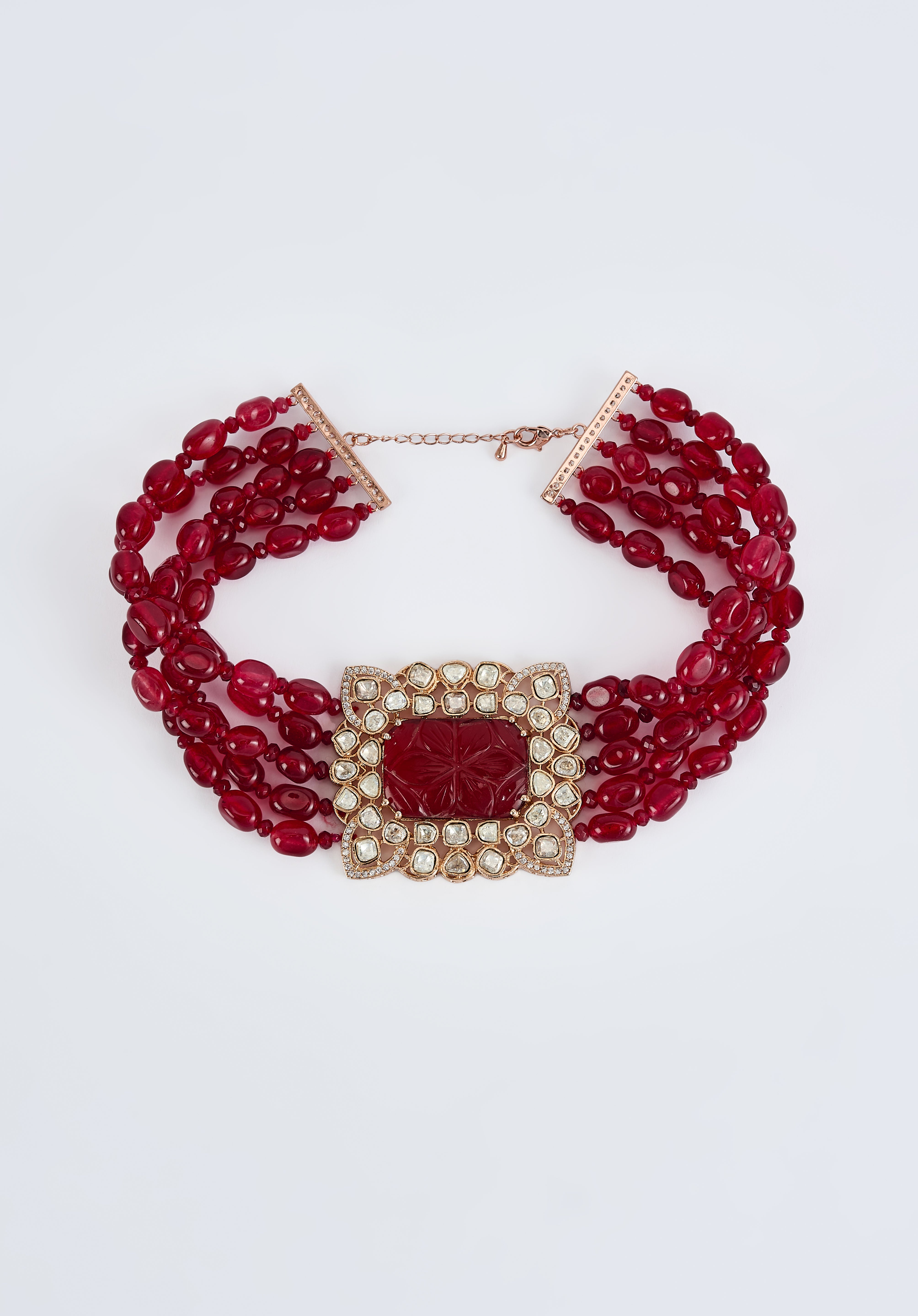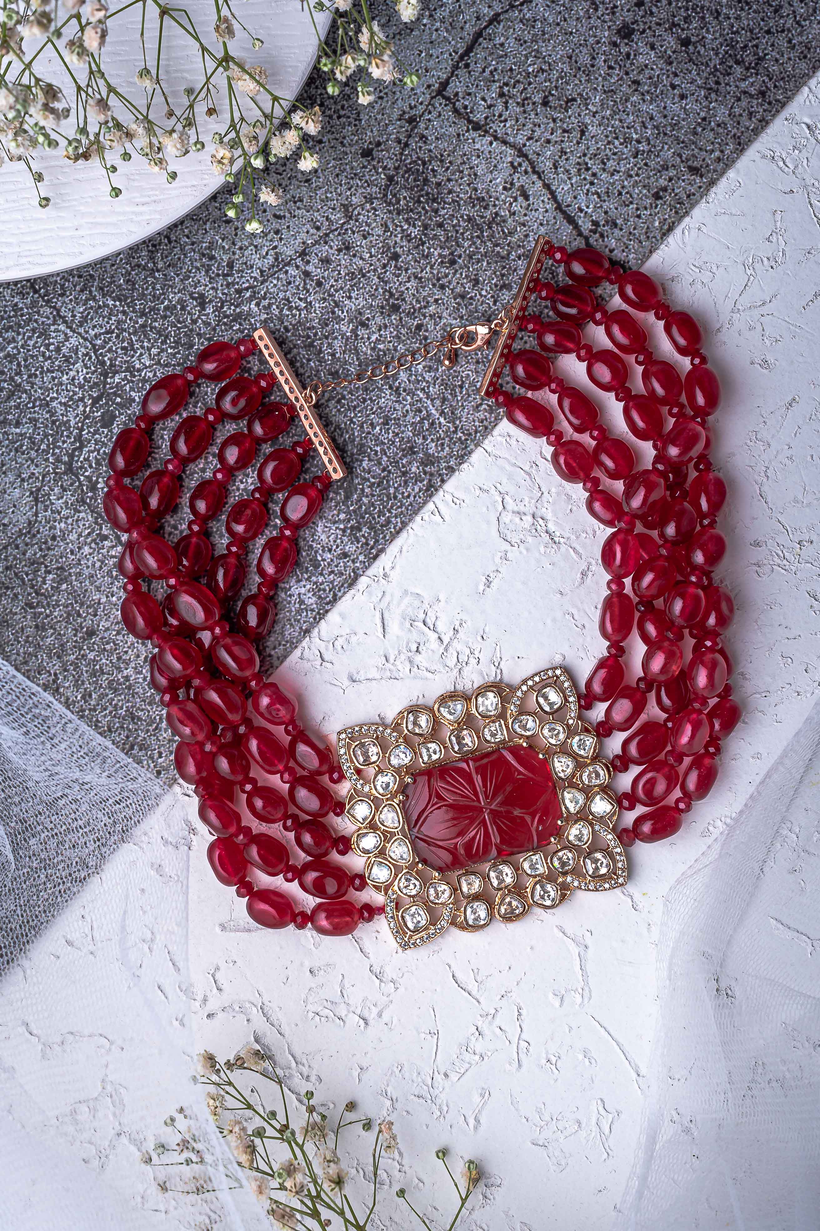 Luxurious multi-strand necklace featuring deep red beads and a carved center stone embellished with sparkling crystals. Perfect for elevating festive or formal attire with timeless elegance and charm.