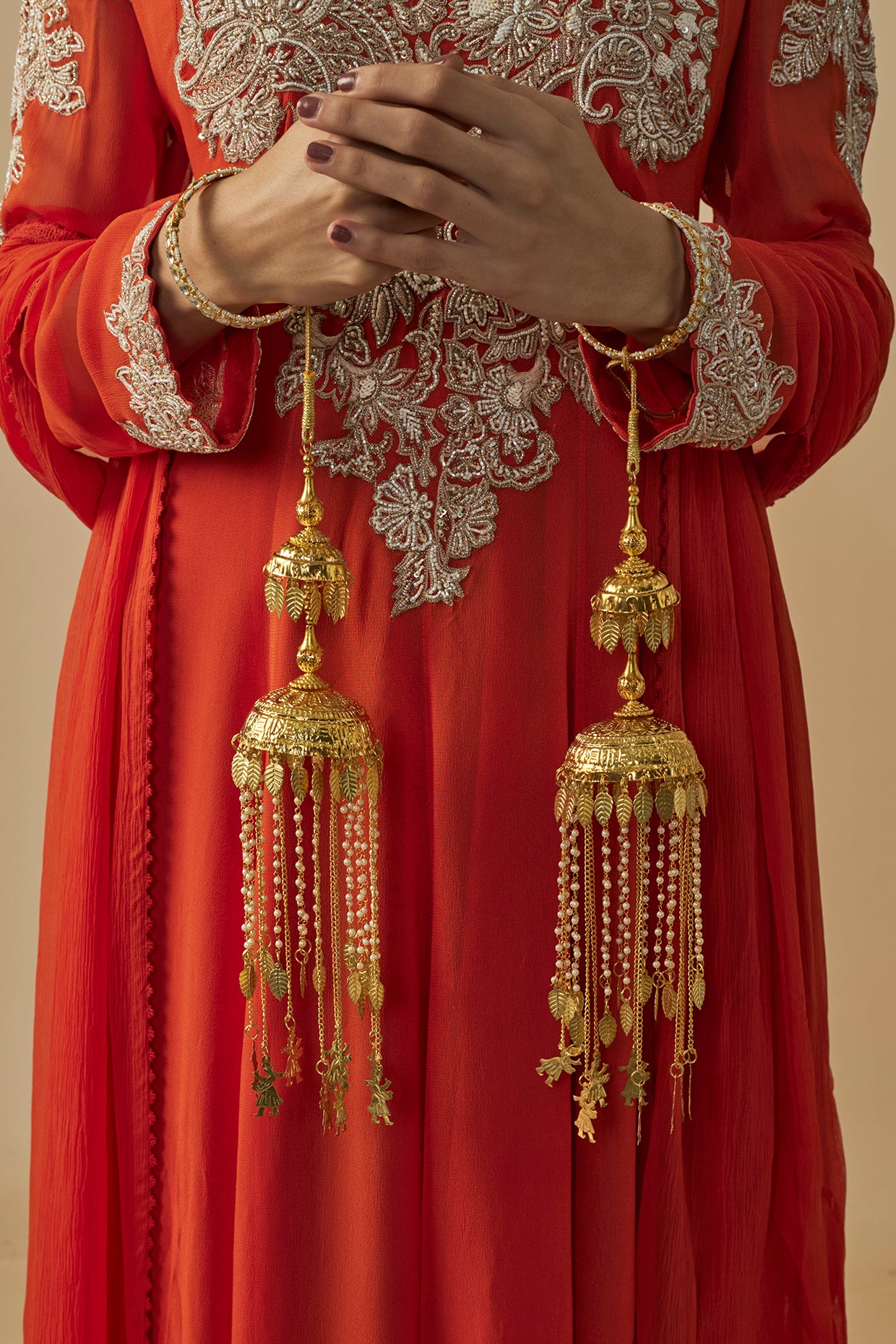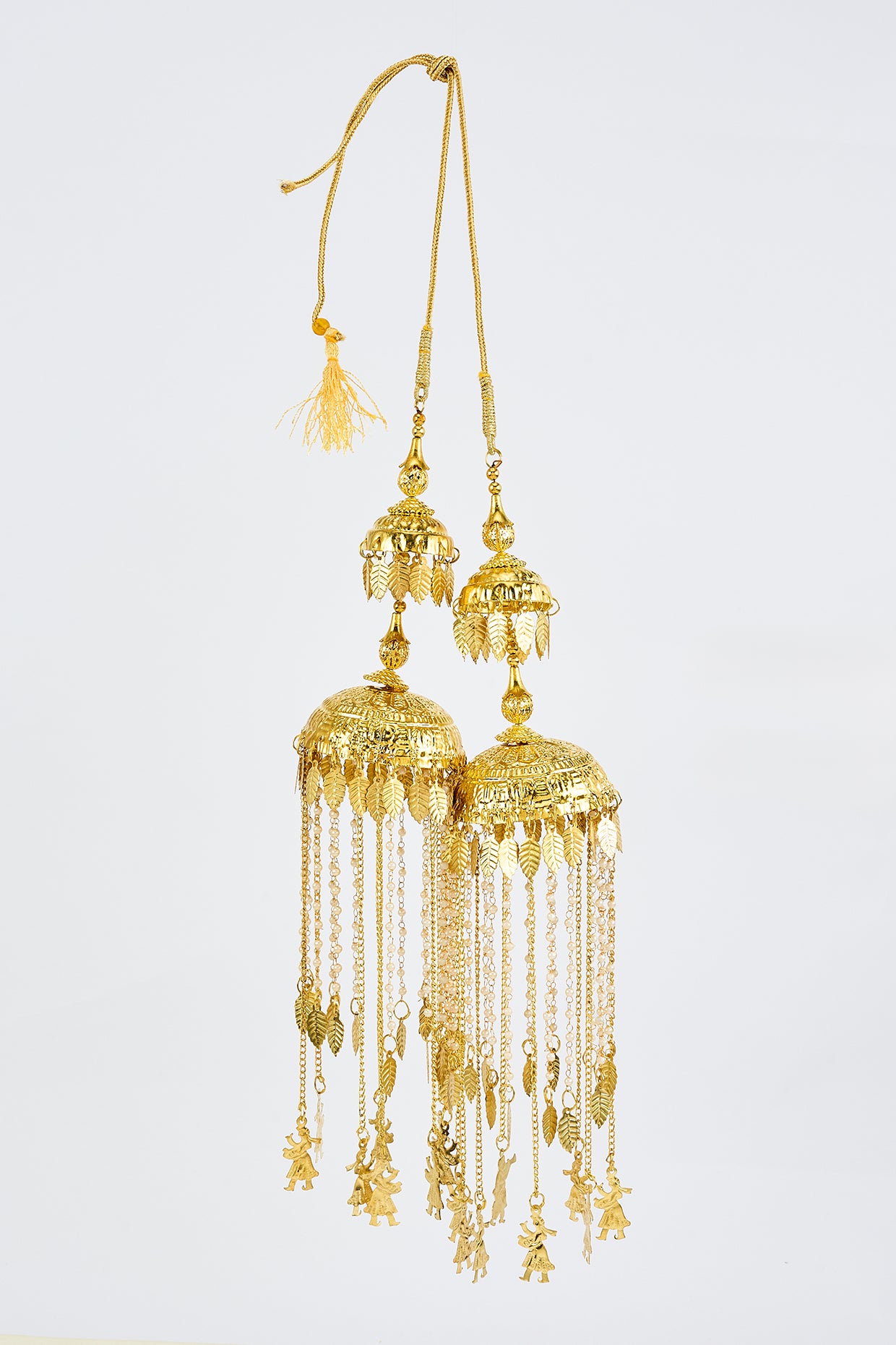 Elegant gold bridal kalire with intricate hanging leaf and pearl detailing, designed for traditional ceremonies. Perfectly complements bridal attire, adding charm and grace to your special day.