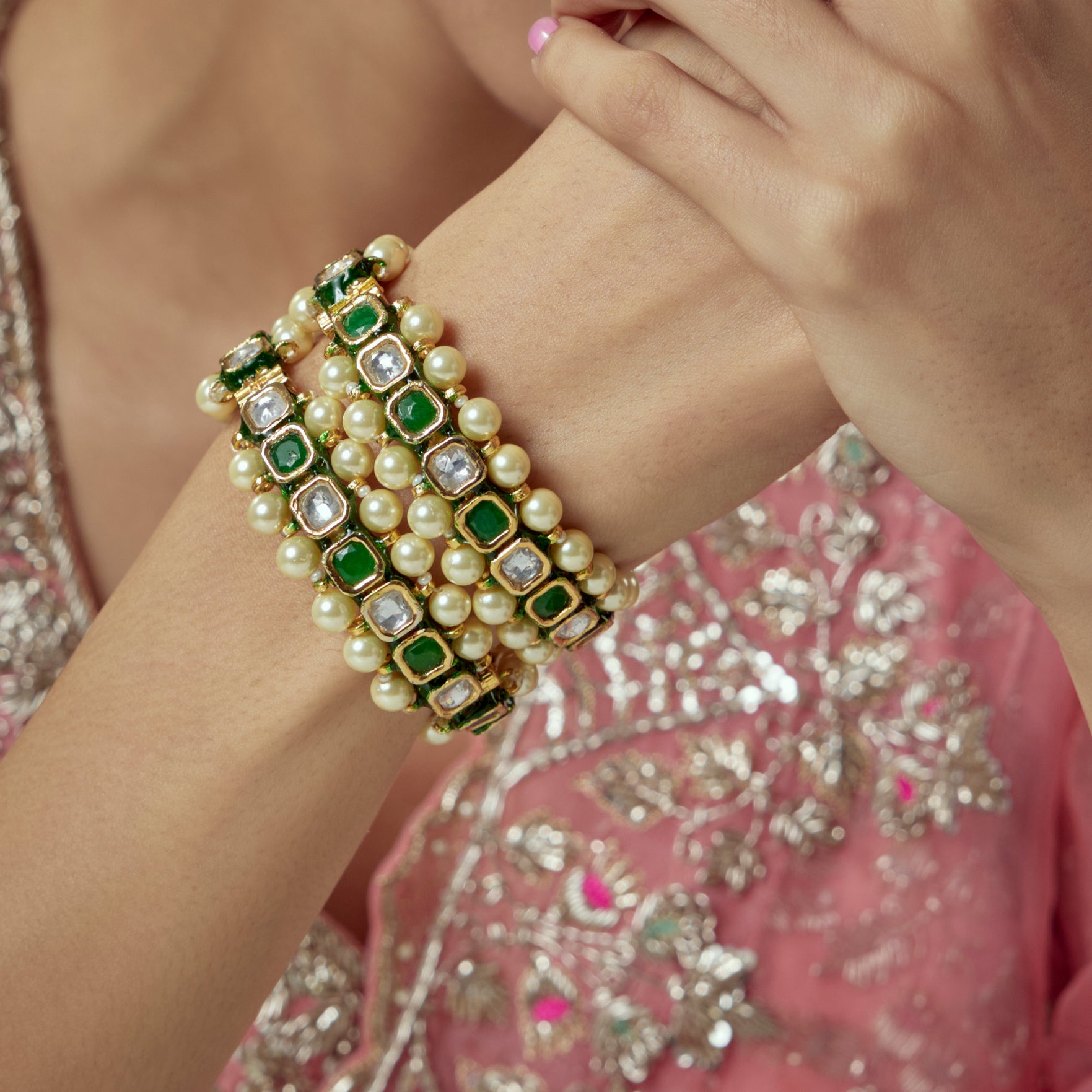 Saadgi Gold Plated Green Kundan, Polki Womens Pair of Bangles