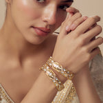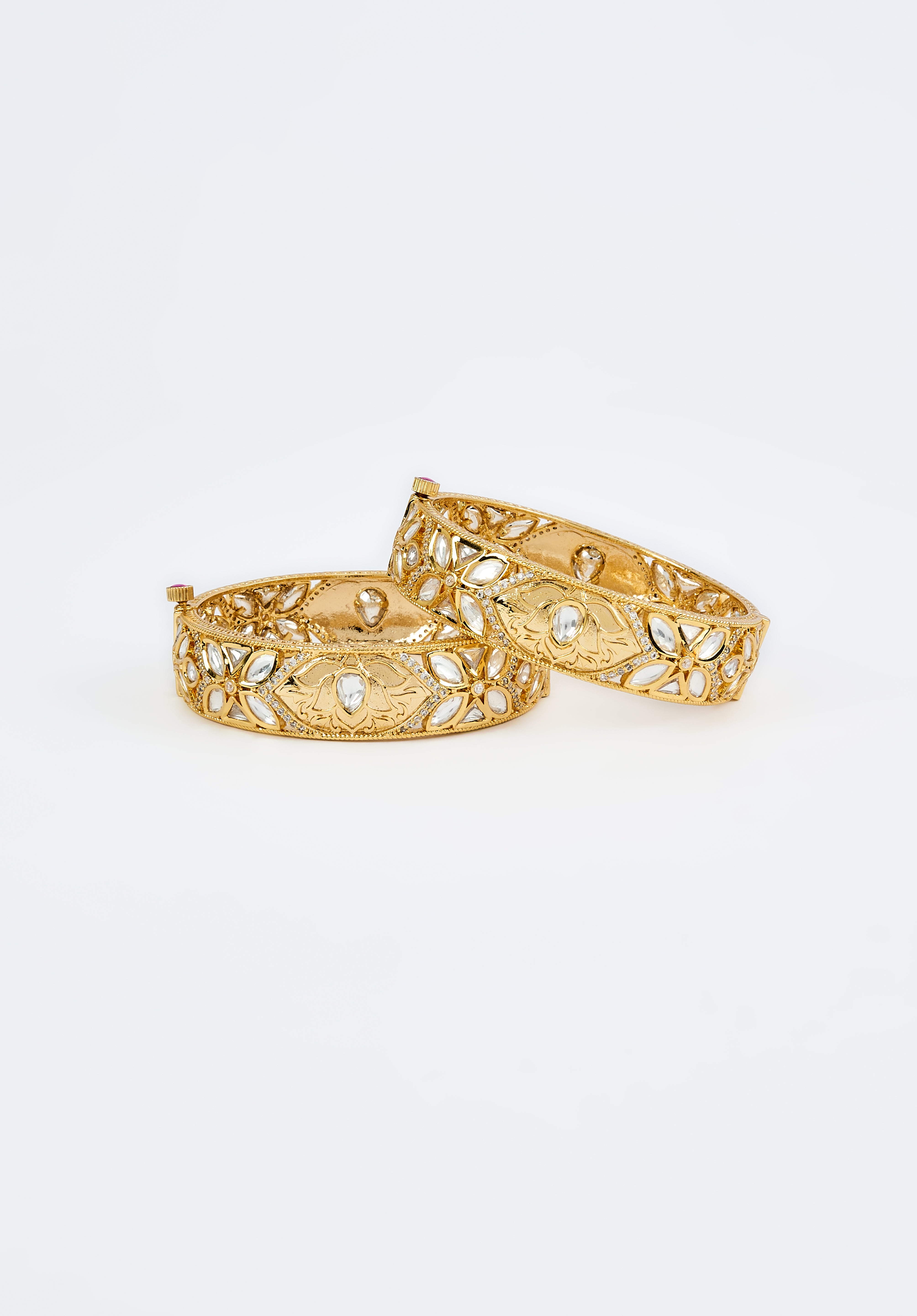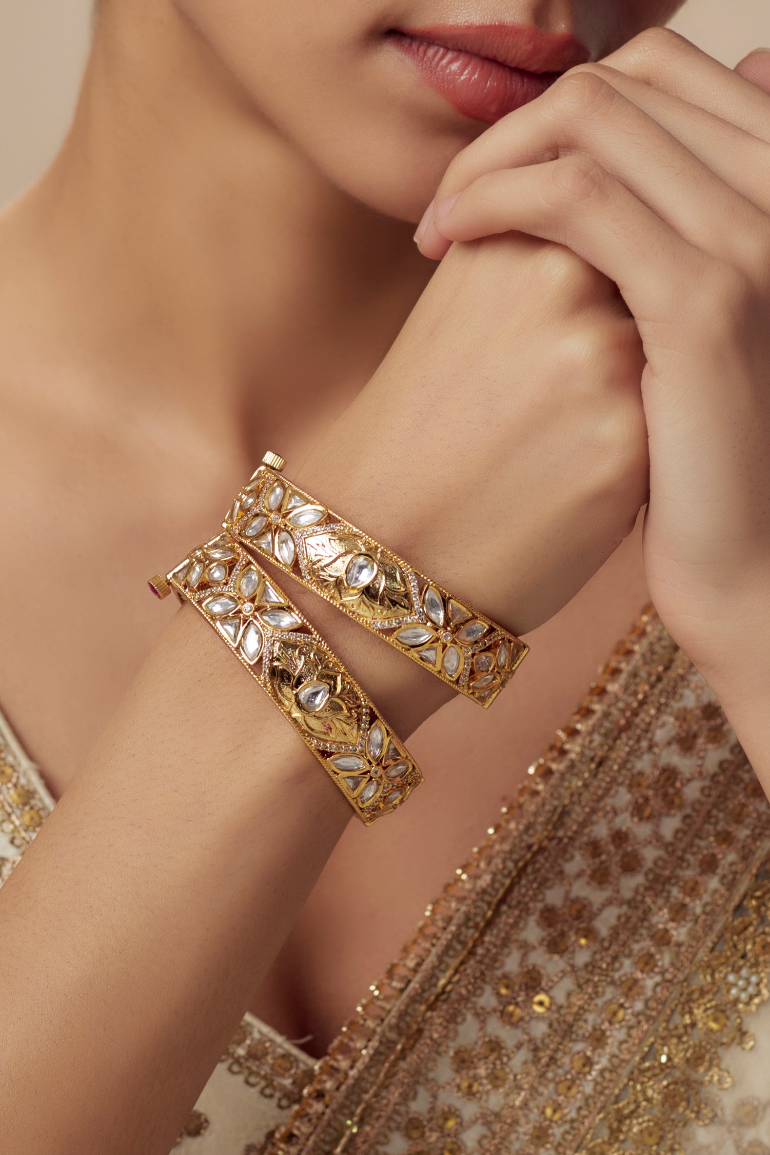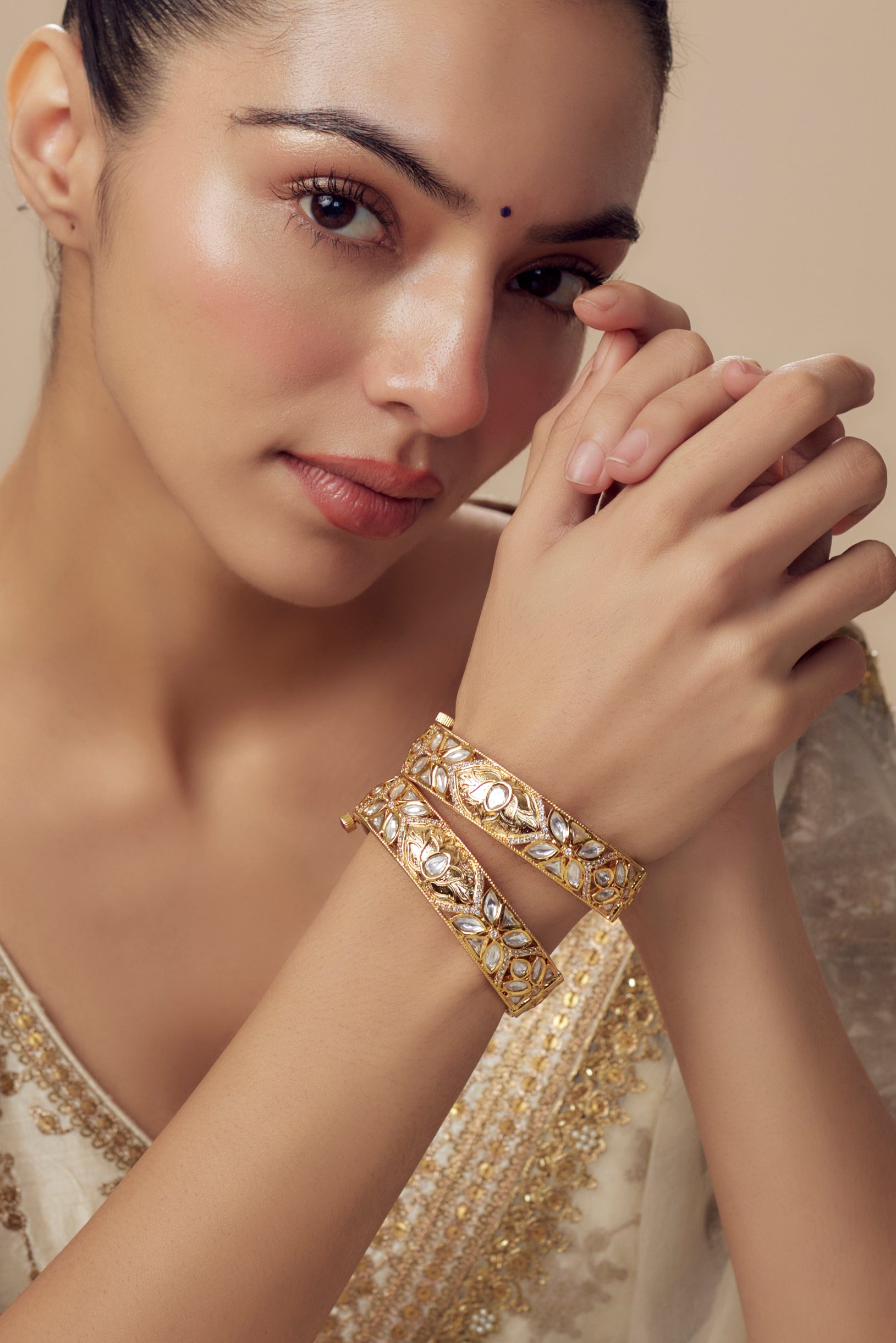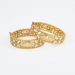 Exquisite handcrafted gold-tone bangles with intricate floral detailing & shimmering embellishments, perfect for elevating ethnic look. A blend of timeless elegance & craftsmanship for every occasion.