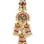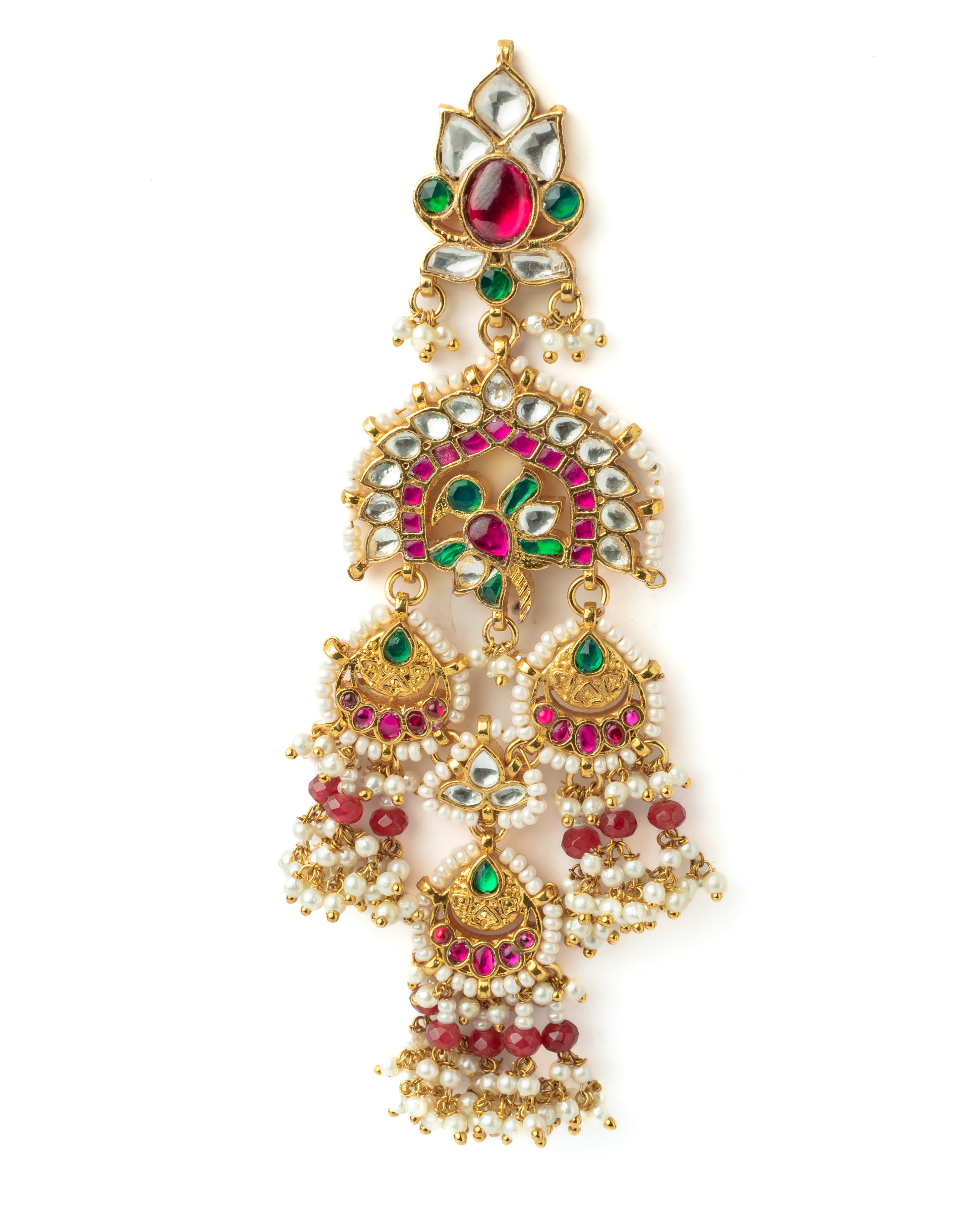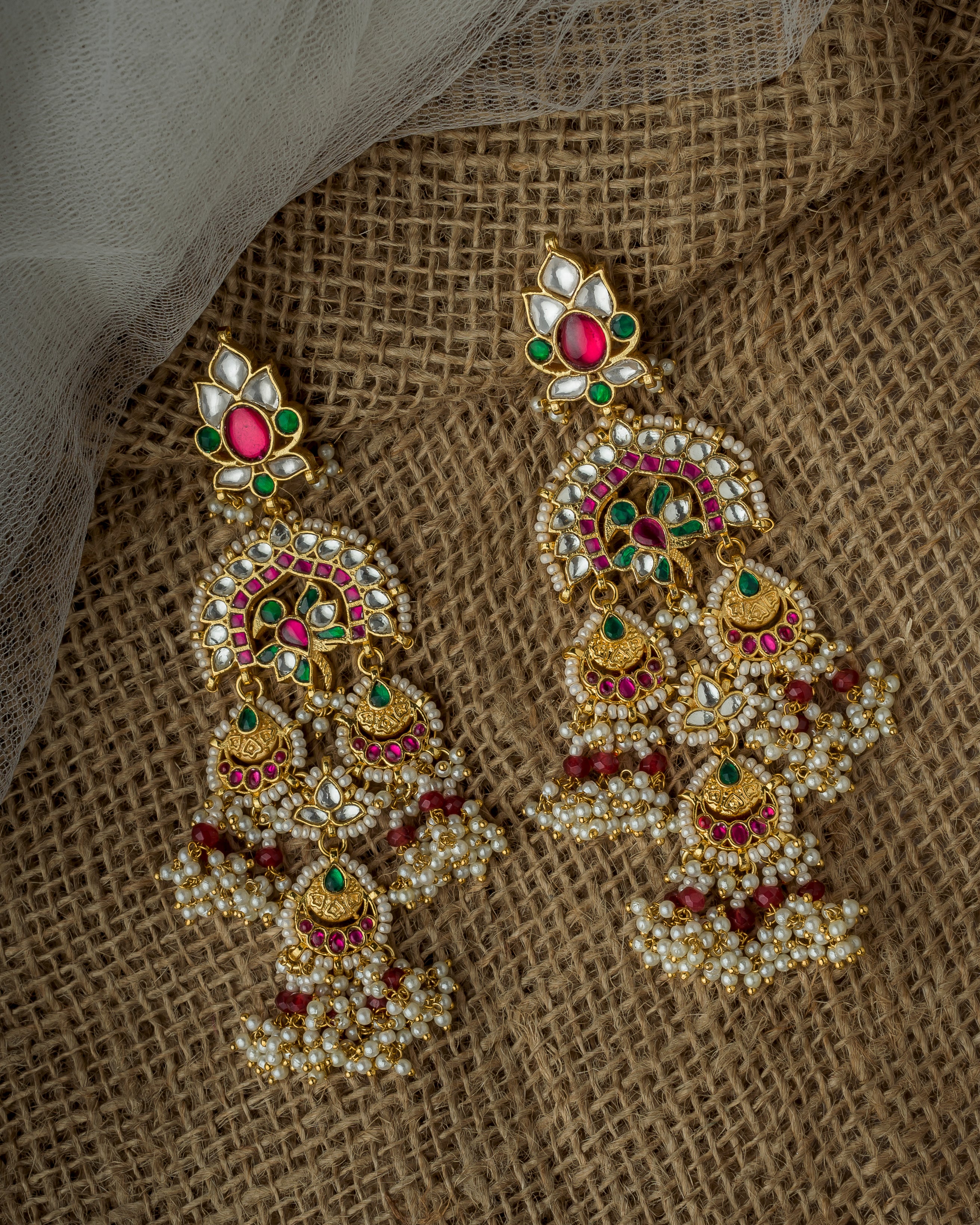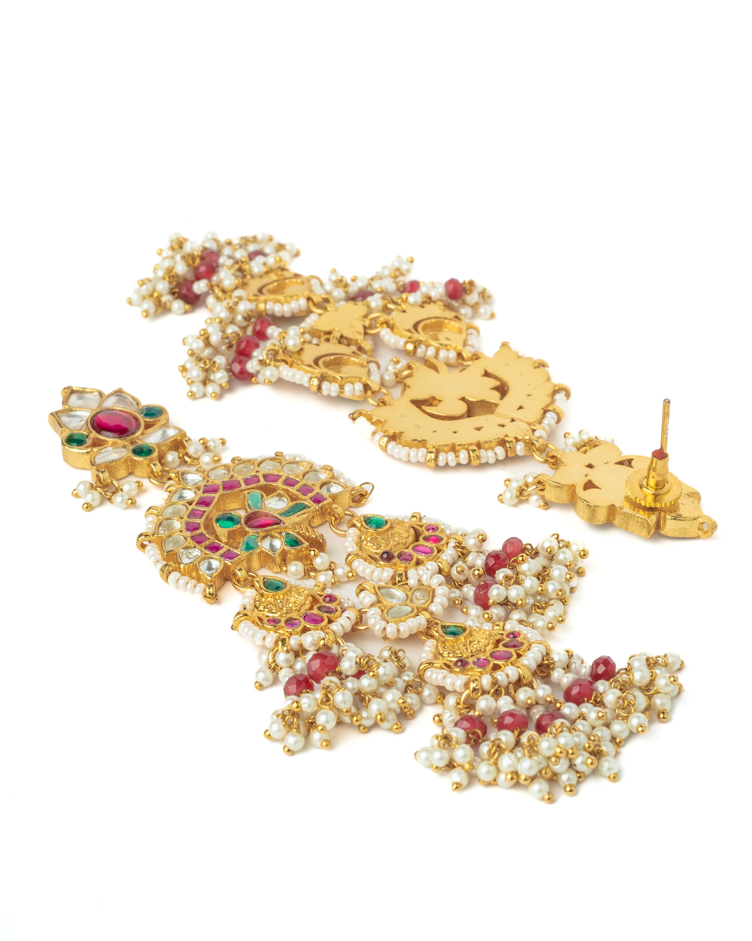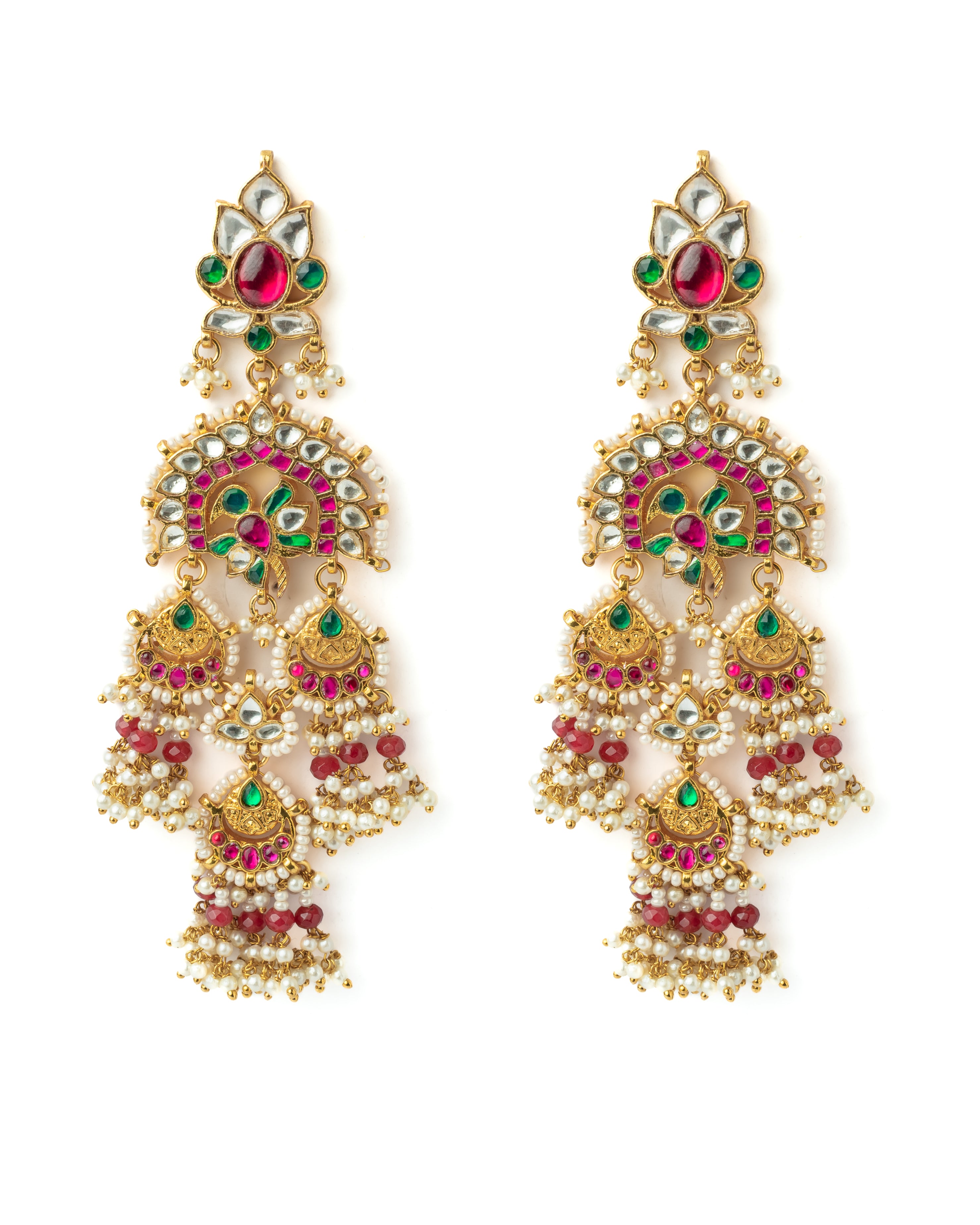 Stunning gold chandelier earrings adorned with pearls, diamonds, and vibrant ruby and emerald accents, showcasing intricate craftsmanship and a regal, traditional design for an elegant statement look.