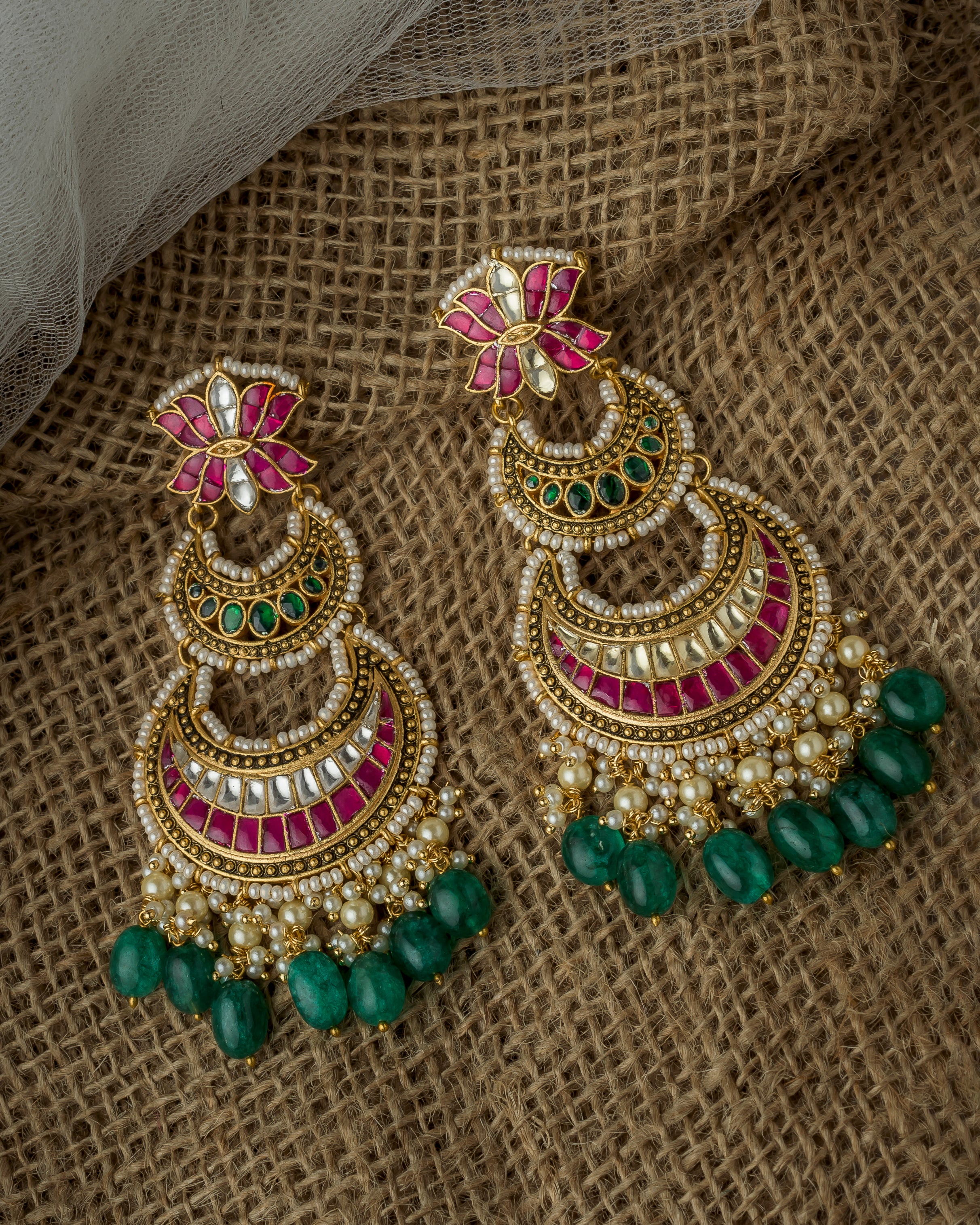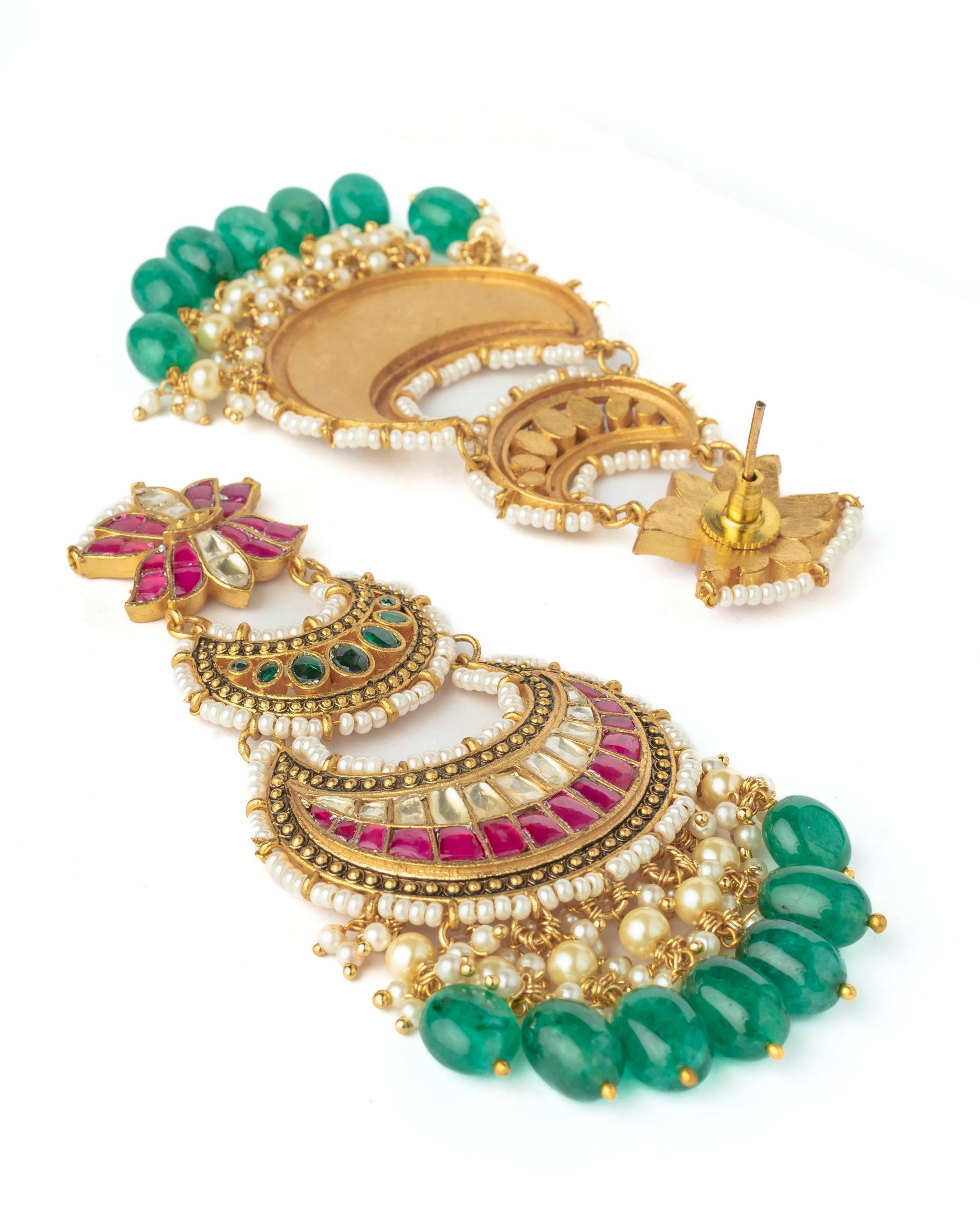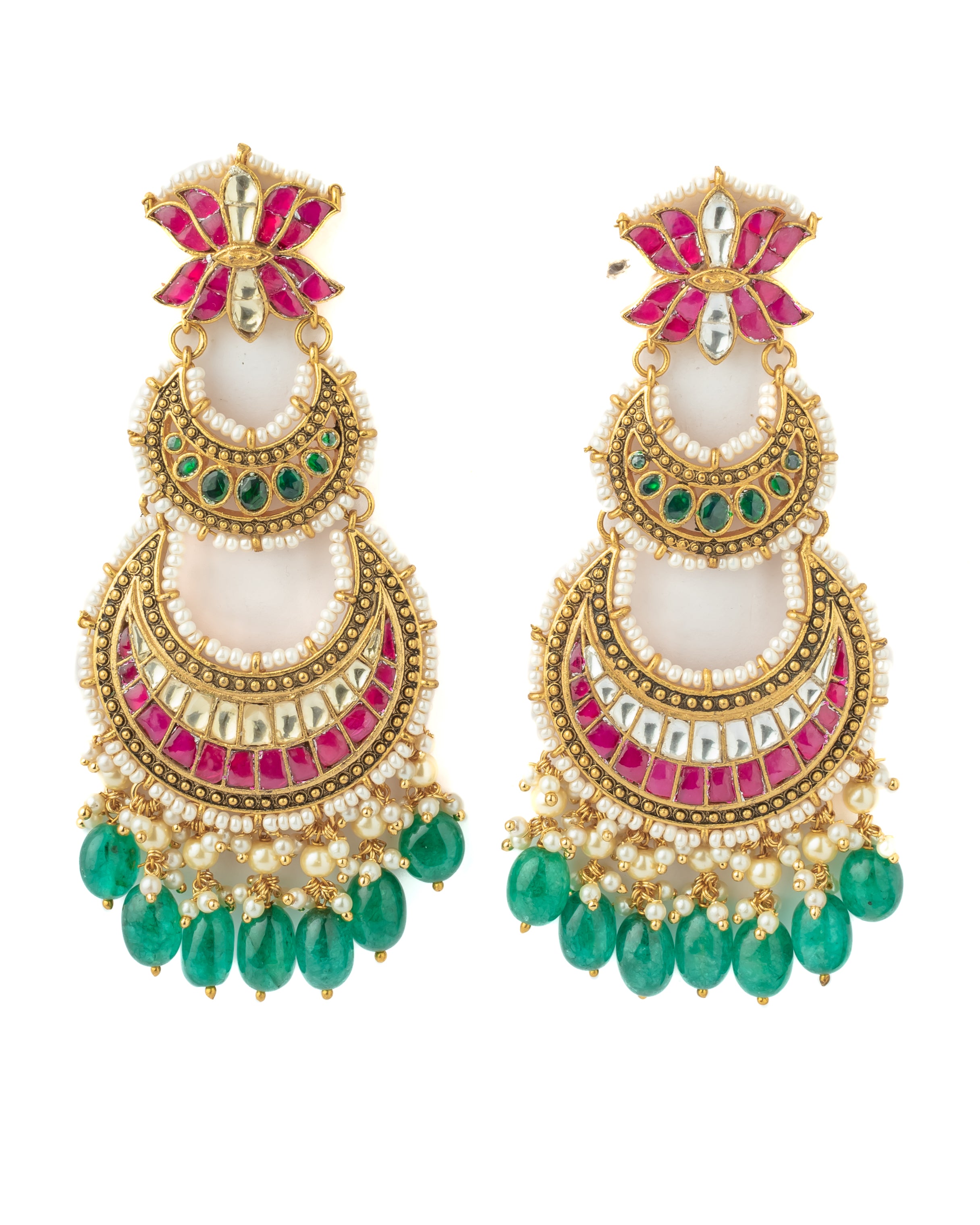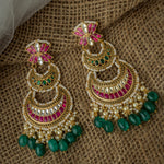 Elegant gold-plated chandelier earrings adorned with ruby, emerald, pearls & Kundan stones. A perfect blend of tradition & luxury, ideal for weddings & festive occasions.
