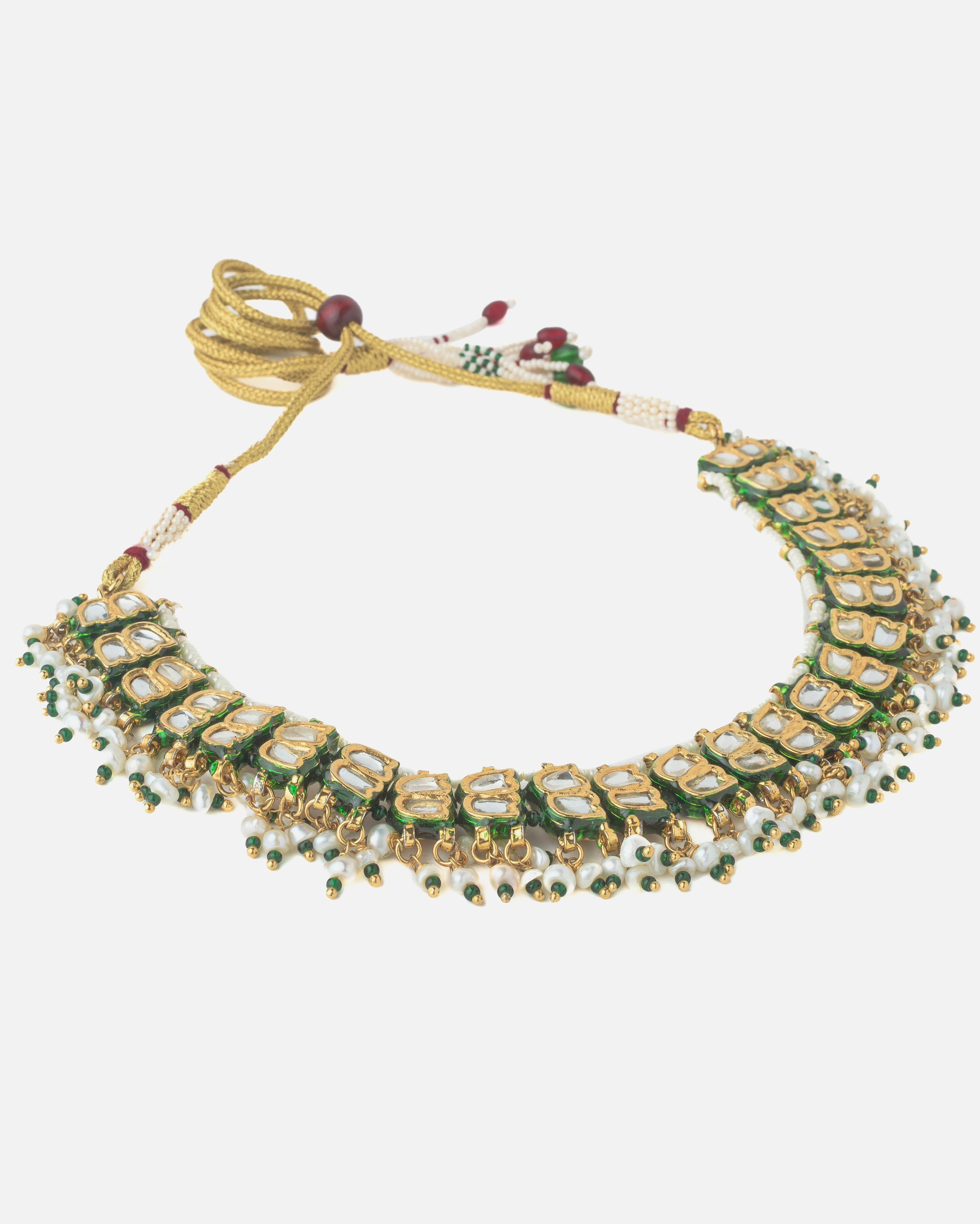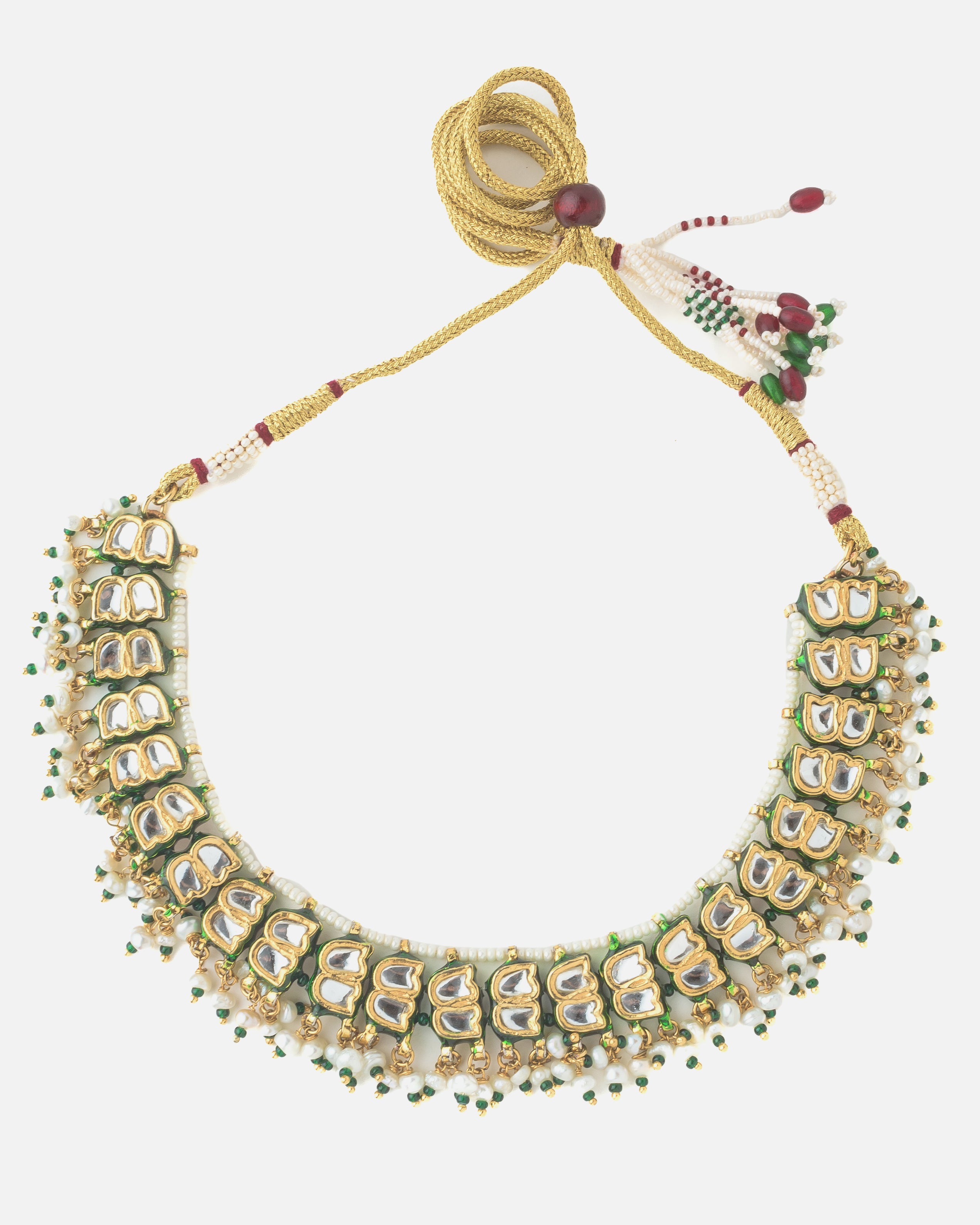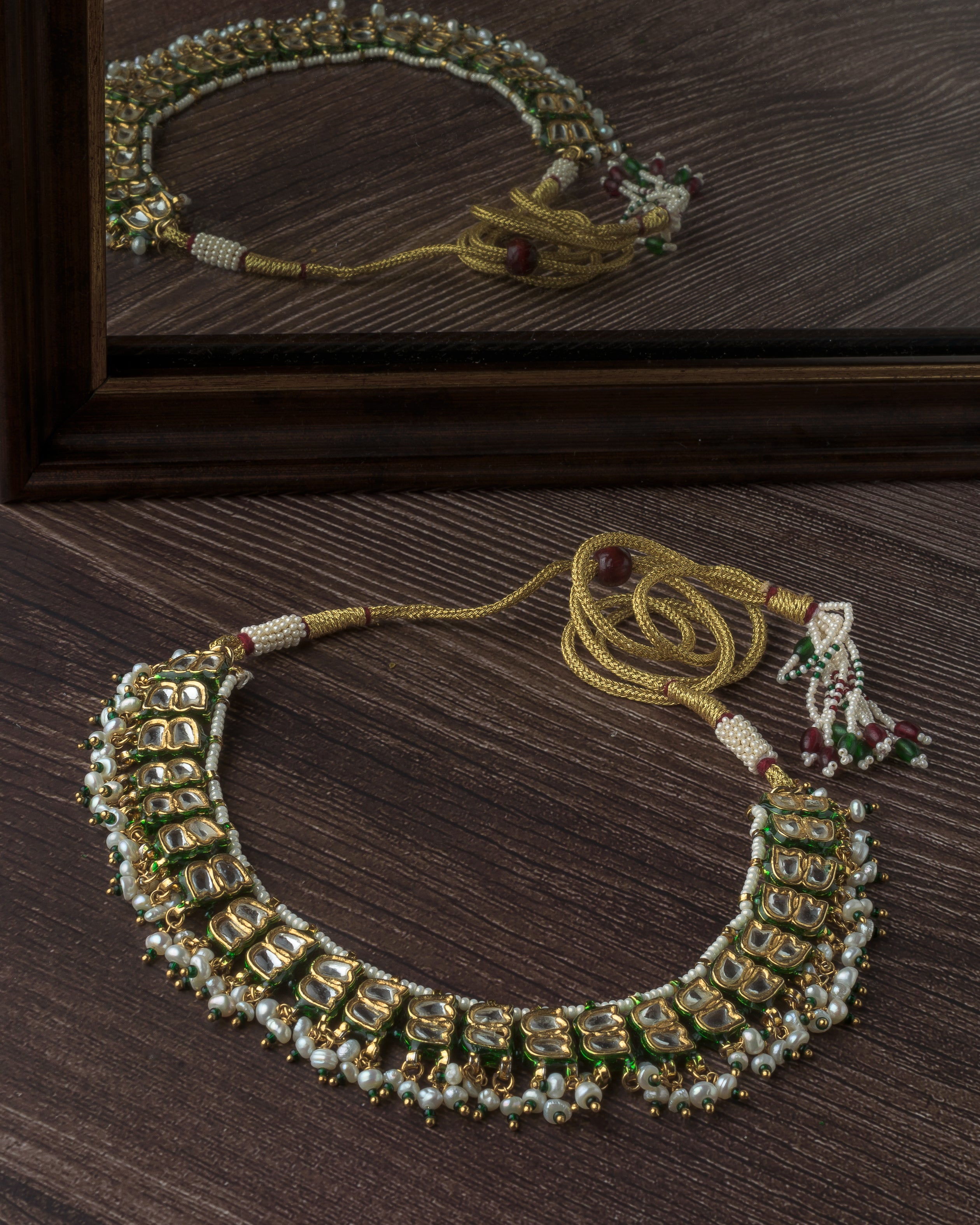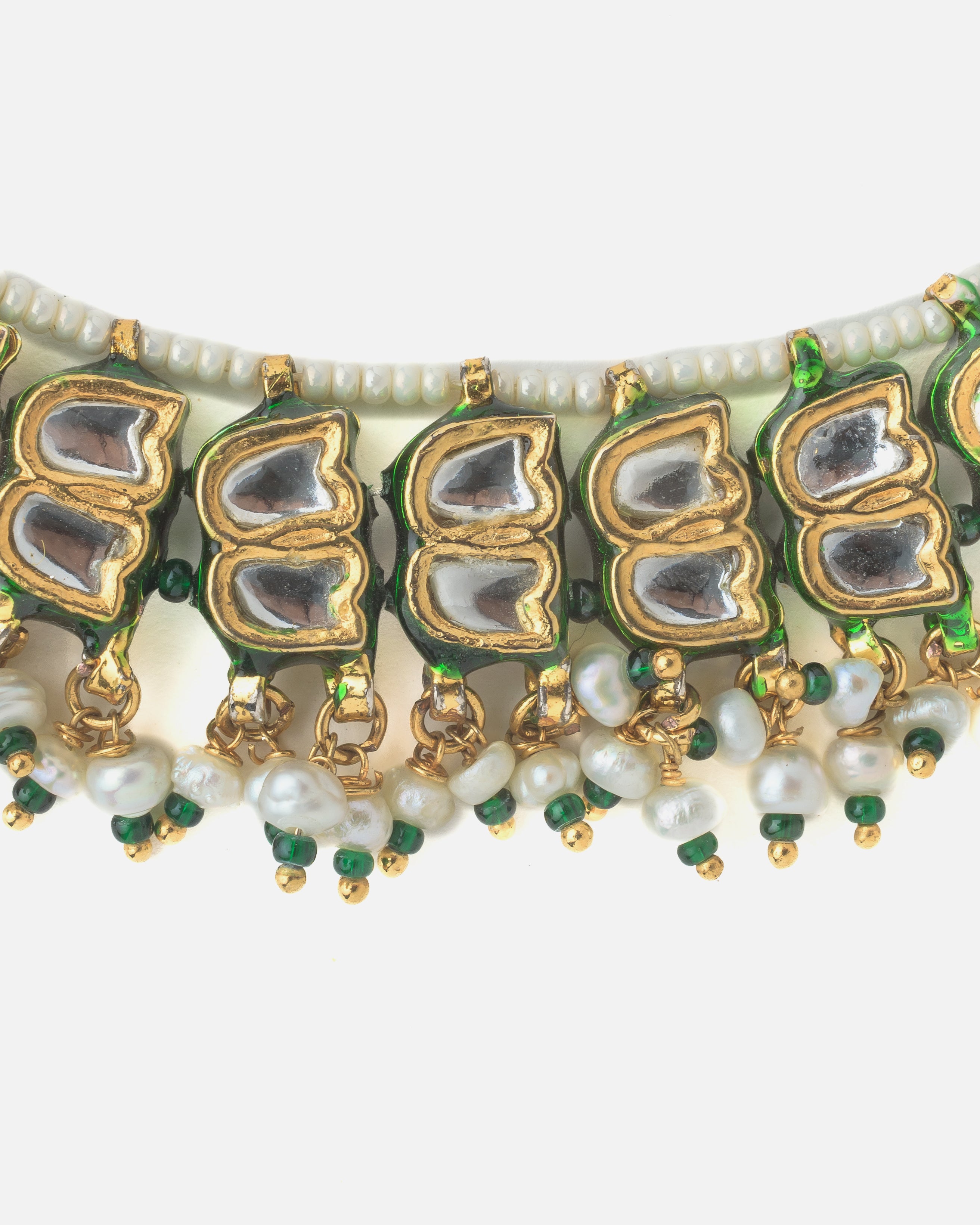 This exquisite handcrafted Kundan necklace features intricate teardrop motifs, enamel detailing, and pearl danglers. A perfect blend of elegance and tradition, ideal for weddings and festive occasions.