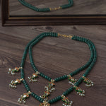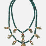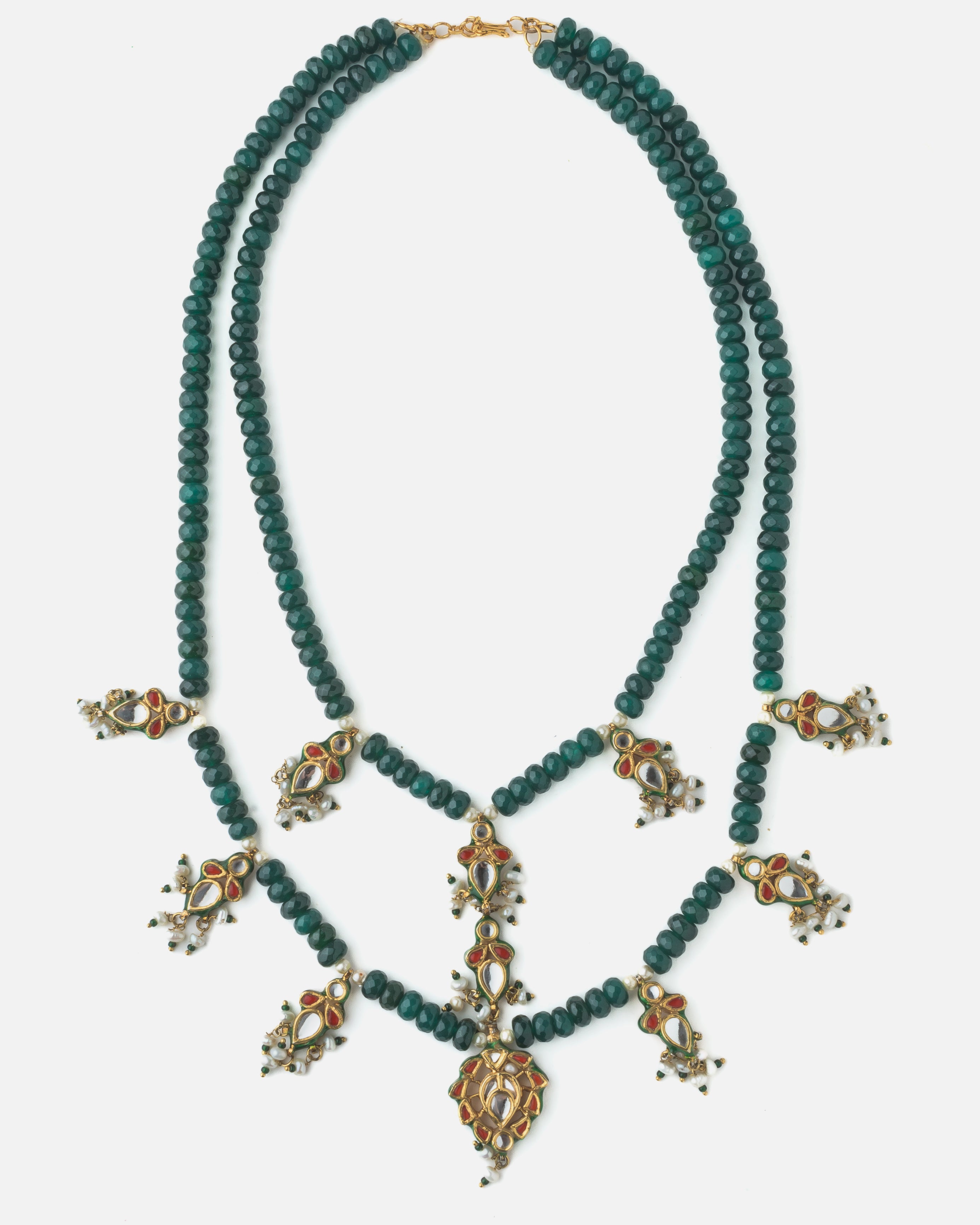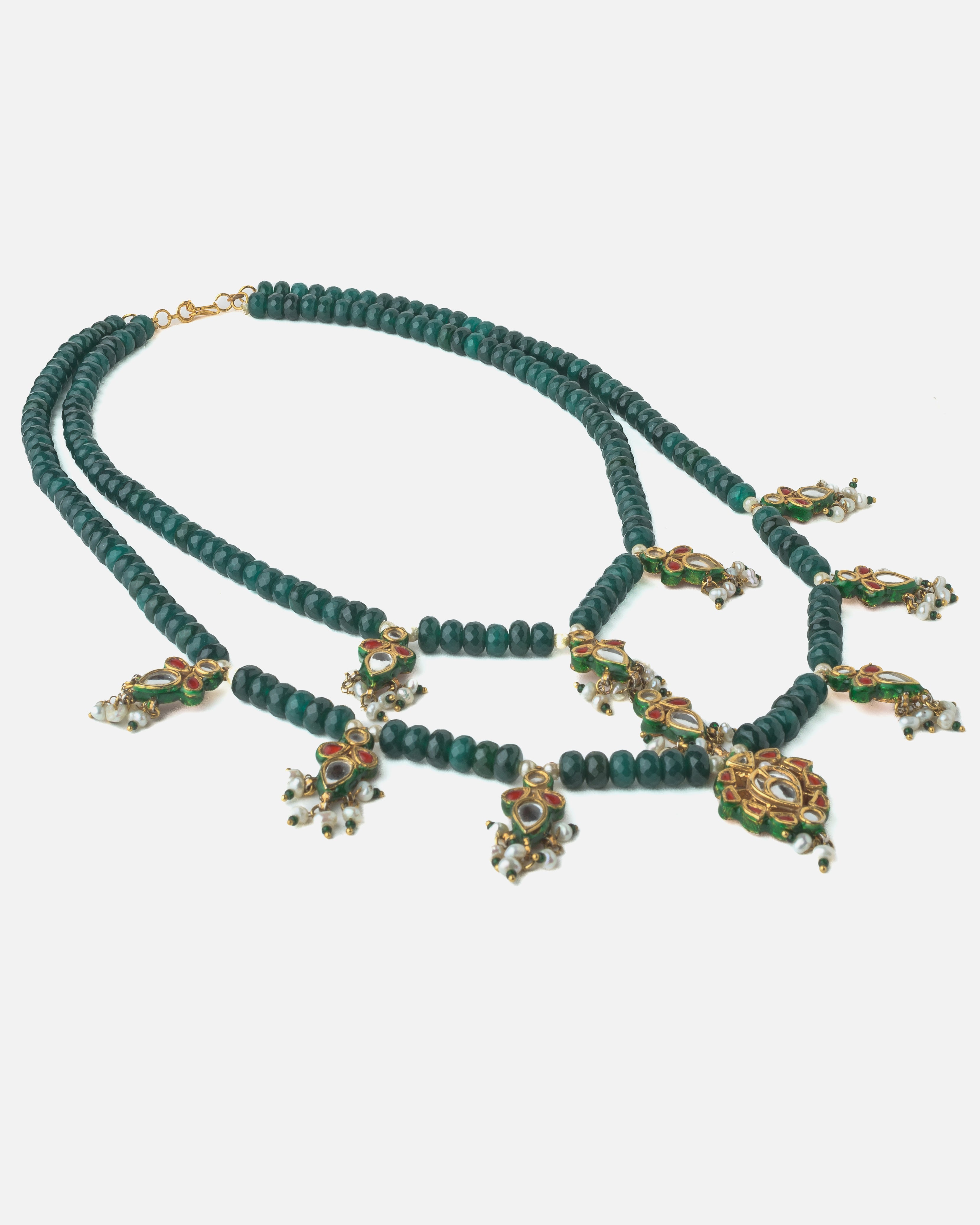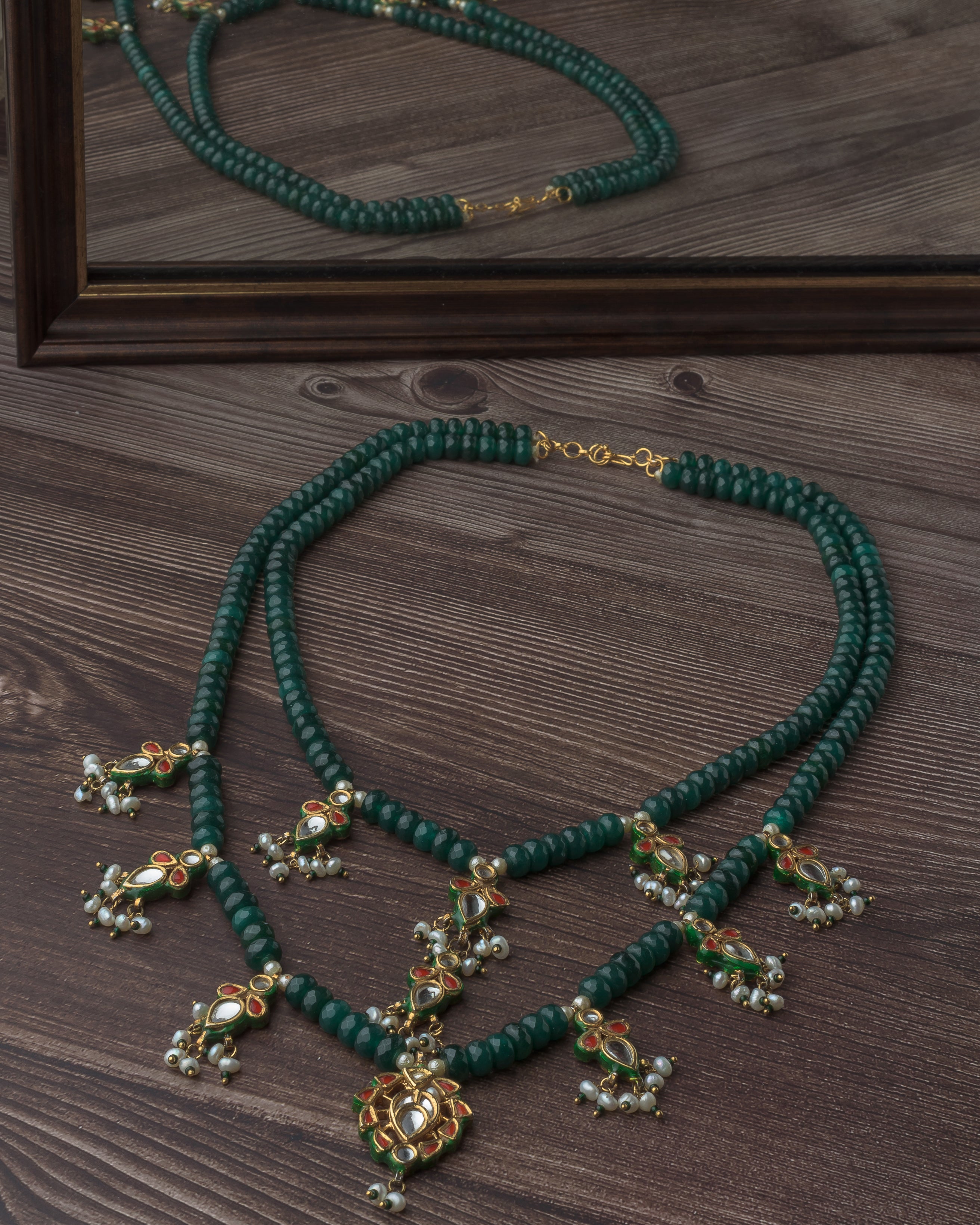 This elegant necklace features dual strands of rich green beads adorned with intricate Kundan and Meenakari pendants. The detailed motifs and classic design make it ideal for festive and traditional attire.