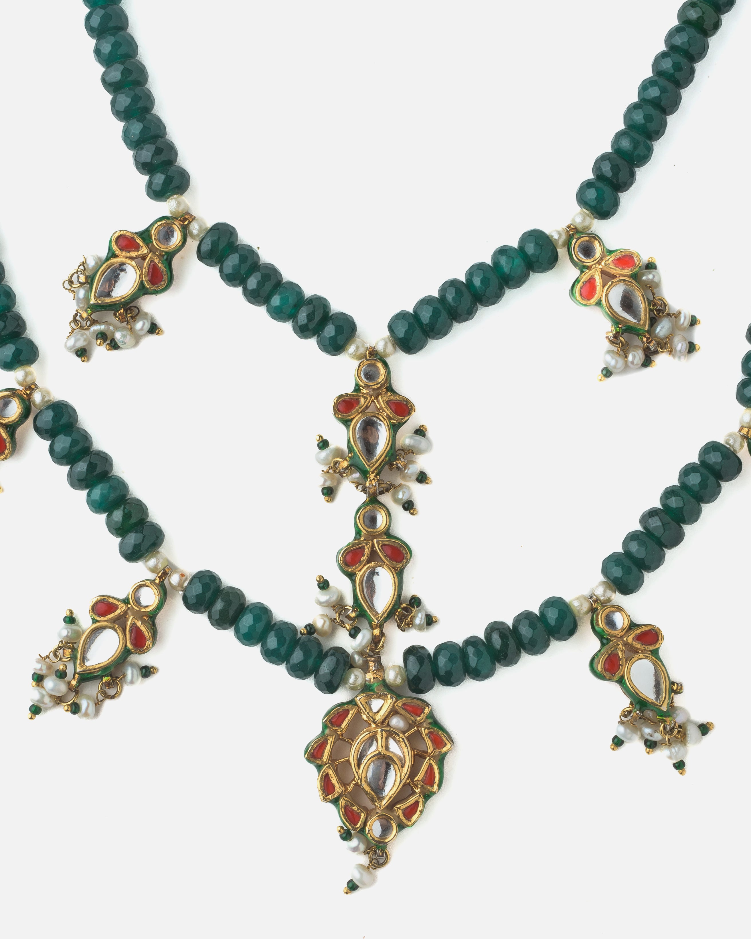- Material: Made with polished green beads, gold-plated metal, and traditional Kundan-Meenakari work.