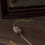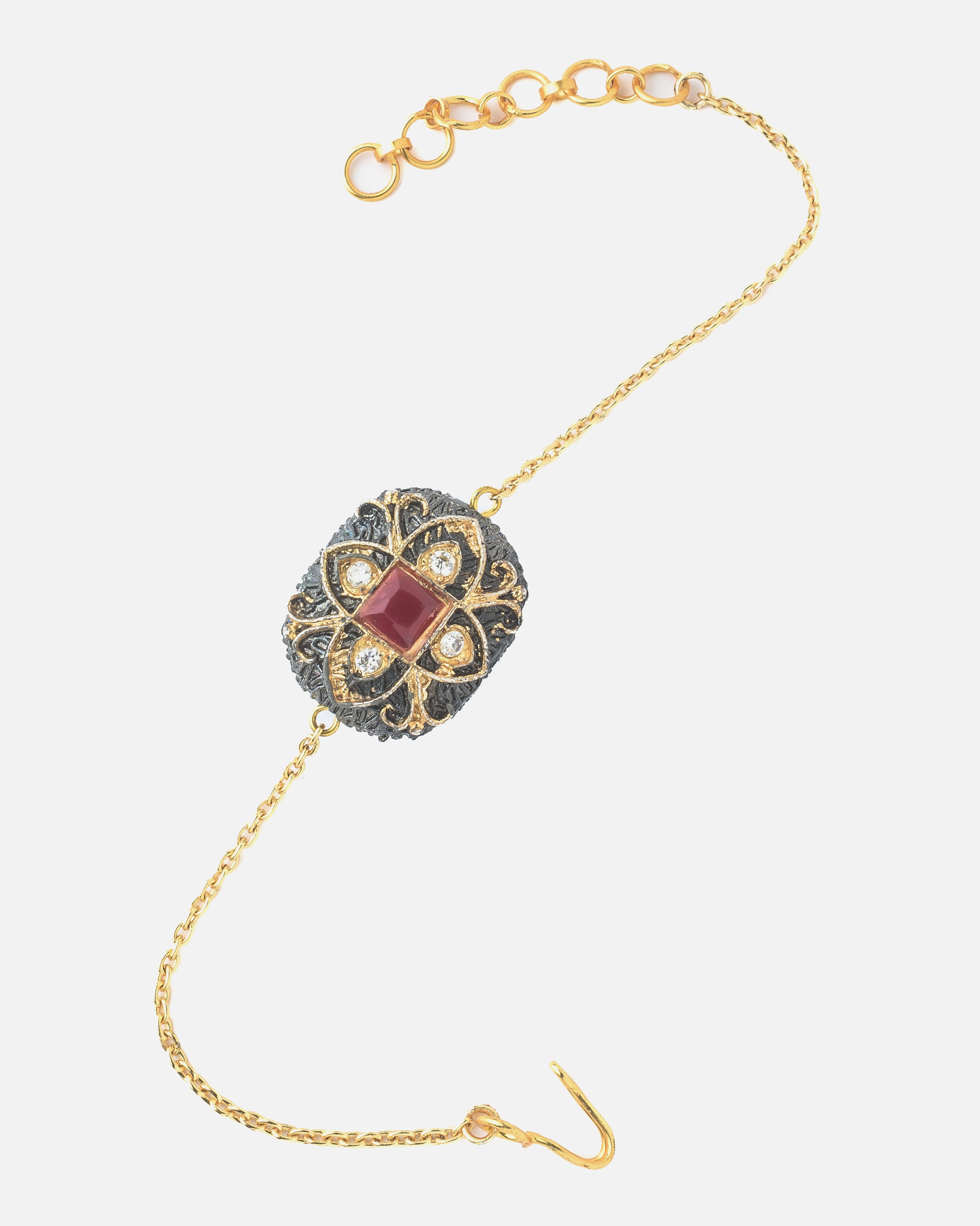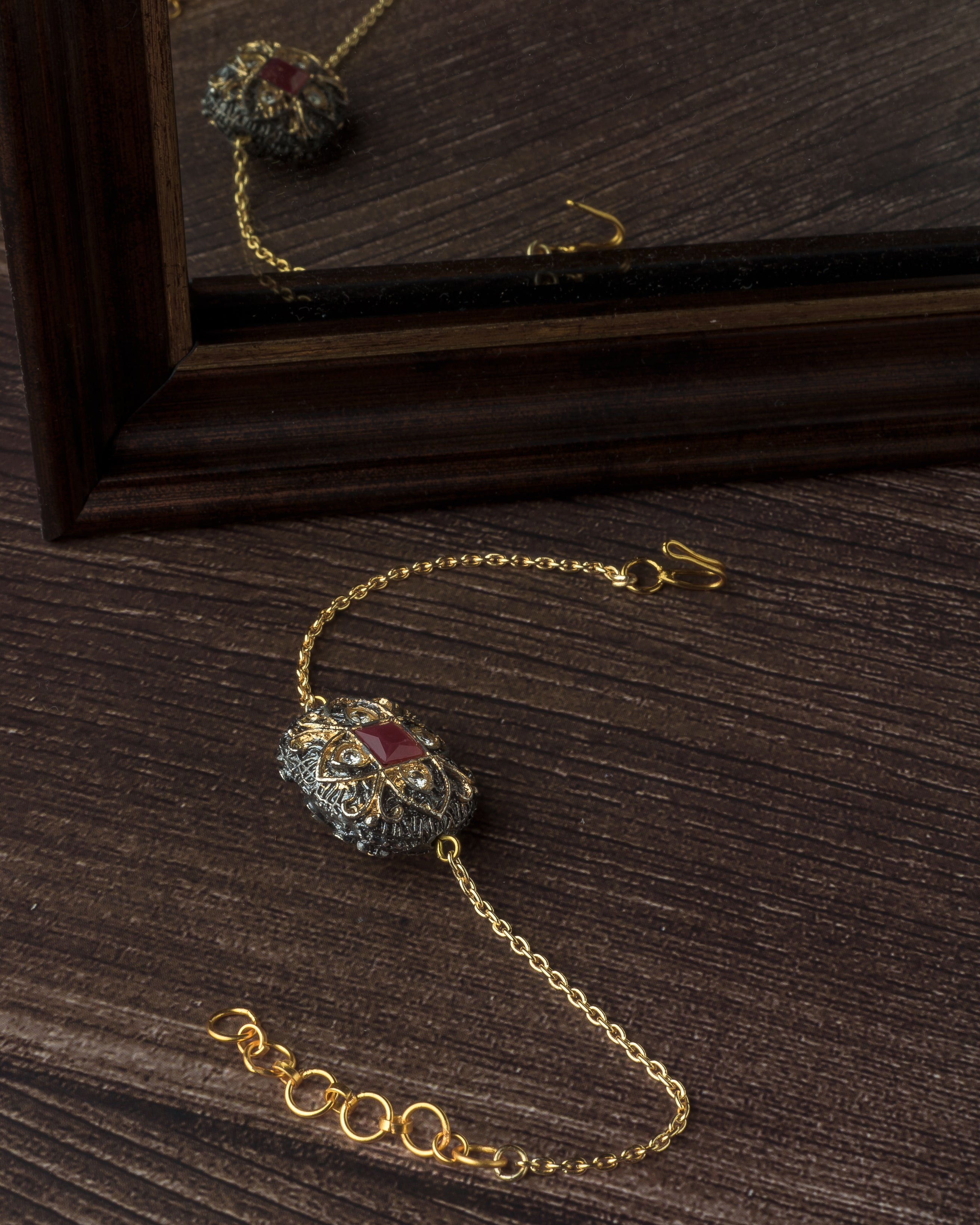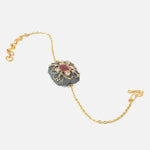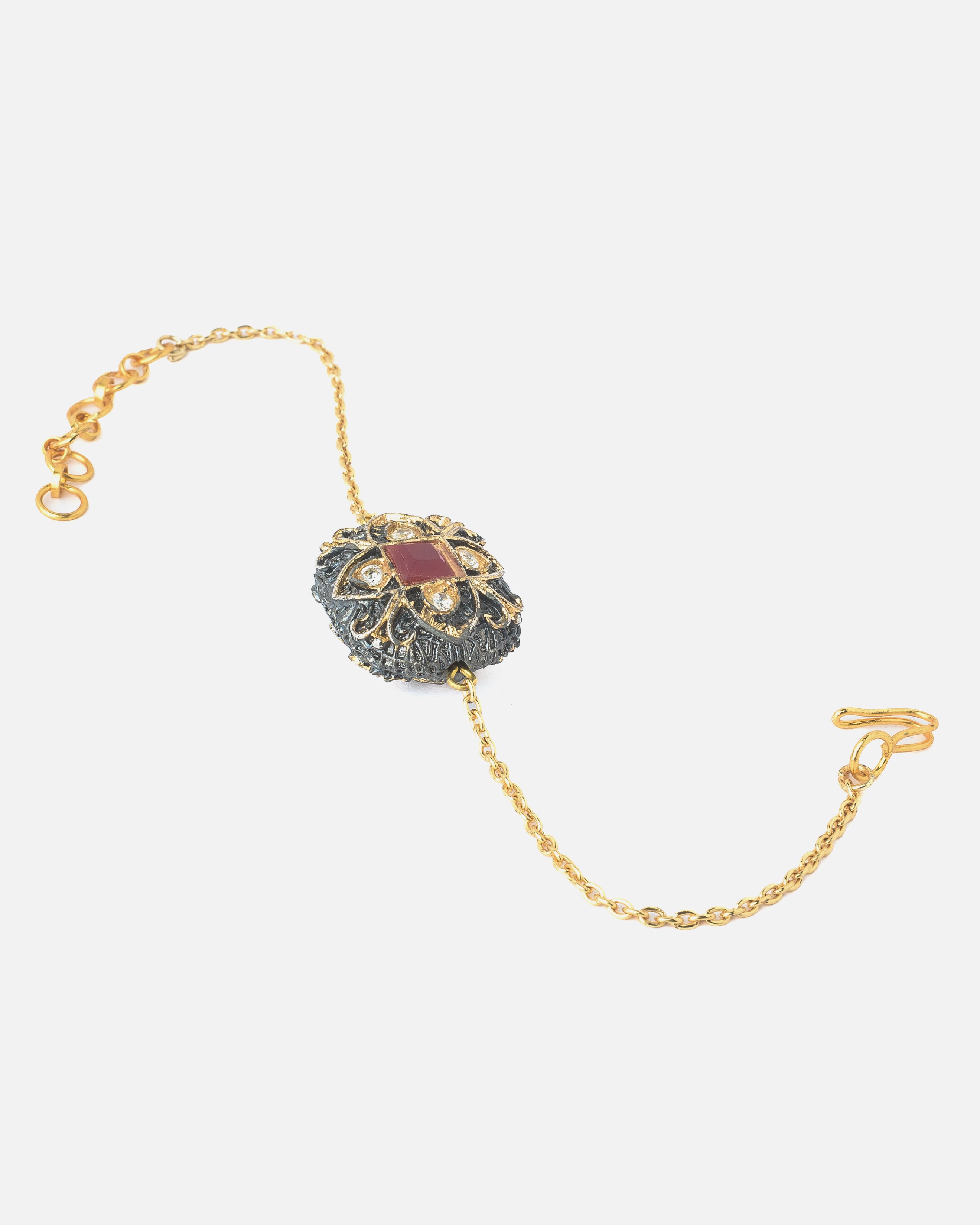 Elegant and timeless, this handcrafted bracelet features a vintage-style centerpiece with intricate detailing, a striking red stone, and delicate gold-toned chain—perfect for ethnic or festive wear.